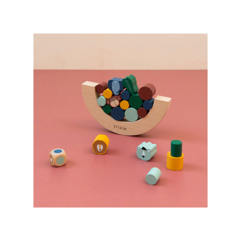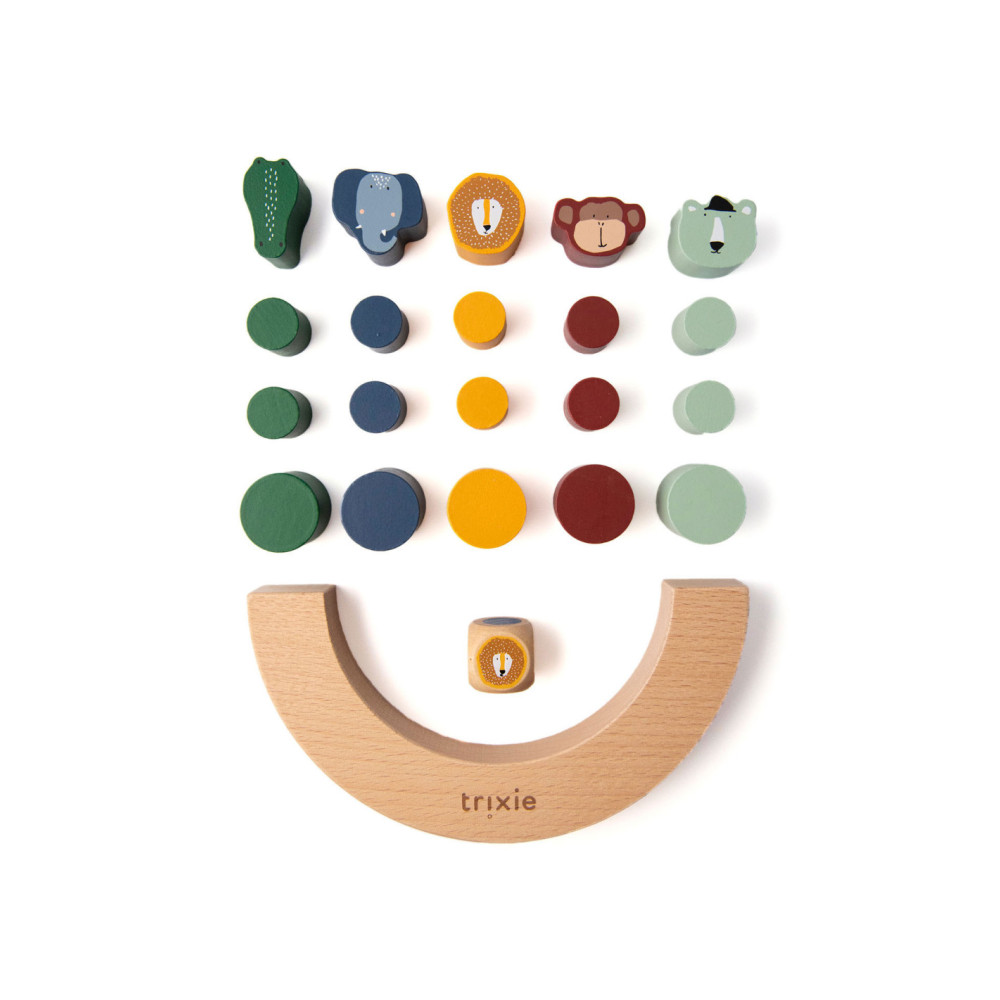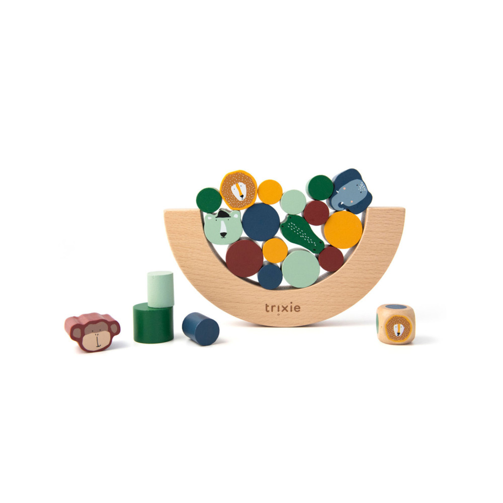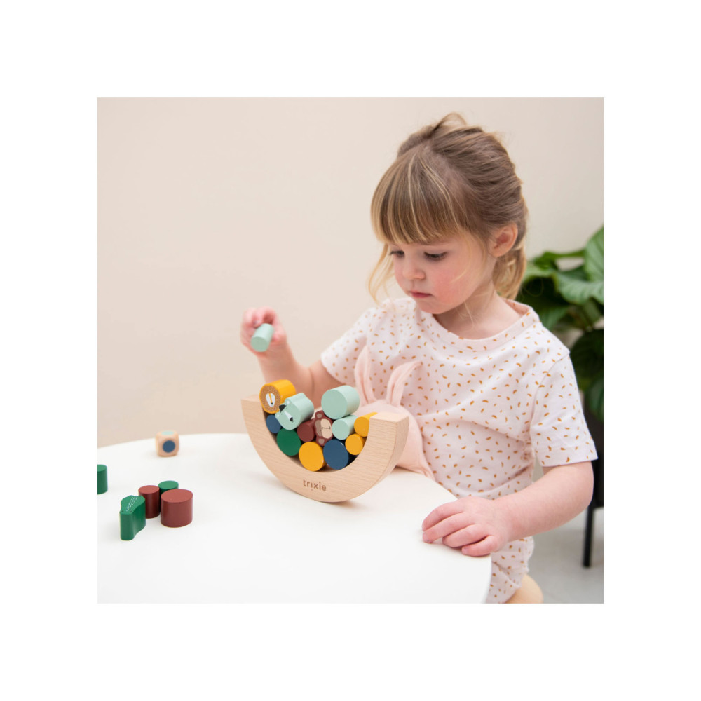 Gooi met de dobbelsteen en ontdek welk stukje jij moet toevoegen aan het evenwichtsspel! De dieren zijn extra uitdagend omdat ze gekke vormen hebben. Wie laat als eerste blokken vallen? Opwinding gegarandeerd als kinderen spelenderwijs hun fijne motoriek en ruimtelijk inzicht naar een hoger niveau tillen! Alle elementen zijn gemaakt van 100% FSC © gecertificeerd hout. Alle verven zijn op waterbasis en veilig voor baby's.