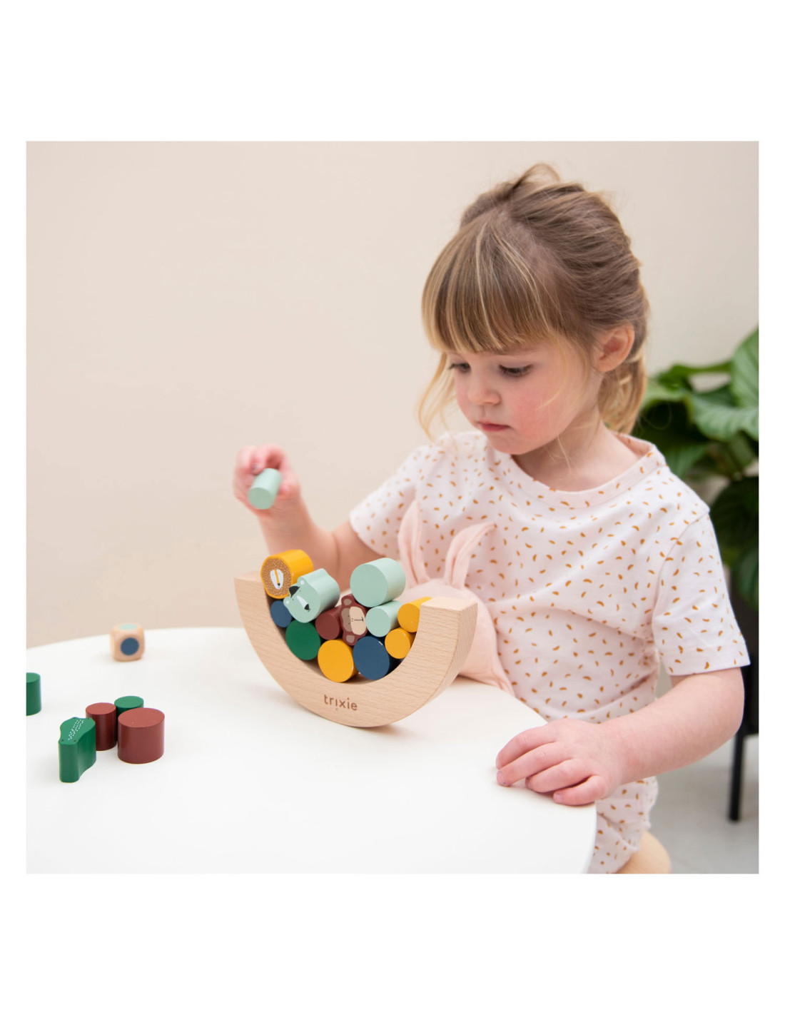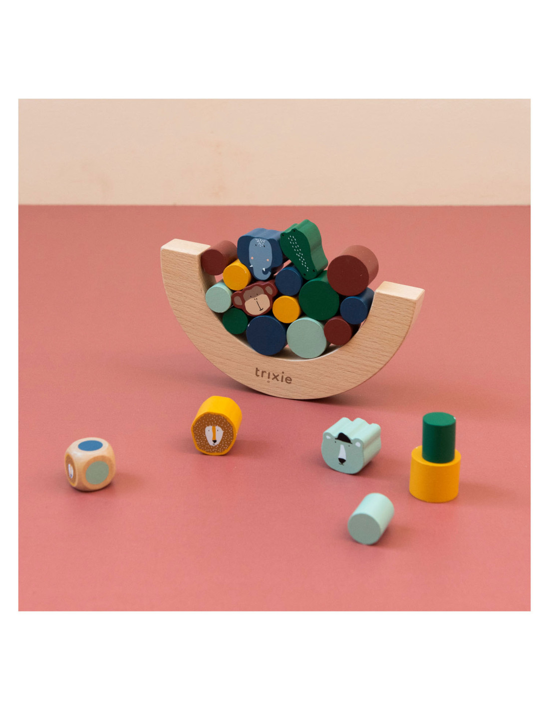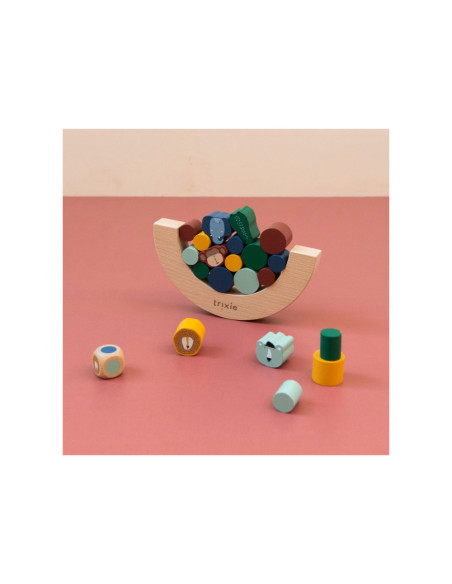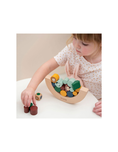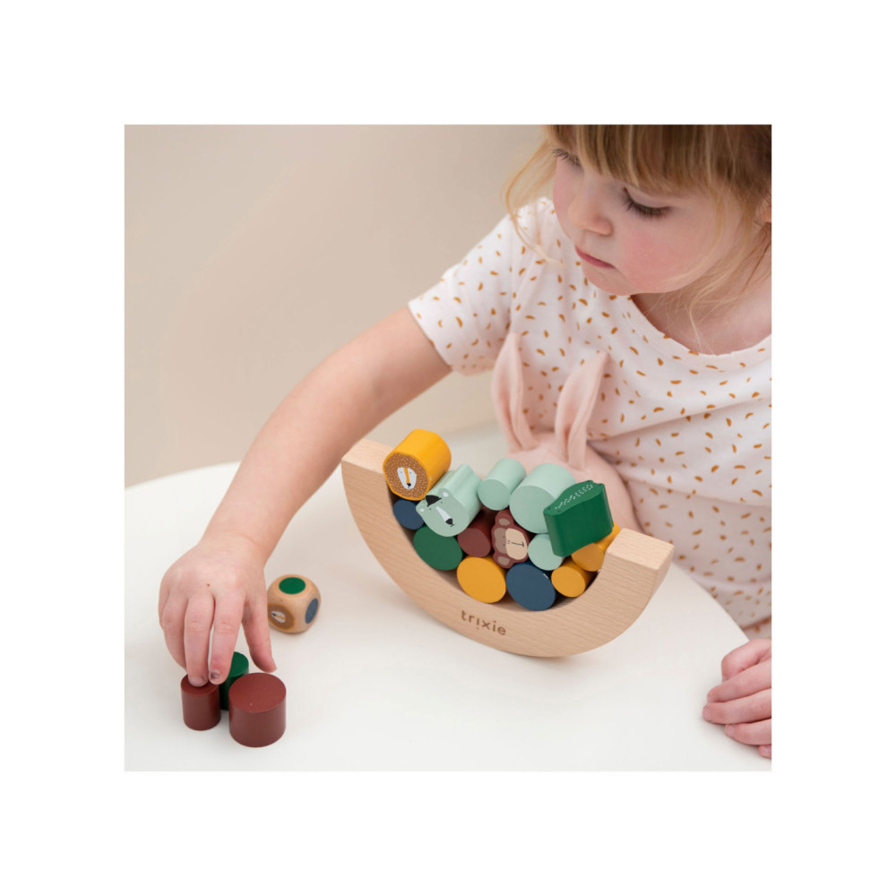 Gooi met de dobbelsteen en ontdek welk stukje jij moet toevoegen aan het evenwichtsspel! De dieren zijn extra uitdagend omdat ze gekke vormen hebben. Wie laat als eerste blokken vallen? Opwinding gegarandeerd als kinderen spelenderwijs hun fijne motoriek en ruimtelijk inzicht naar een hoger niveau tillen! Alle elementen zijn gemaakt van 100% FSC © gecertificeerd hout. Alle verven zijn op waterbasis en veilig voor baby's.