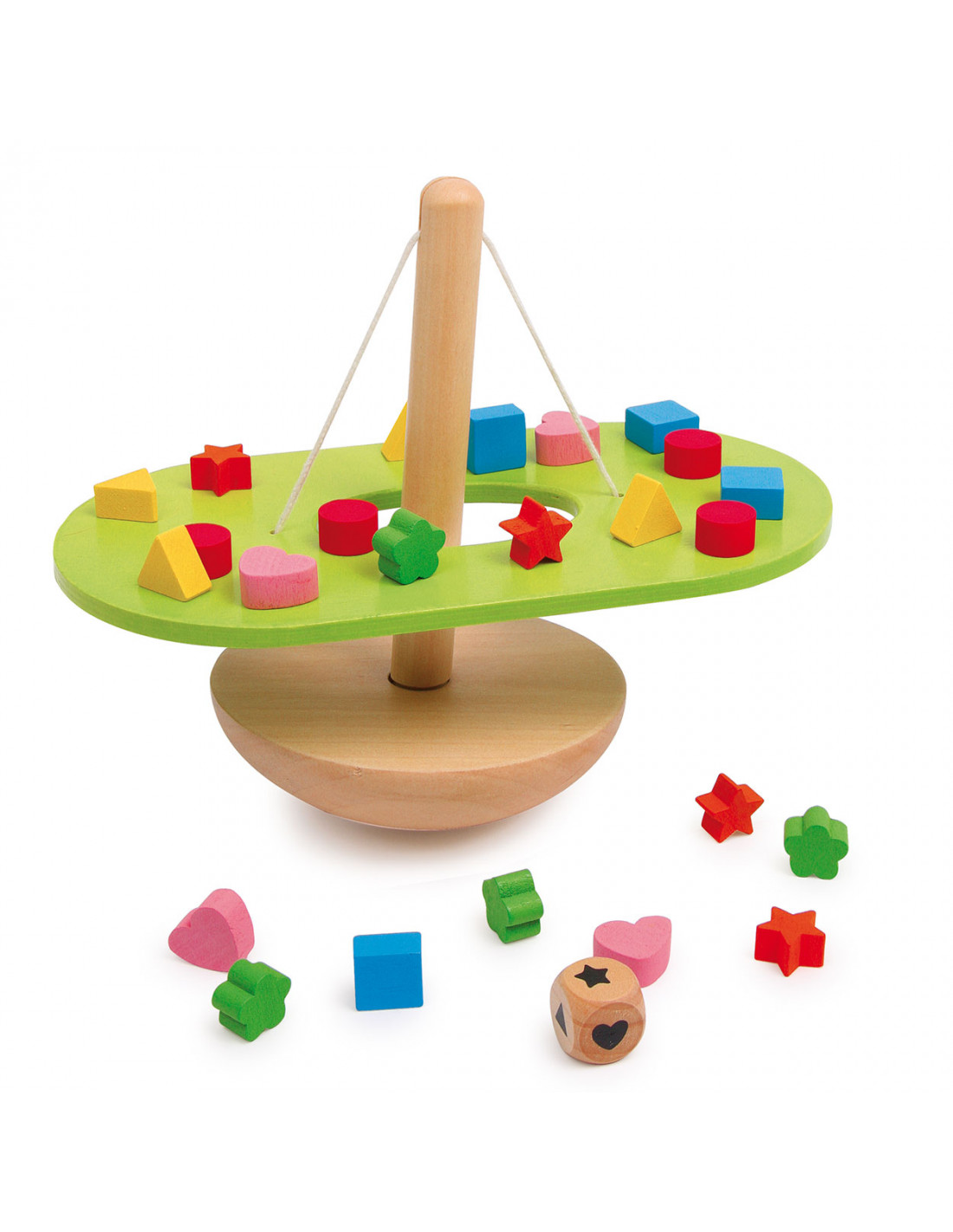Een spannend balanceerspel voor meerdere personen. Het doel van het spel is om de vooraf met de dobbelsteen gegooide vormen zo op de wip te plaatsen dat de wip in evenwicht blijft en de speelstenen blijven staan.
