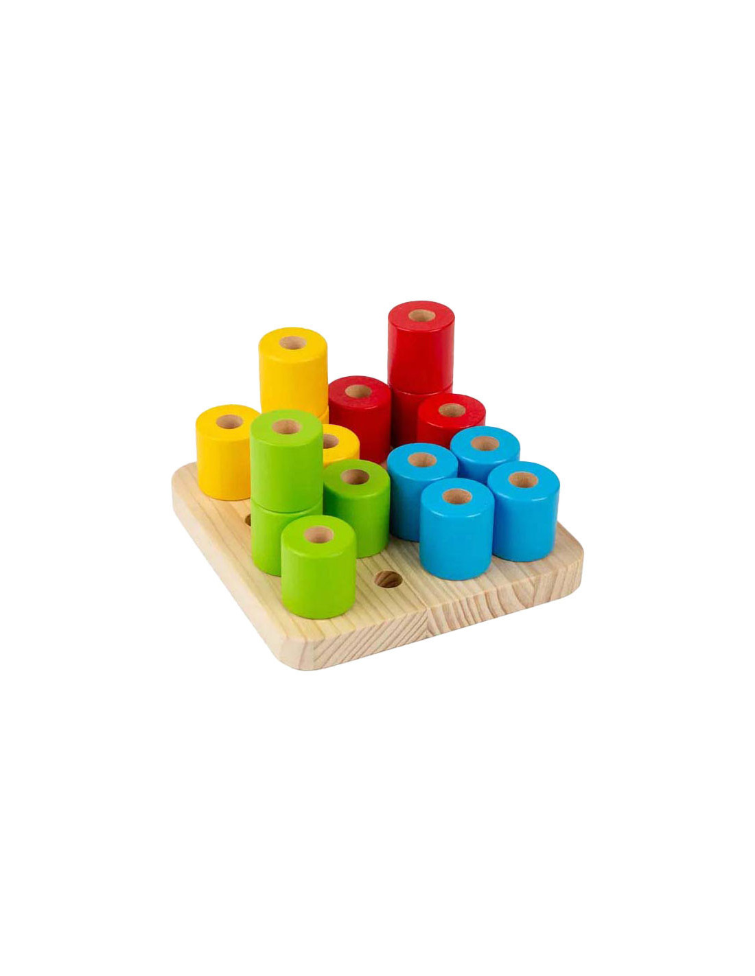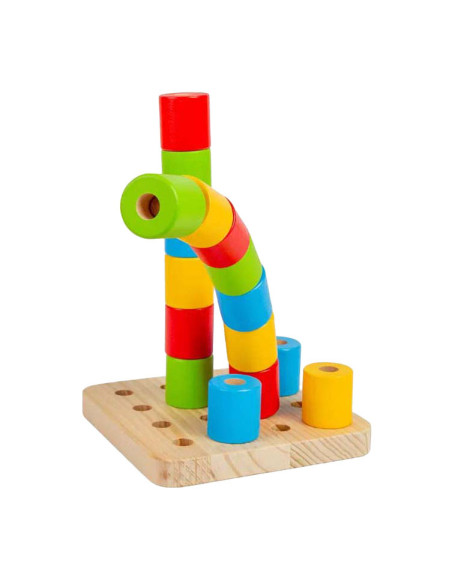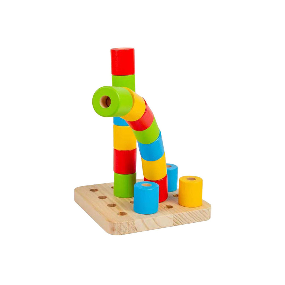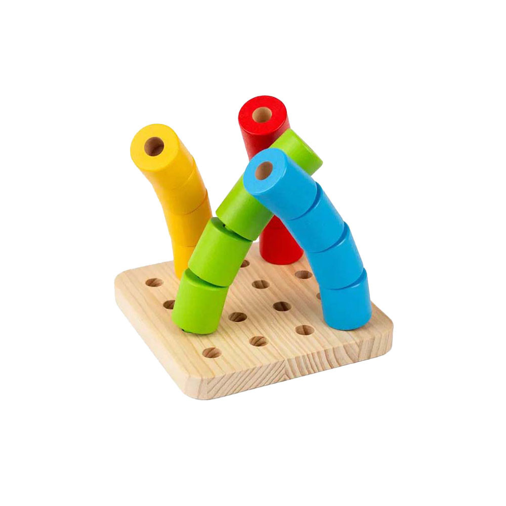 Stapelen, wiebelen en rollen! Ons wiebelige prikbord is een heerlijk wiebelend stapelspeelgoed voor baby's, peuters en jonge kinderen. De set bestaat uit 16 felgekleurde buizen met pinnen erin die op de houten basis gestapeld kunnen worden om wiebelige-wiebelige torens te creëren.