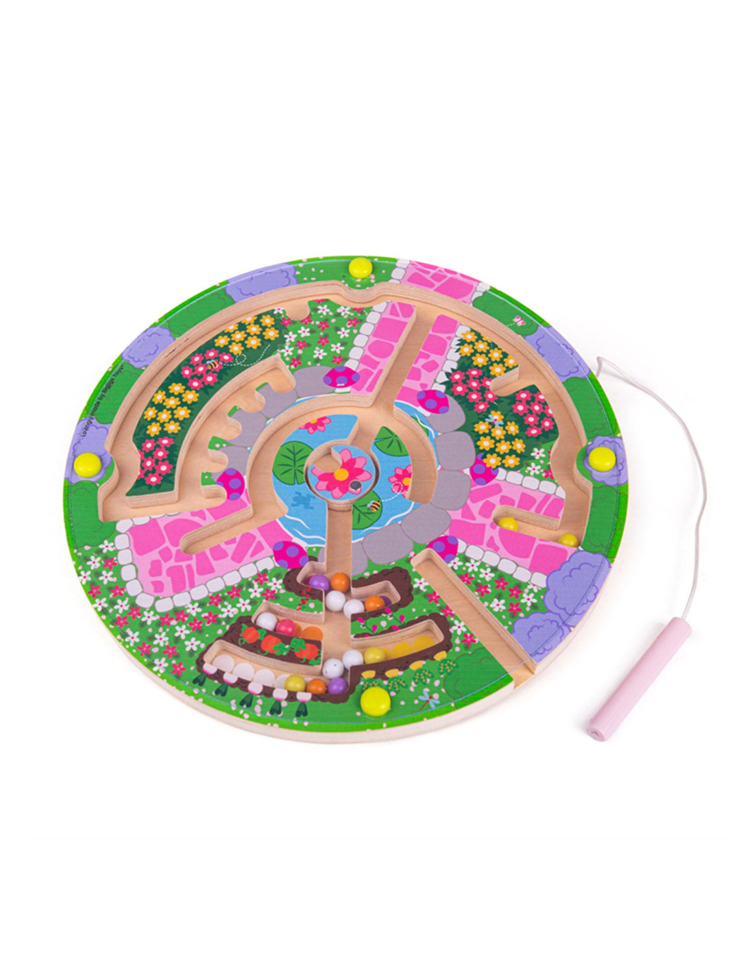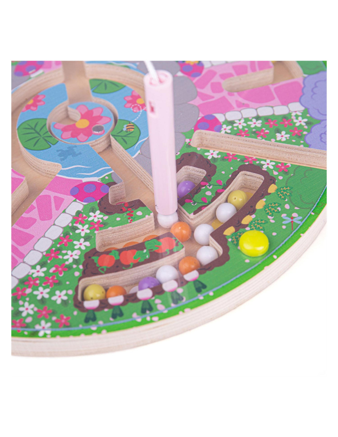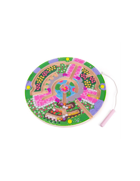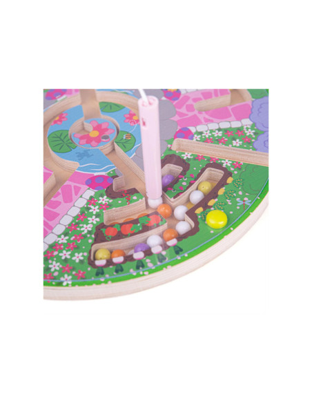 Magnetisch doolhofspel waarbij je balletjes over door de bloementuin moet leiden. Door de balletjes door het doolhof te bewegen, train je je fijne motoriek en hand-oogcoördinatie. Het spel is gemaakt van hoge kwaliteit hout en bewerkt met niet-giftige verf en lak. Geschikt voor kinderen vanaf 3 jaar oud. Afmetingen: 22,5 x 22,5 centimeter.