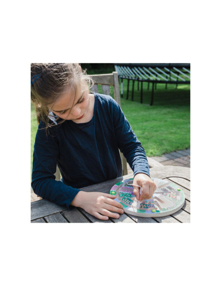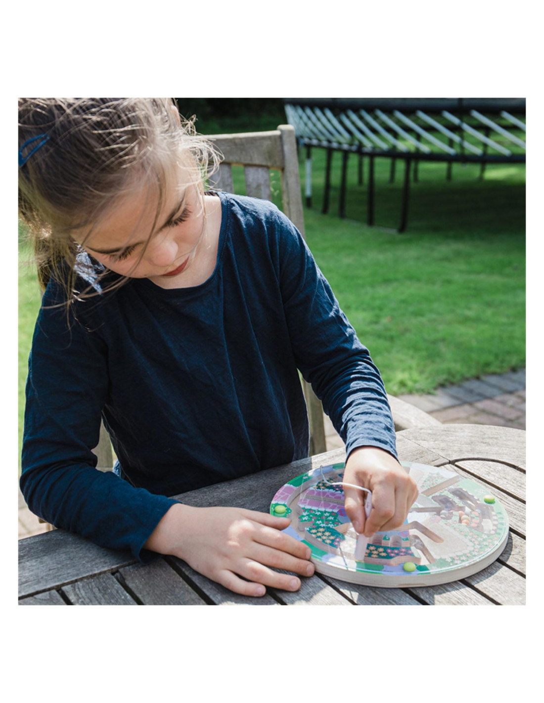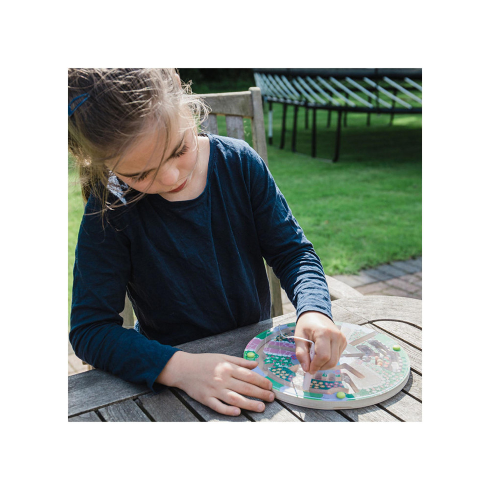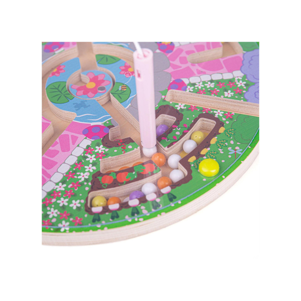 Magnetisch doolhofspel waarbij je balletjes over door de bloementuin moet leiden. Door de balletjes door het doolhof te bewegen, train je je fijne motoriek en hand-oogcoördinatie. Het spel is gemaakt van hoge kwaliteit hout en bewerkt met niet-giftige verf en lak. Geschikt voor kinderen vanaf 3 jaar oud. Afmetingen: 22,5 x 22,5 centimeter.