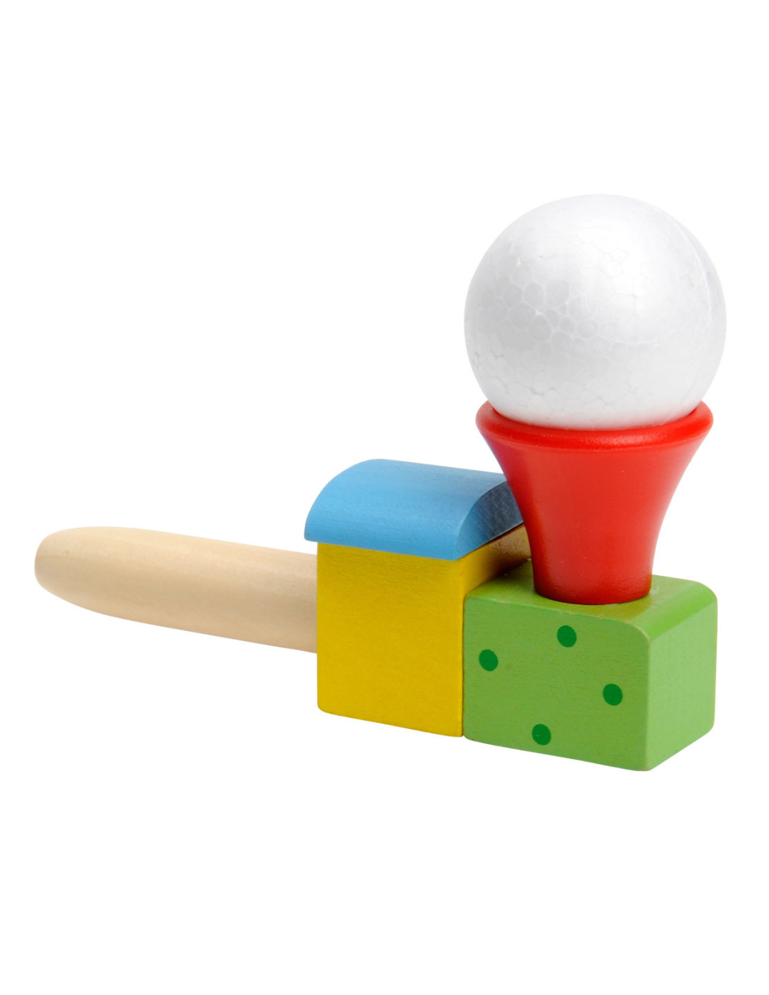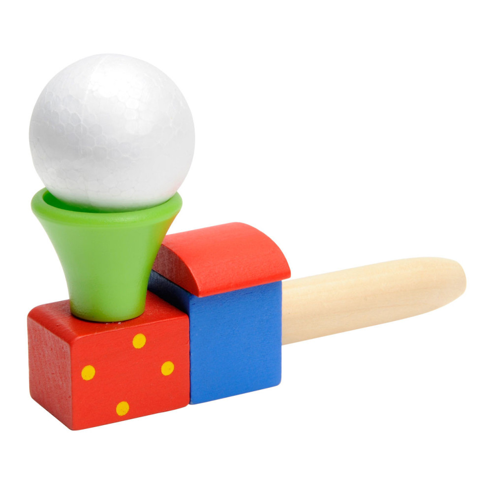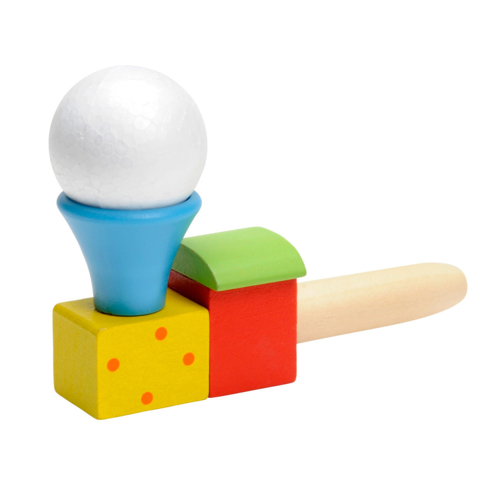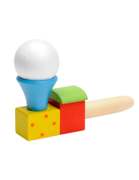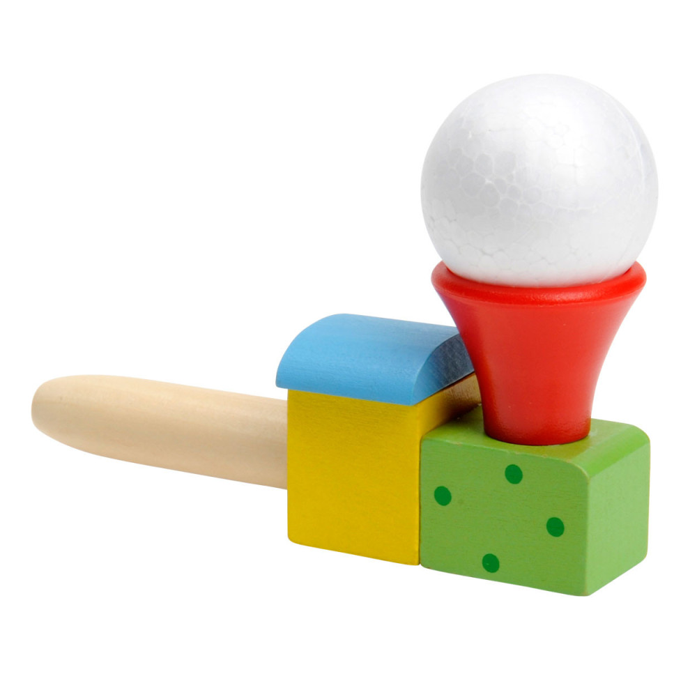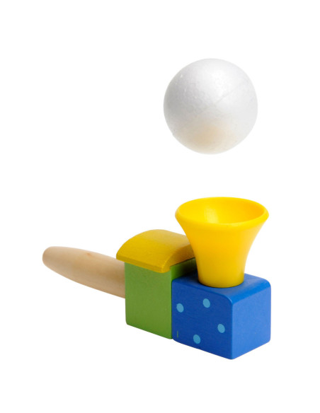 Blaas op het houten treintje en houd het balletje zwevend in de lucht. Verschillende uitvoeringen van dit blaasspel worden door elkaar geleverd.