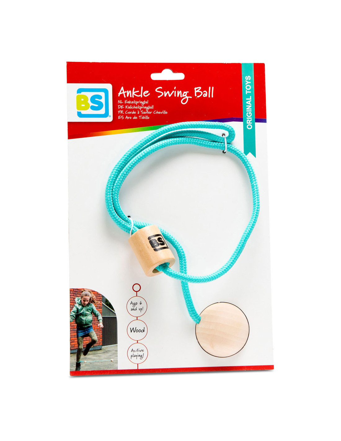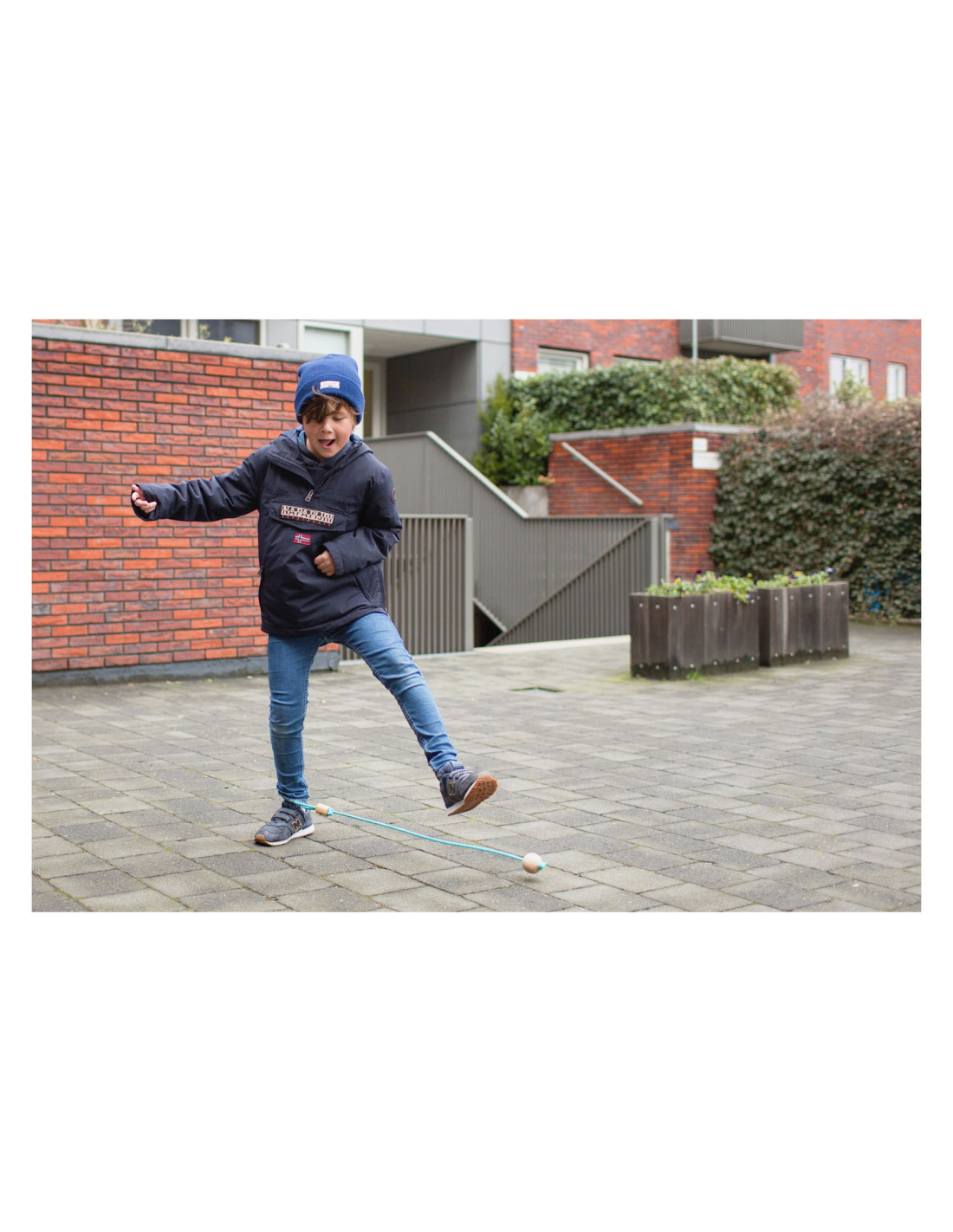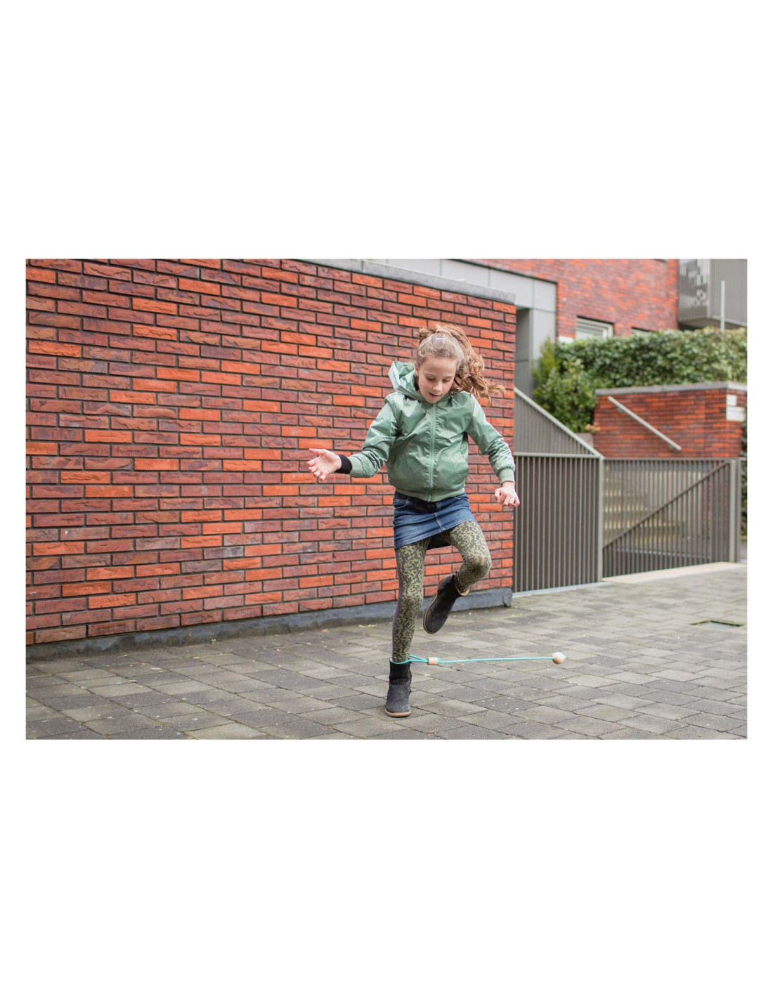 Retro spel in een stijlvol jasje; doe je voet door de lus en slinger de bal in de rondte. Hoelang kun jij dansen en springen zonder het touw te raken?