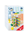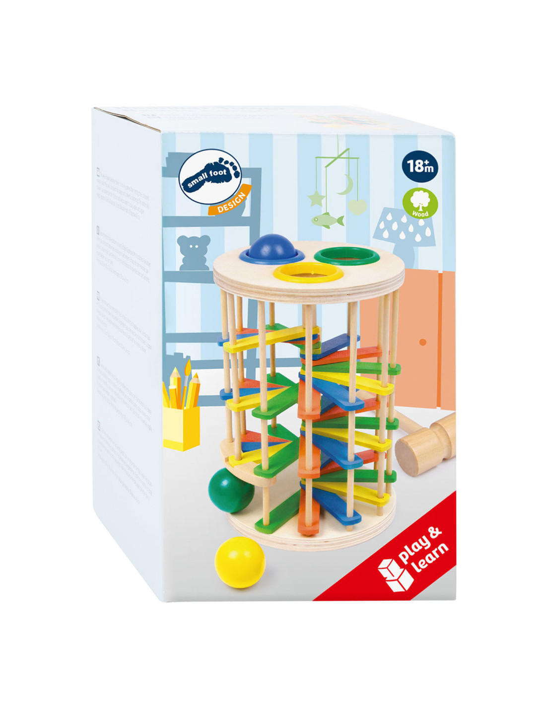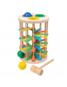 Deze fraai gevormde houten toren is een vrolijk klopspel! Een nieuwe variant op het klassieke hamerbank spel. Met vrolijk klikklakken lopen de 3 gelakte houten kogels na een klap met de hamer de kleurige treden af!