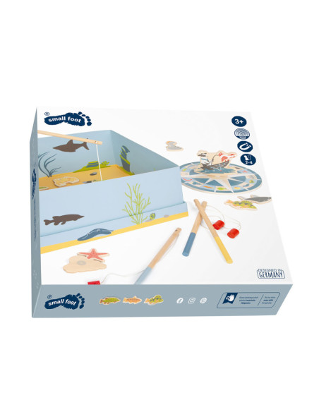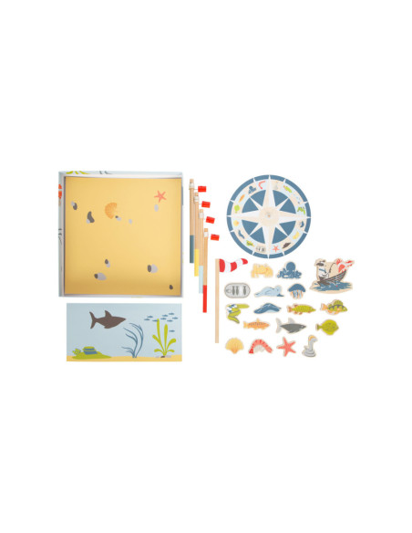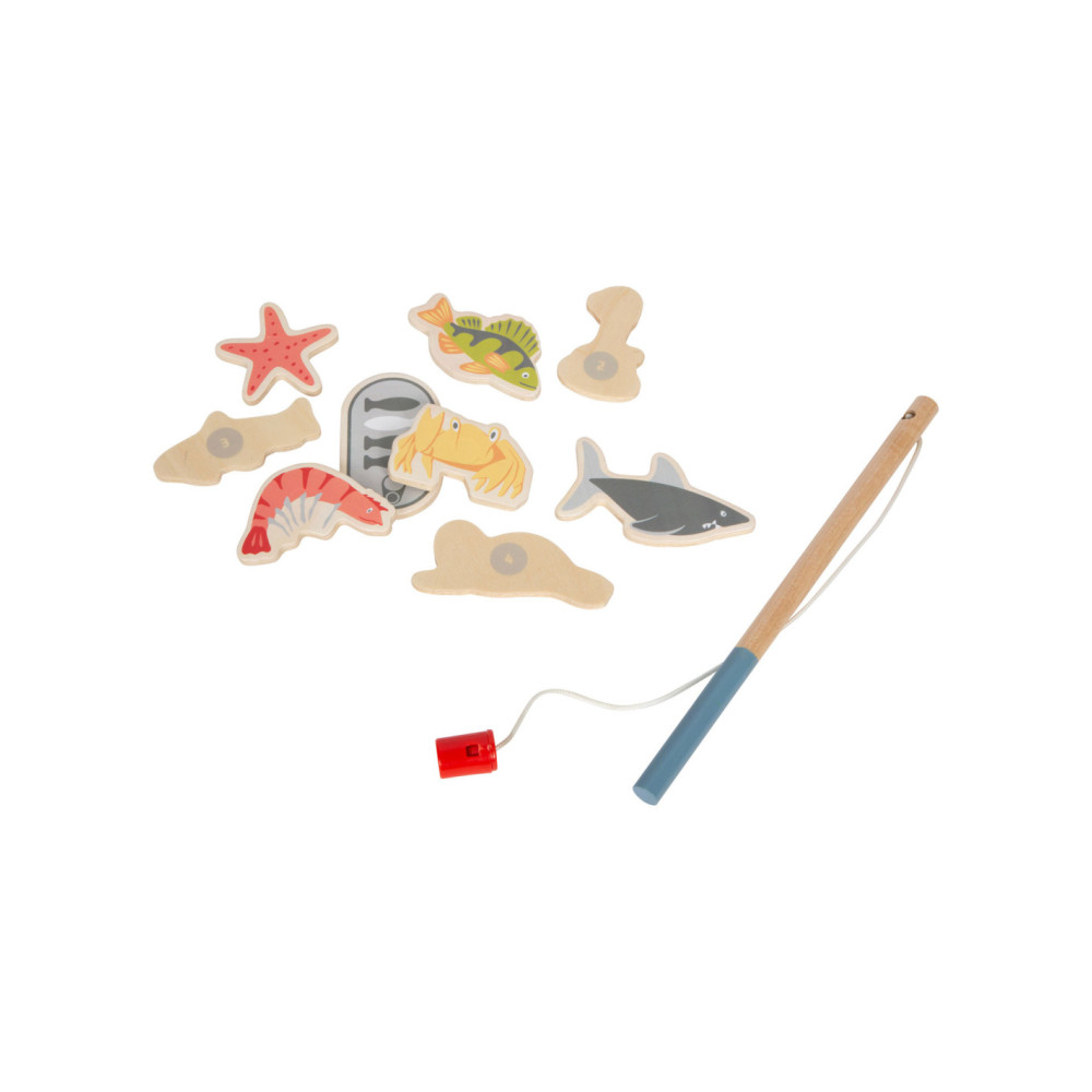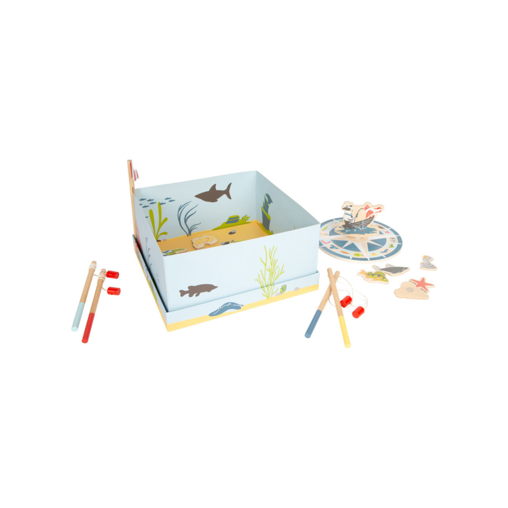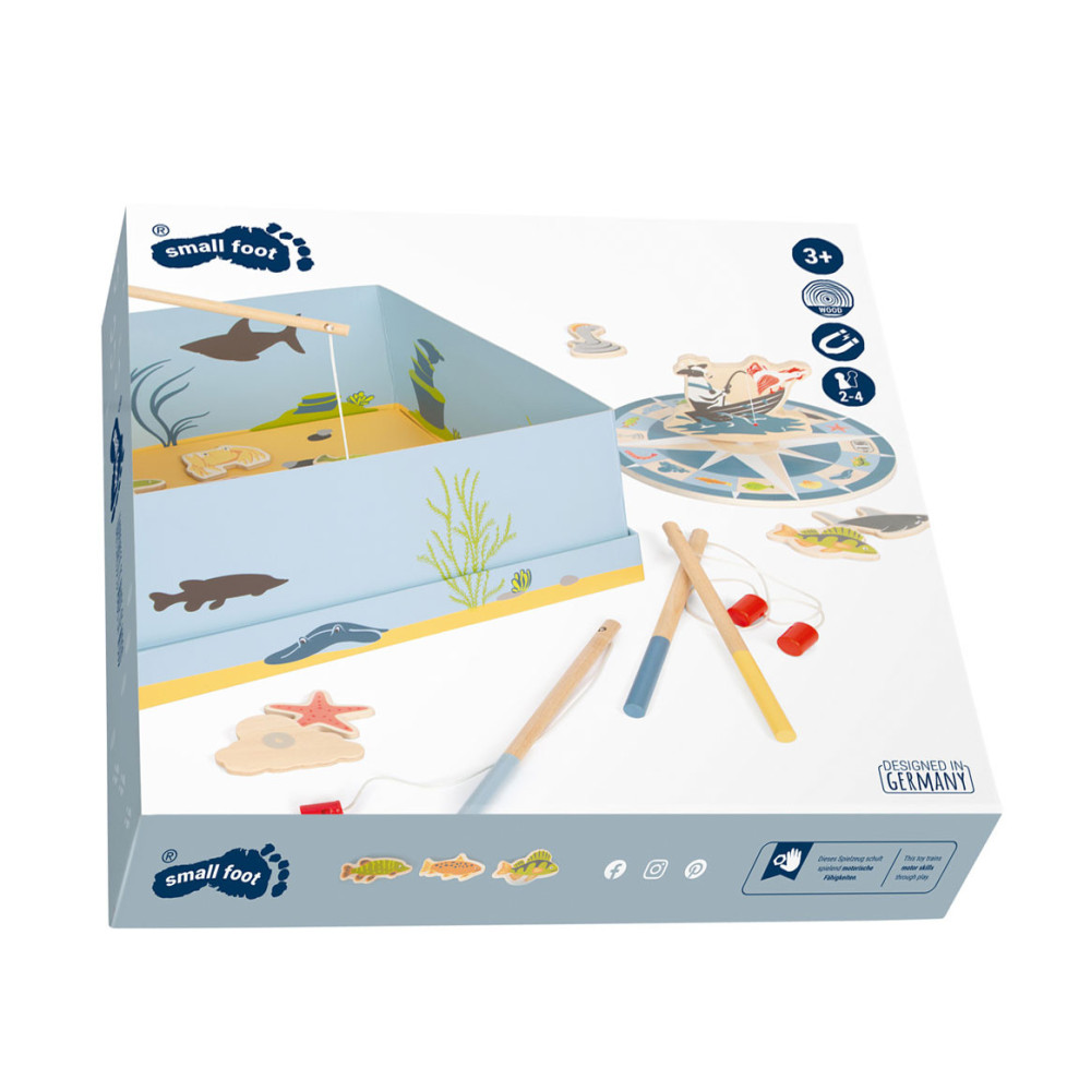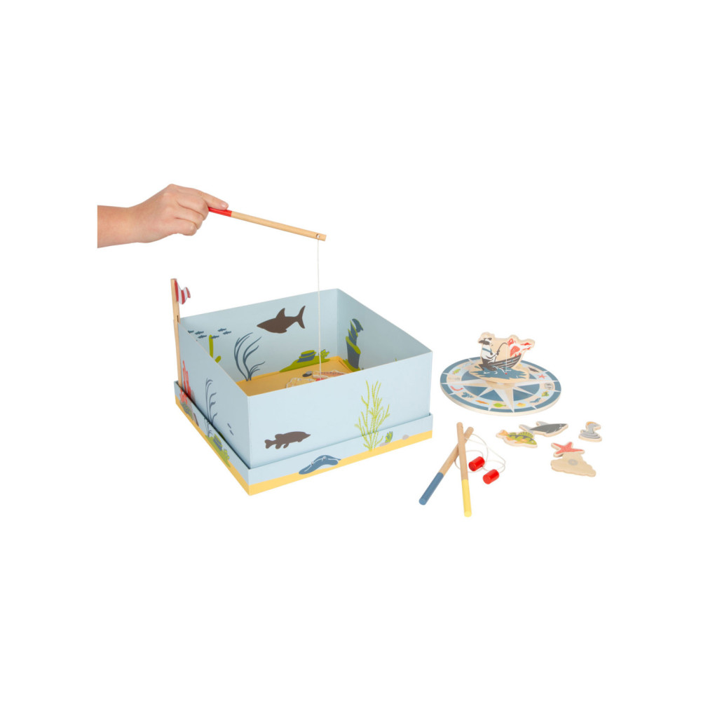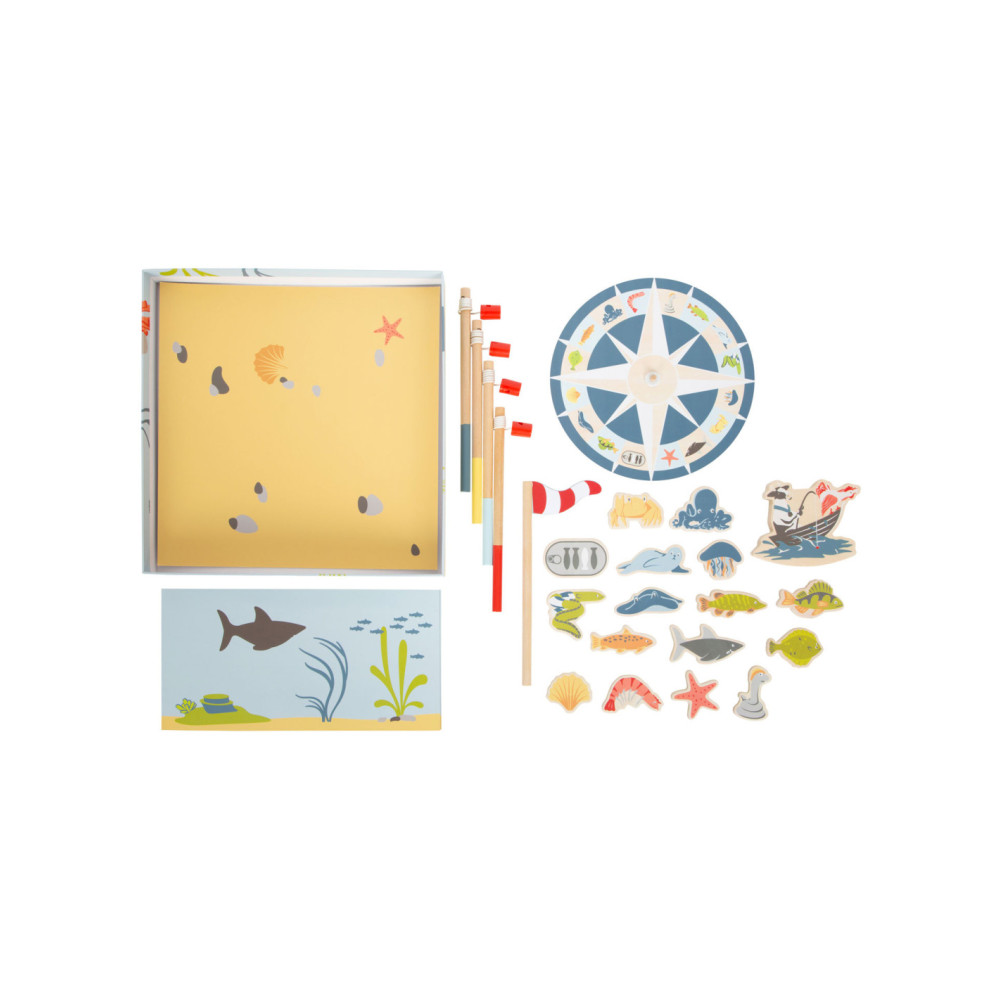Ga vissen met een paar wilde vrienden! Bij dit klassieke houten kinderspel heb je vaardigheid en geduld nodig om met de houten hengel de juiste zeedieren uit hun zee te vissen. De haan houdt een oogje in het zeil voor de volgende te vangen vis, terwijl de koe vist. Door de boot op het kompas te laten draaien, wordt aangegeven welk zeedier als volgende moet worden gevangen. En dat is praktisch: de bodemflap van de hoogwaardige speeldoos vormt samen met extra wanden een driedimensionaal speelveld. Speelbaar in twee variaties. Groot plezier voor kleine visliefhebbers, samen met vrienden of alleen, en een geweldige kans om de bewoners van de Noordzee, de Oostzee en de Europese binnenwateren te leren kennen. Zodra de juiste vis is gevangen, wordt deze in de visvoorraad van de speler gestopt. Als de verkeerde vis wordt gevangen, moet hij terug in het water worden gegooid. Wordt geleverd met hoogwaardige speldoos voor opslag.