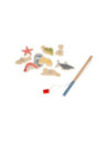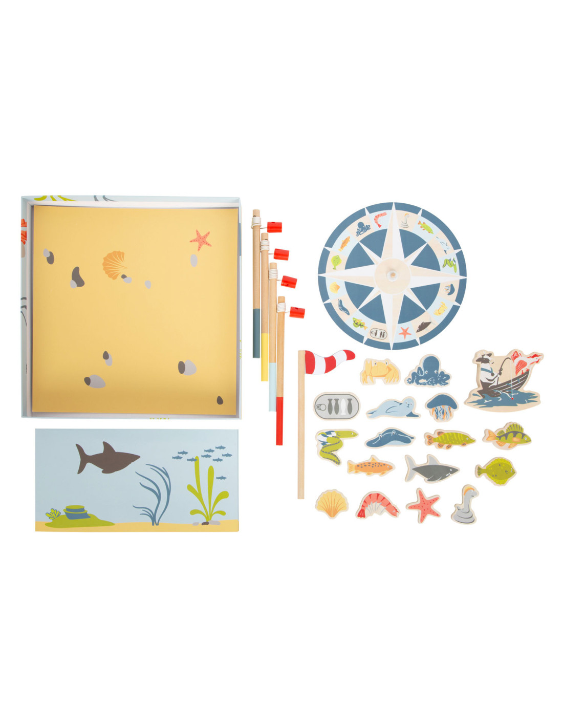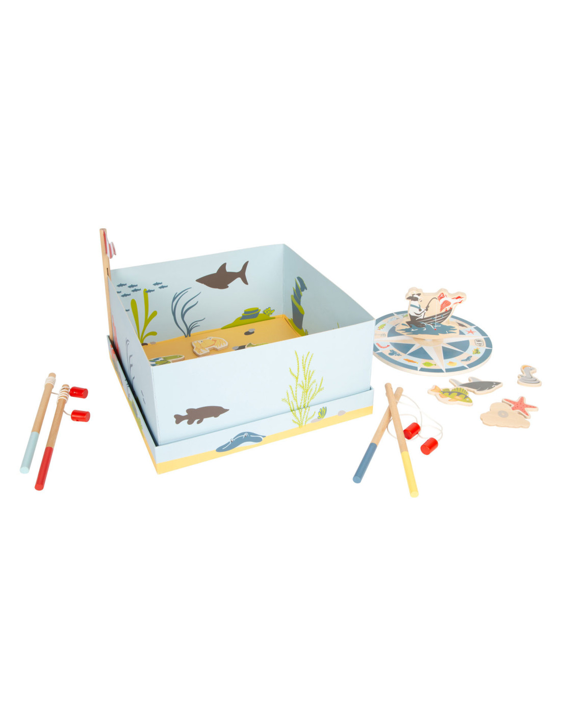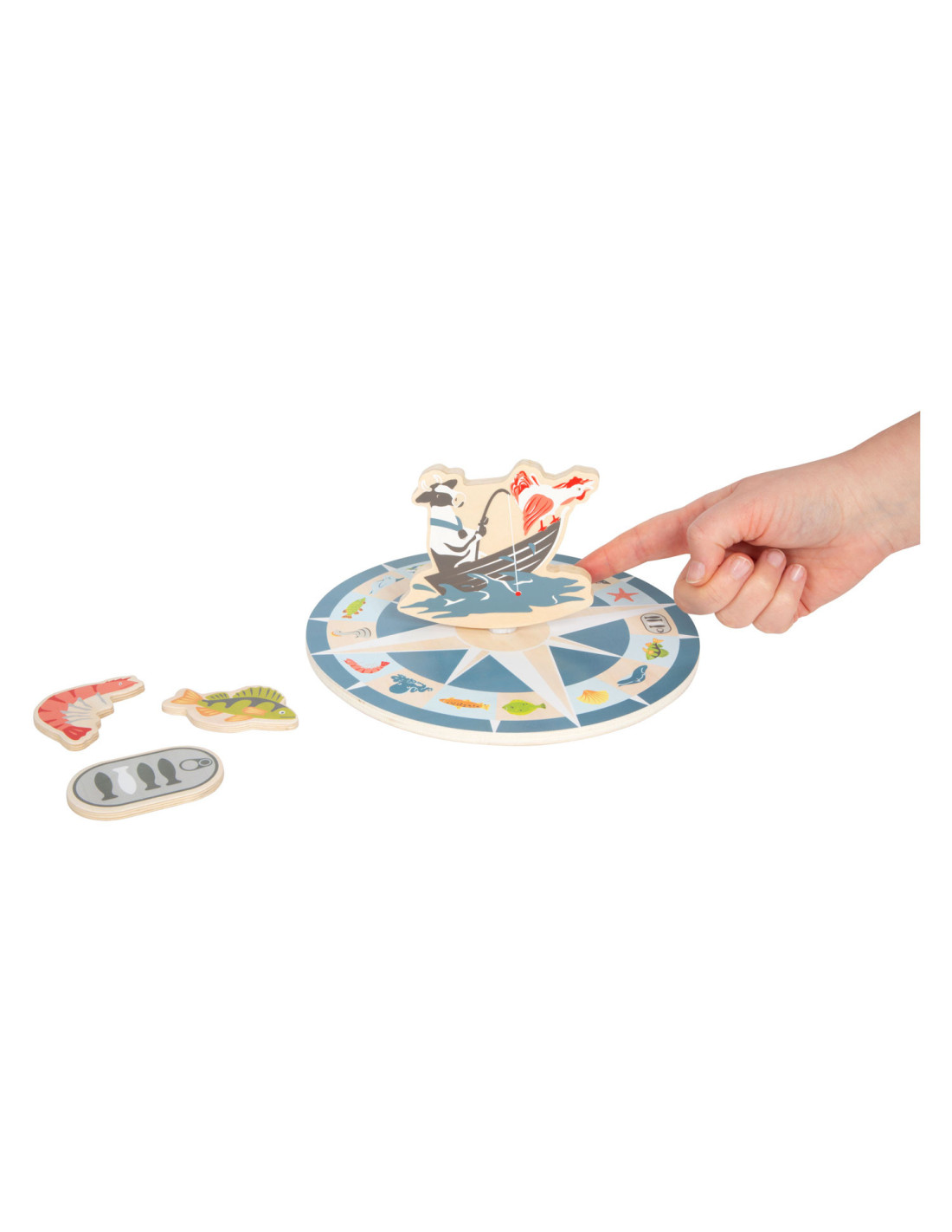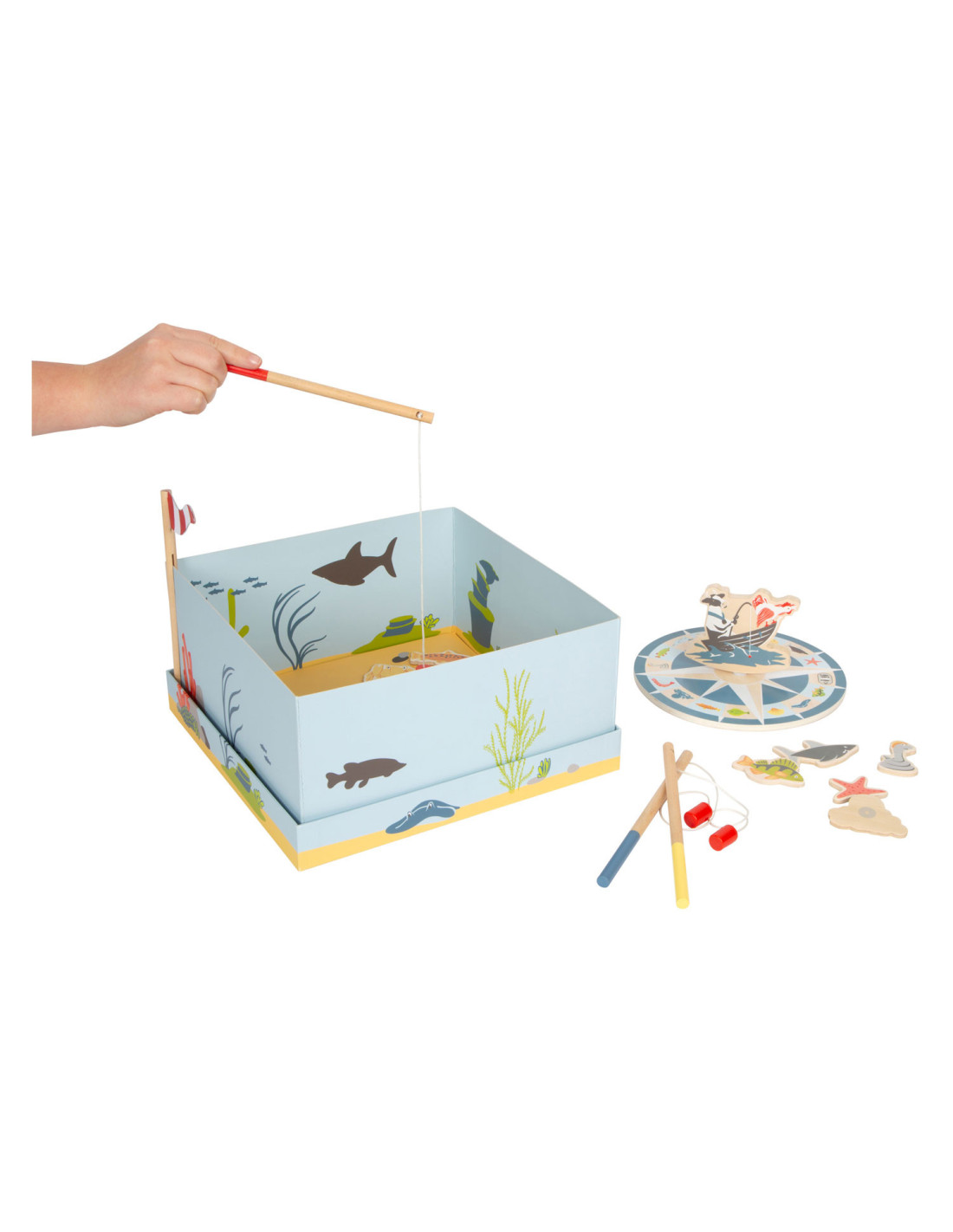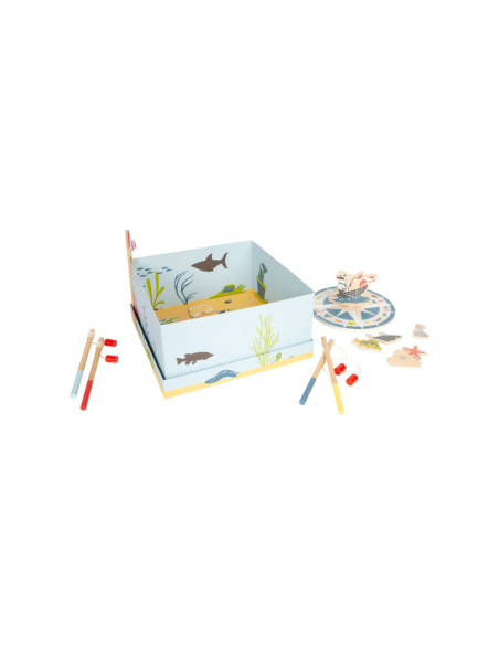 Ga vissen met een paar wilde vrienden! Bij dit klassieke houten kinderspel heb je vaardigheid en geduld nodig om met de houten hengel de juiste zeedieren uit hun zee te vissen. De haan houdt een oogje in het zeil voor de volgende te vangen vis, terwijl de koe vist. Door de boot op het kompas te laten draaien, wordt aangegeven welk zeedier als volgende moet worden gevangen. En dat is praktisch: de bodemflap van de hoogwaardige speeldoos vormt samen met extra wanden een driedimensionaal speelveld. Speelbaar in twee variaties. Groot plezier voor kleine visliefhebbers, samen met vrienden of alleen, en een geweldige kans om de bewoners van de Noordzee, de Oostzee en de Europese binnenwateren te leren kennen. Zodra de juiste vis is gevangen, wordt deze in de visvoorraad van de speler gestopt. Als de verkeerde vis wordt gevangen, moet hij terug in het water worden gegooid. Wordt geleverd met hoogwaardige speldoos voor opslag.