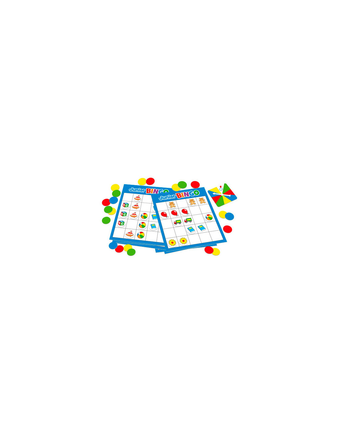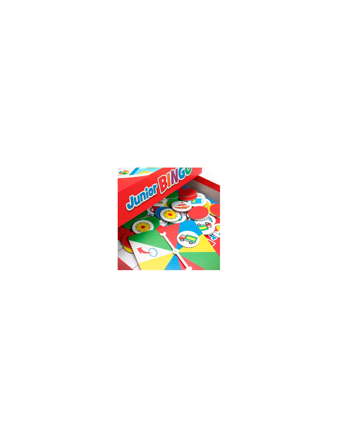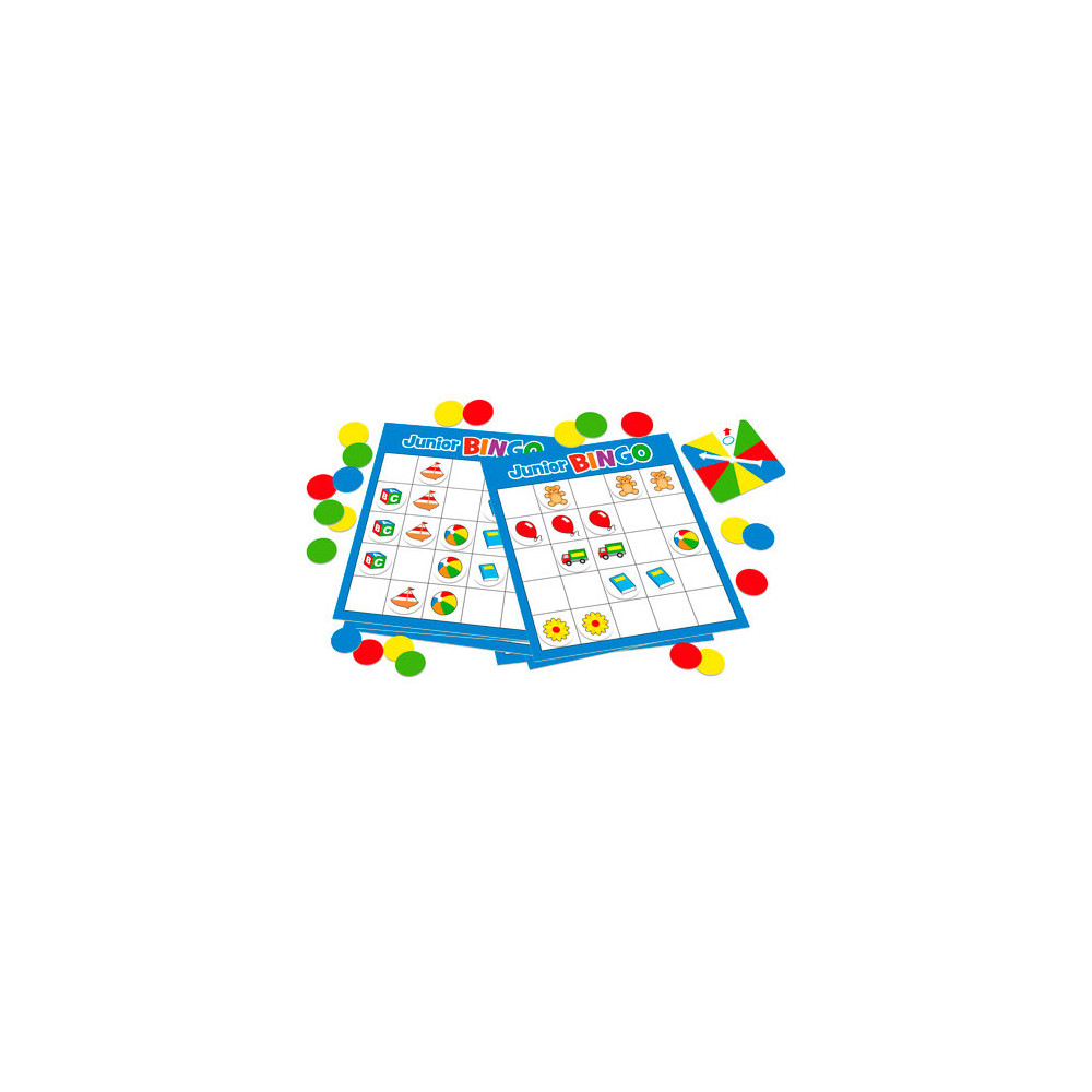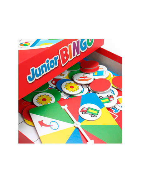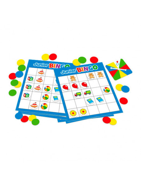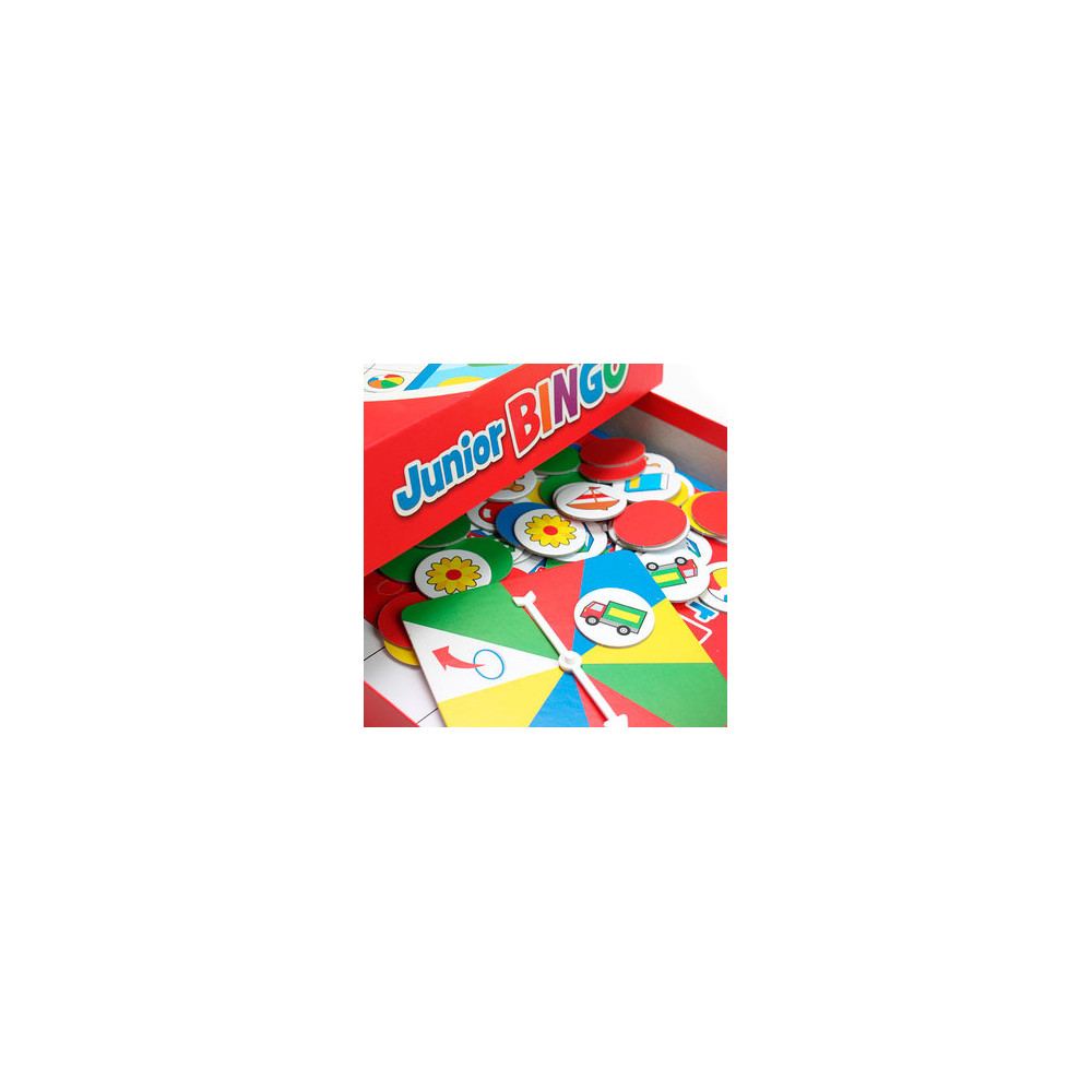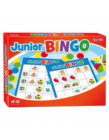 Speel het spannende en kleurrijke spel Junior Bingo van Tactic. Draai aan de spinner en probeer zo snel mogelijk een rij van vijf plaatjes te krijgen op je bingo kaart. De eerste speler met een BINGO wint!