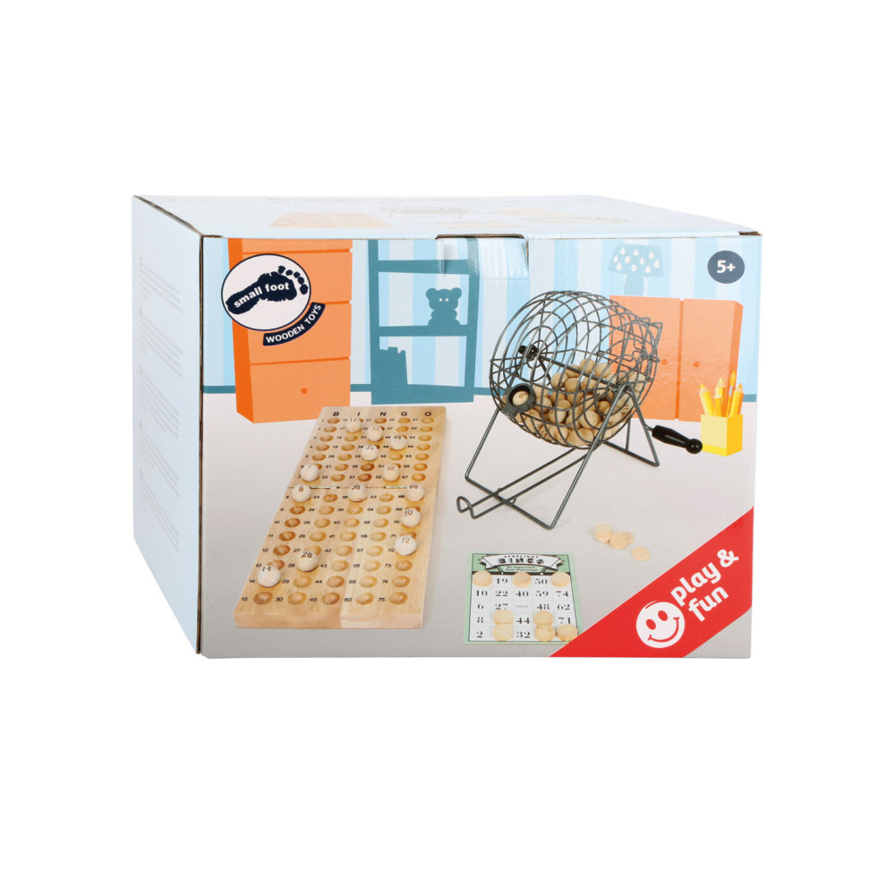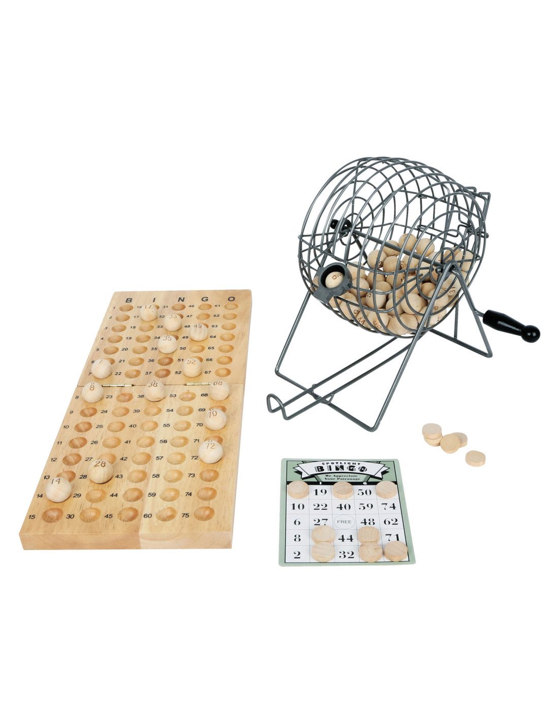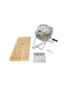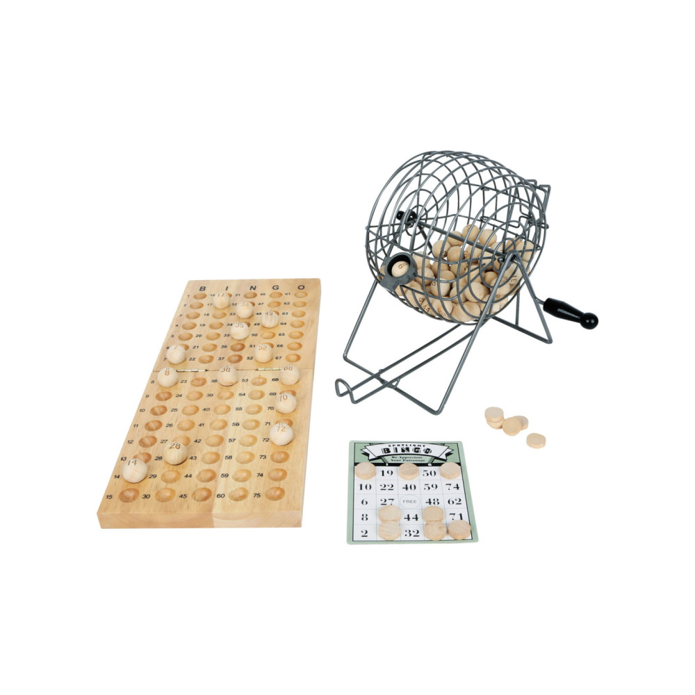Bingo! Een realistisch bingospel om aan tafel te spelen. De regels zijn hetzelfde als voor de professionals - de winnende nummers worden uit de metalen trommel getrokken. De anderen moeten raden. Plezier is gegarandeerd met 24 kaarten, 75 houten ballen, 150 houten dekkaarten en een hoogwaardig houten bord.