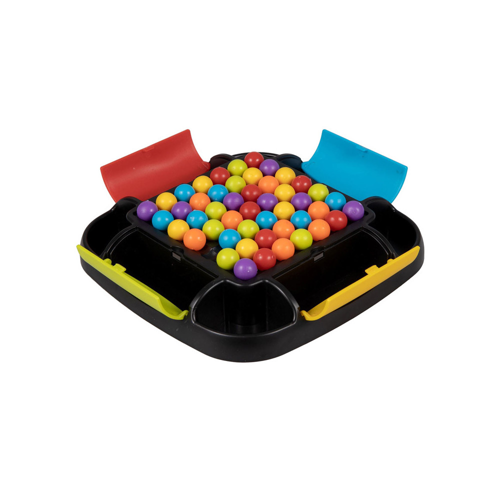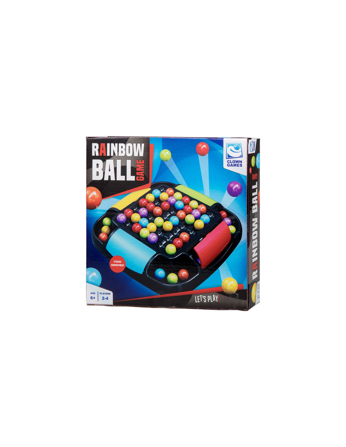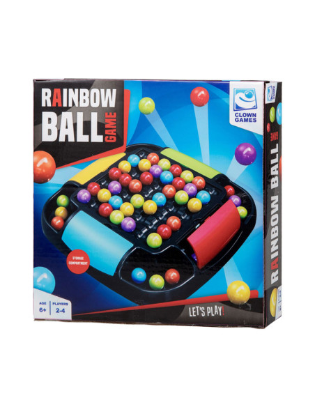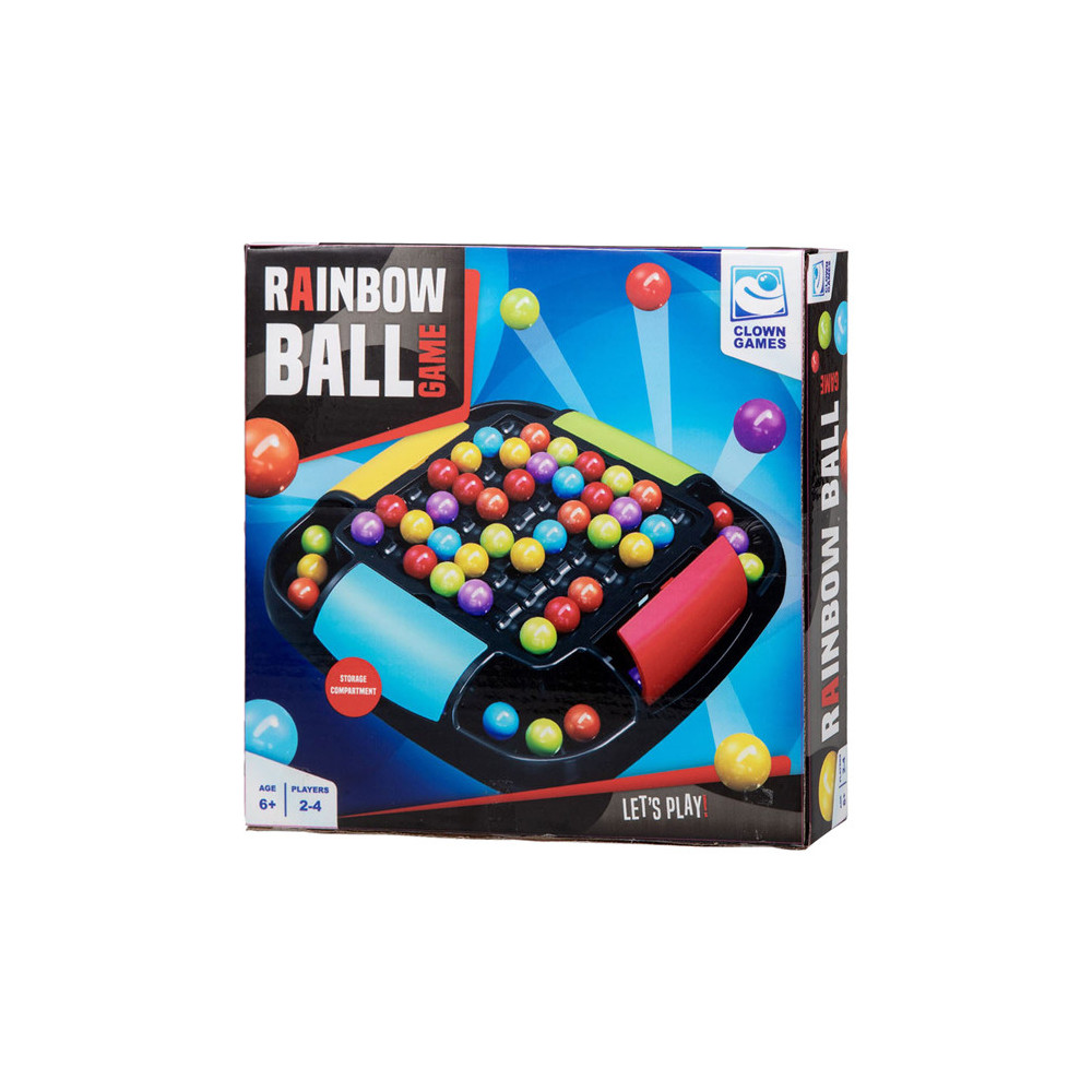 Clown Games Rainbow Ball Game. Bij dit leuke spel plaats je balletjes op een bord. De balletjes hebben alle kleuren van de regenboog. Het doel van het spel is, om een rij met balletjes op een strategische manier te verschuiven, zodat zoveel mogelijk balletjes van dezelfde kleur op elkaar aansluiten. Alle aangrenzende balletjes mogen worden verzameld: wie er de meeste verzamelt, heeft gewonnen! Het bord heeft opbergvakken in 4 kleuren, zodat je na het spelen alle balletjes kunt opruimen. Inhoud: speelbord, 48 regenboogballetjes. Wordt geleverd in full-colour verpakking. Geschikt voor 2 tot 4 spelers vanaf 6 jaar.