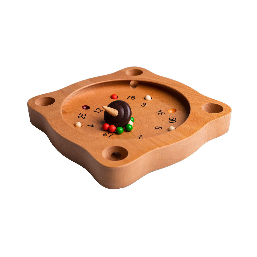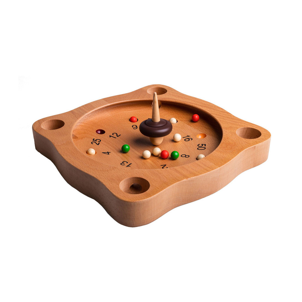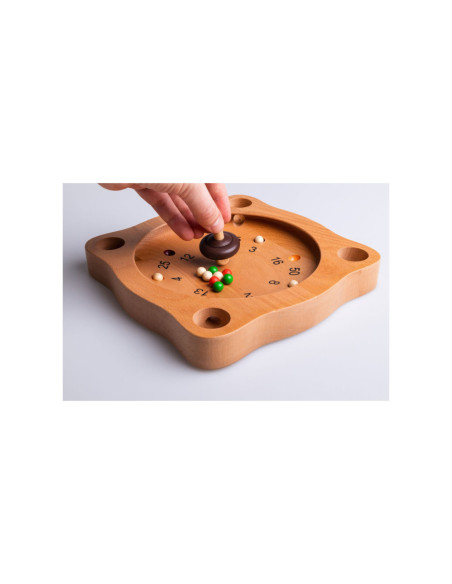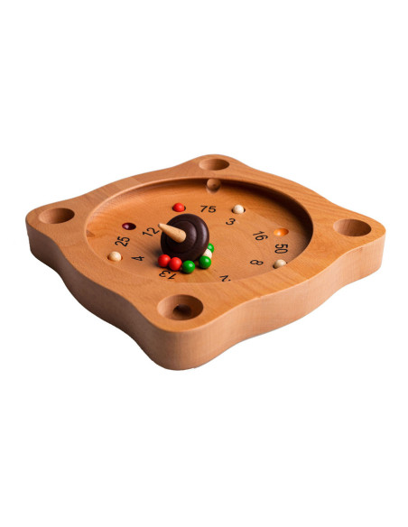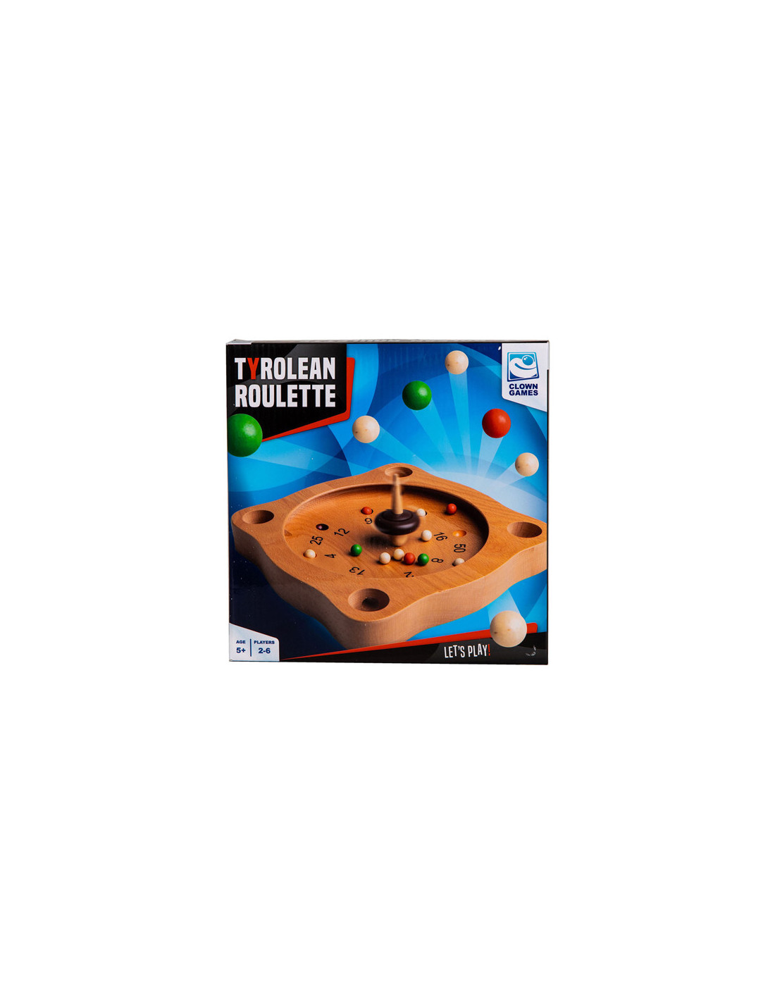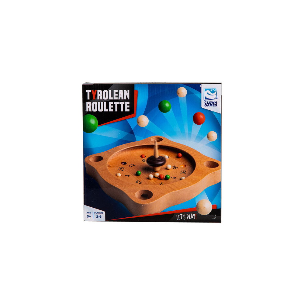 Clown Games Tiroler Roulette van hout. Je speelt dit spel op een houten speelbord, dat meerdere uitsparingen heeft, plus 4 hoekgaten. Met de tol probeer je de balletjes naar plekken te spelen, die de meeste punten opleveren. Wie het eerst het afgesproken aantal punten haalt, heeft gewonnen! Inhoud: speelbord, 12 gekleurde balletjes en een tol. Afmetingen van het speelbord: 21 x 21 cm. Op clowngames.nl is een uitgebreide handleiding in 6 talen te vinden. Wordt geleverd in full-colour doos. Geschikt voor zowel kinderen als volwassenen: 2 tot 6 spelers vanaf 5 jaar.