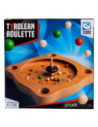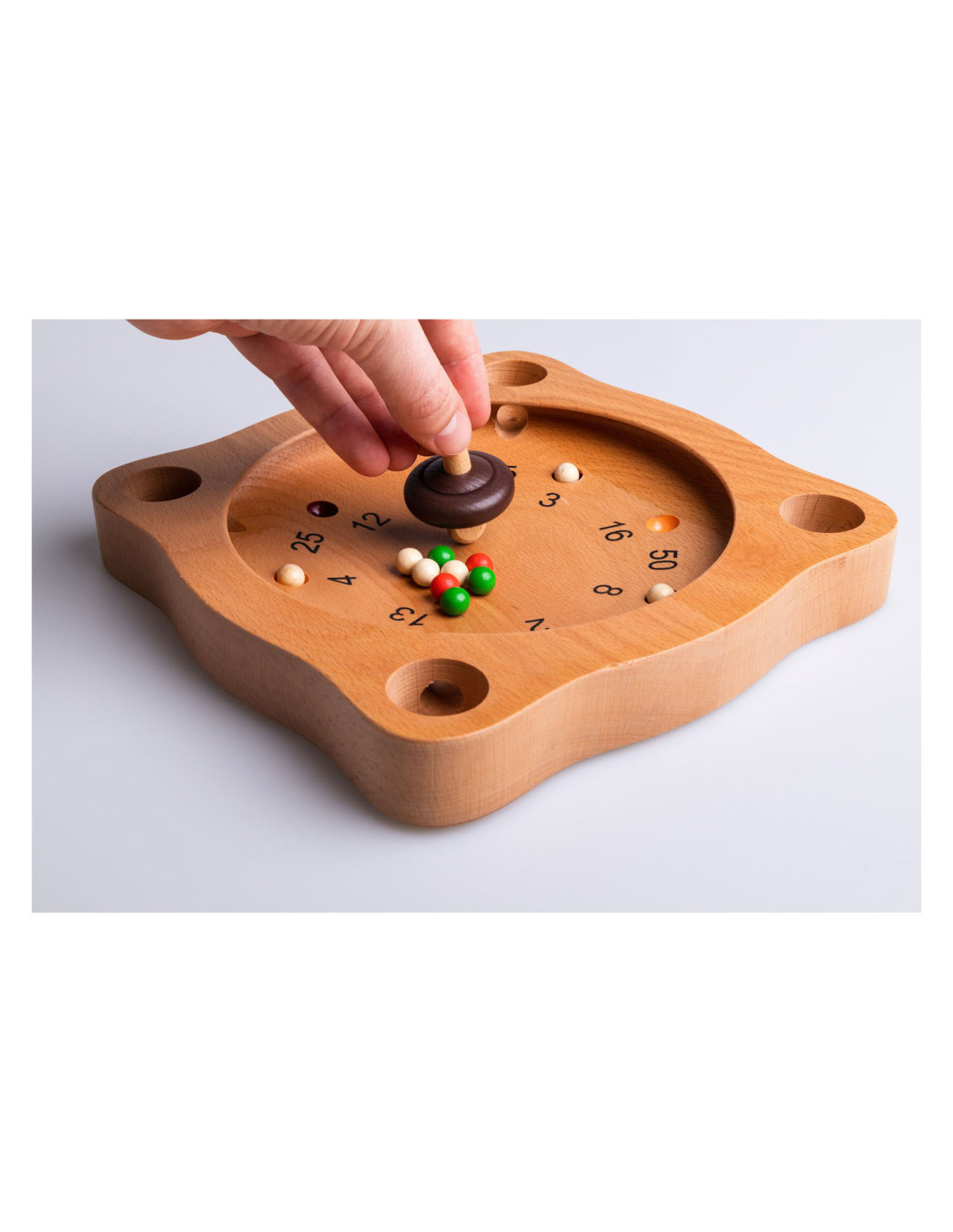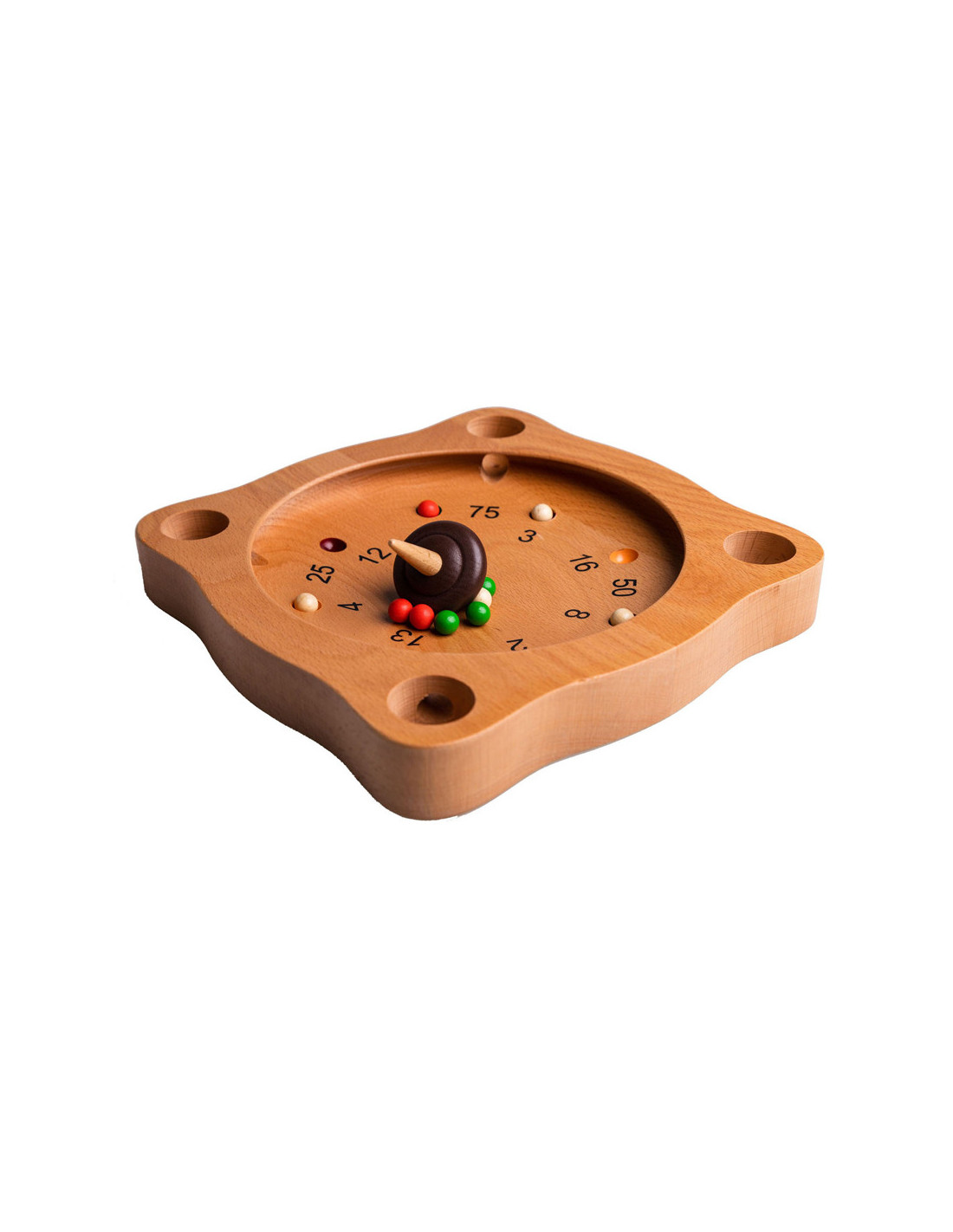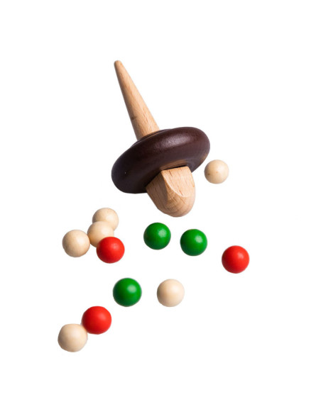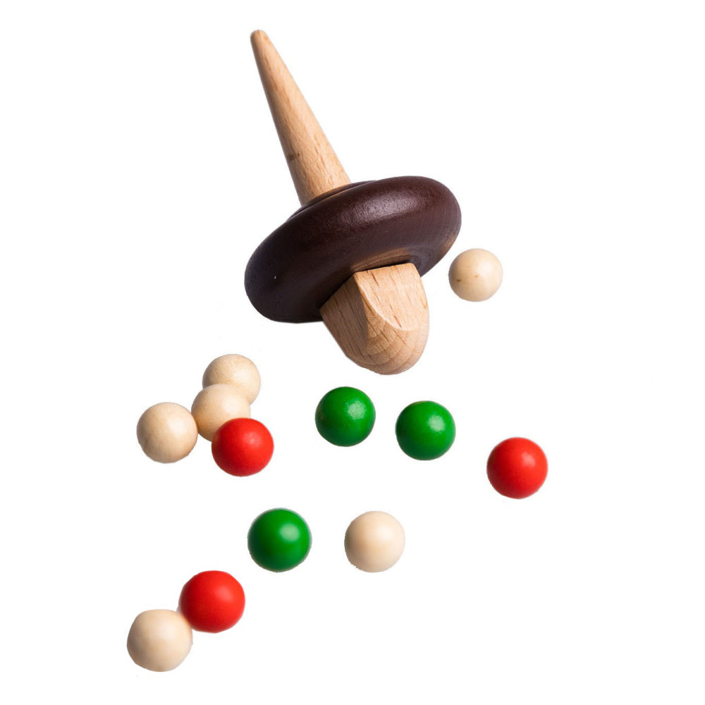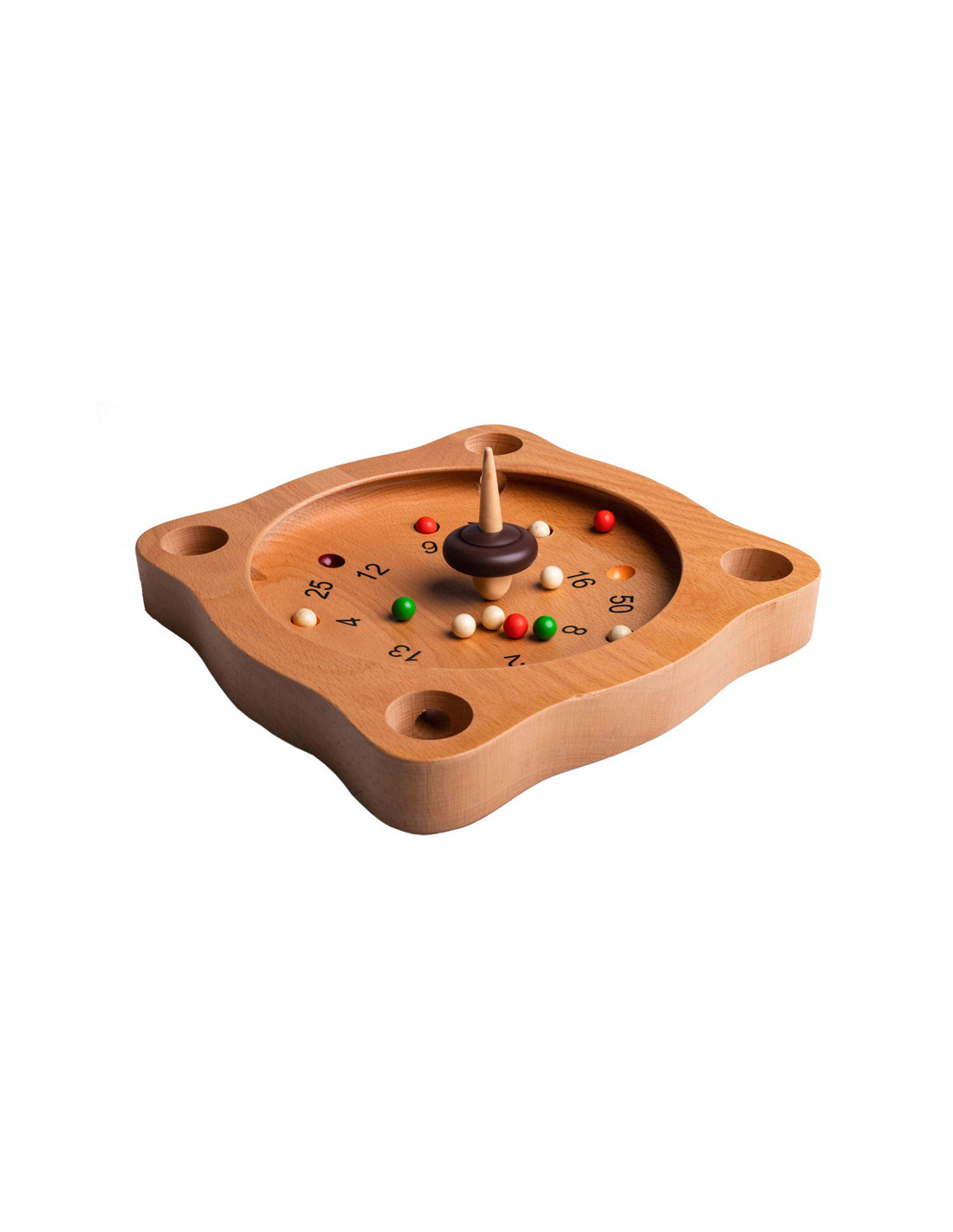 Clown Games Tiroler Roulette van hout. Je speelt dit spel op een houten speelbord, dat meerdere uitsparingen heeft, plus 4 hoekgaten. Met de tol probeer je de balletjes naar plekken te spelen, die de meeste punten opleveren. Wie het eerst het afgesproken aantal punten haalt, heeft gewonnen! Inhoud: speelbord, 12 gekleurde balletjes en een tol. Afmetingen van het speelbord: 21 x 21 cm. Op clowngames.nl is een uitgebreide handleiding in 6 talen te vinden. Wordt geleverd in full-colour doos. Geschikt voor zowel kinderen als volwassenen: 2 tot 6 spelers vanaf 5 jaar.