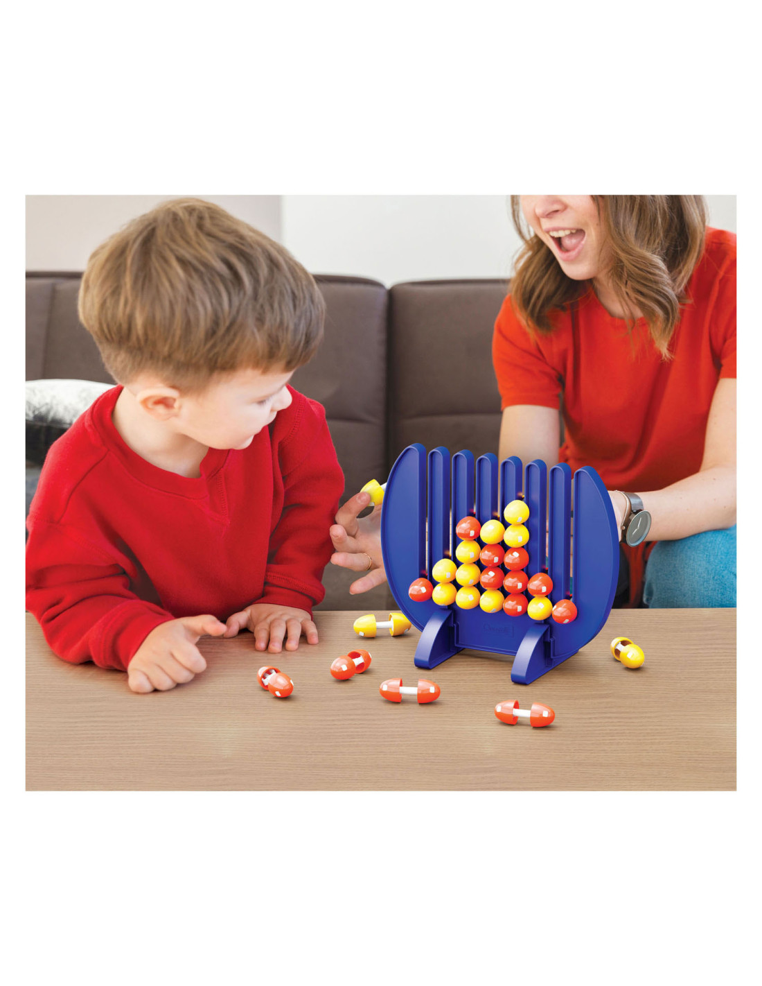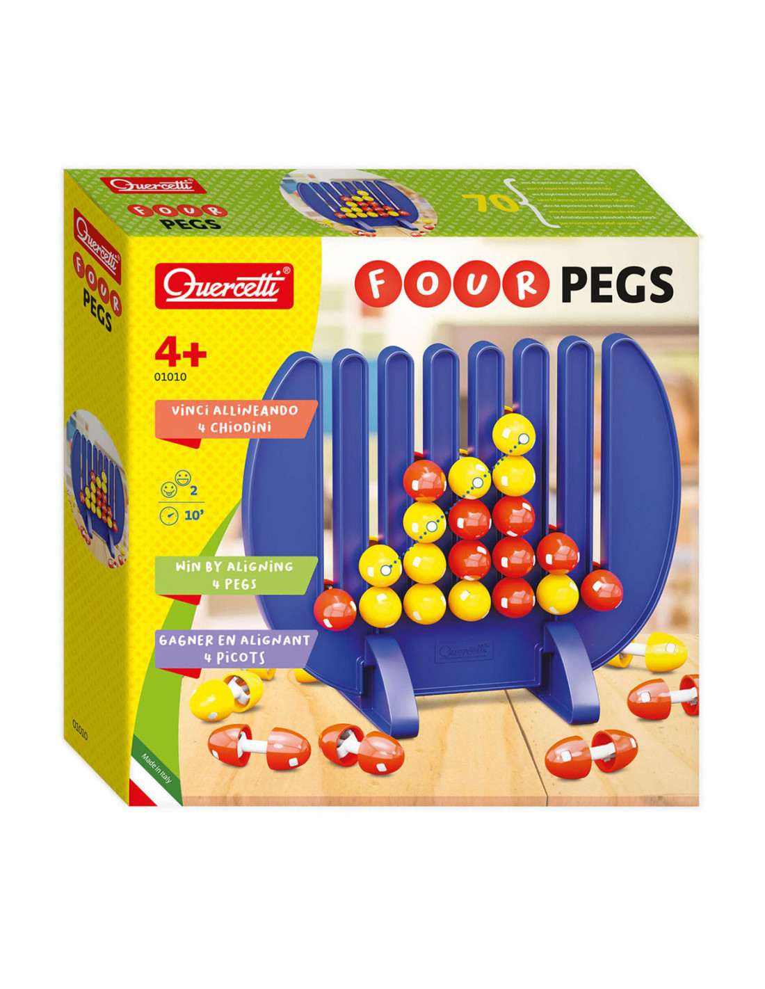 Four Pegs is een heel eenvoudig en leuk strategiespel. Om beurten laten twee spelers hun gekozen gekleurde pinnen in de groeven van het rooster vallen. De eerste speler die vier pinnen verticaal, horizontaal of diagonaal uitlijnt, wint.
