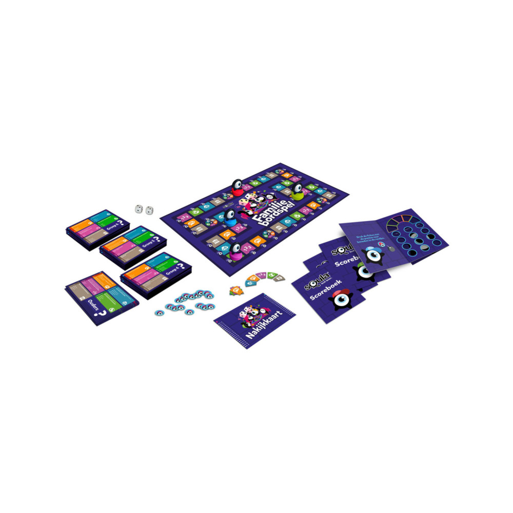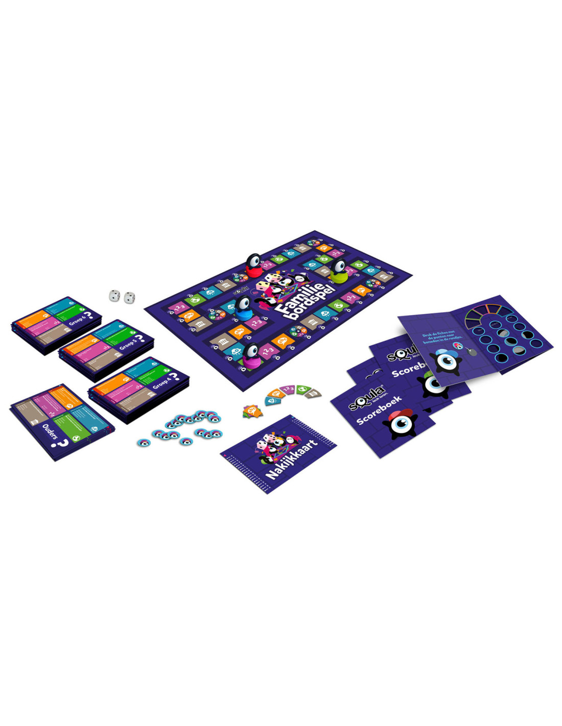 Inhoud: 180 vragenkaarten met 900 vragen, 4 Squla pionnen, 4 scoreboekjes, fiches en regenboogdelen, speelbord, 2 dobbelstenen en spelregels.
