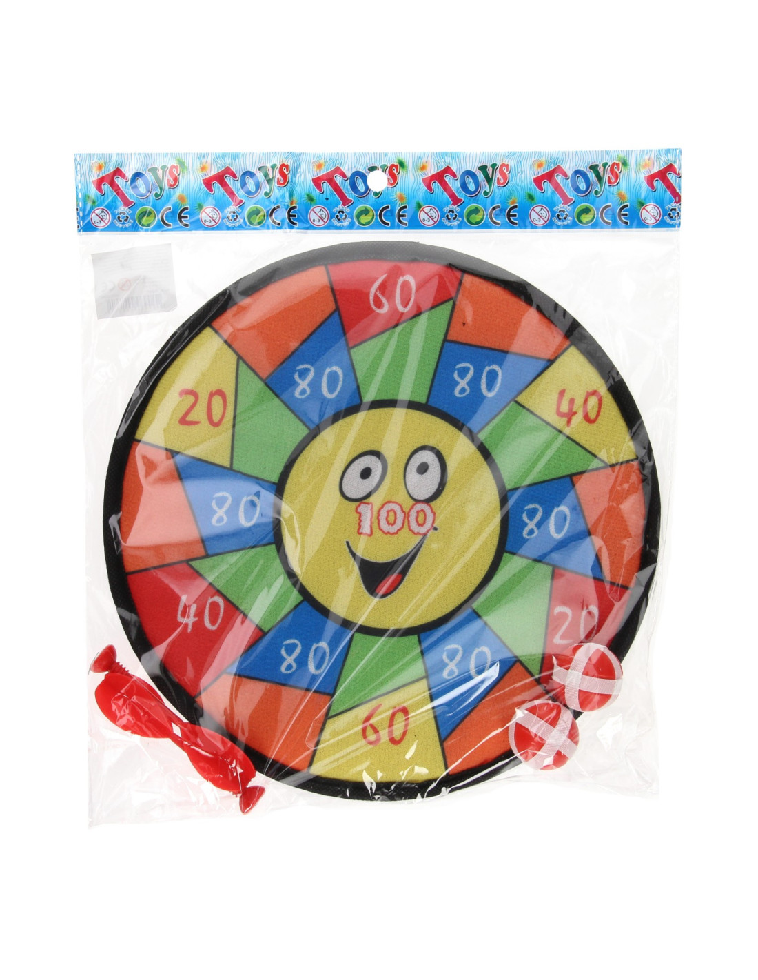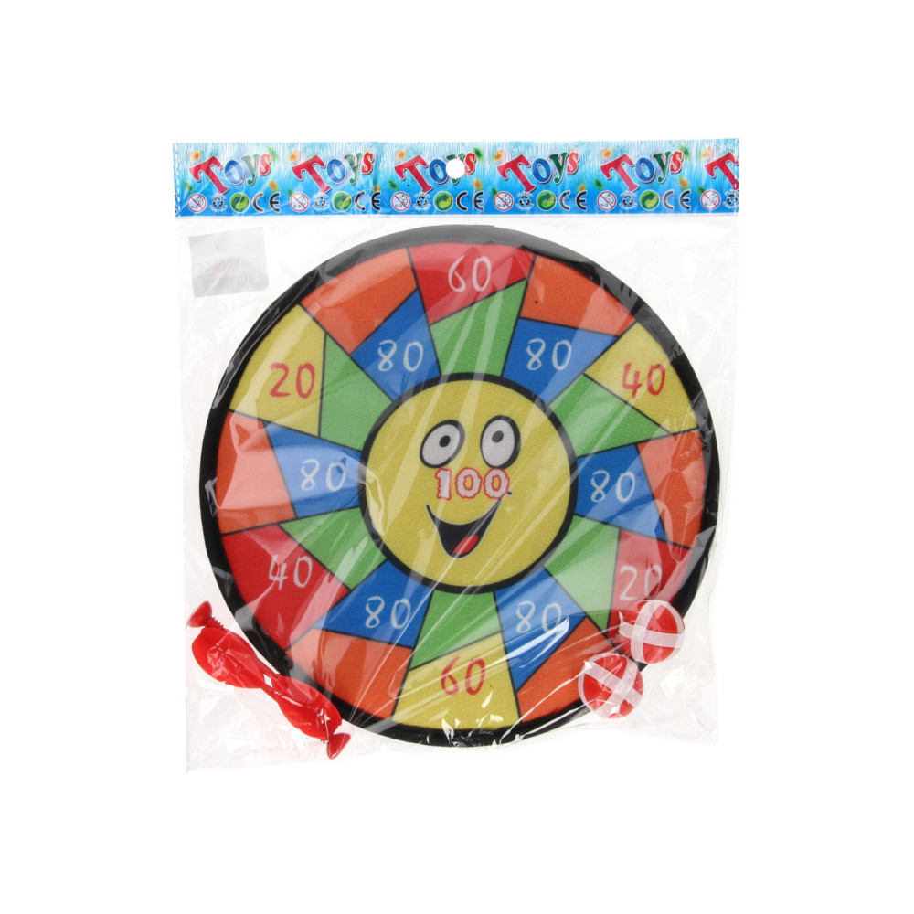 Afmeting: diameter 27,5 cm, balletjes diameter 3.5 cm. dartpijlen 9.5 cm
