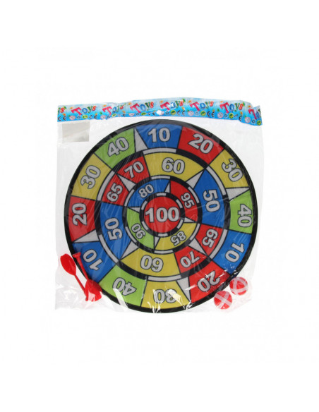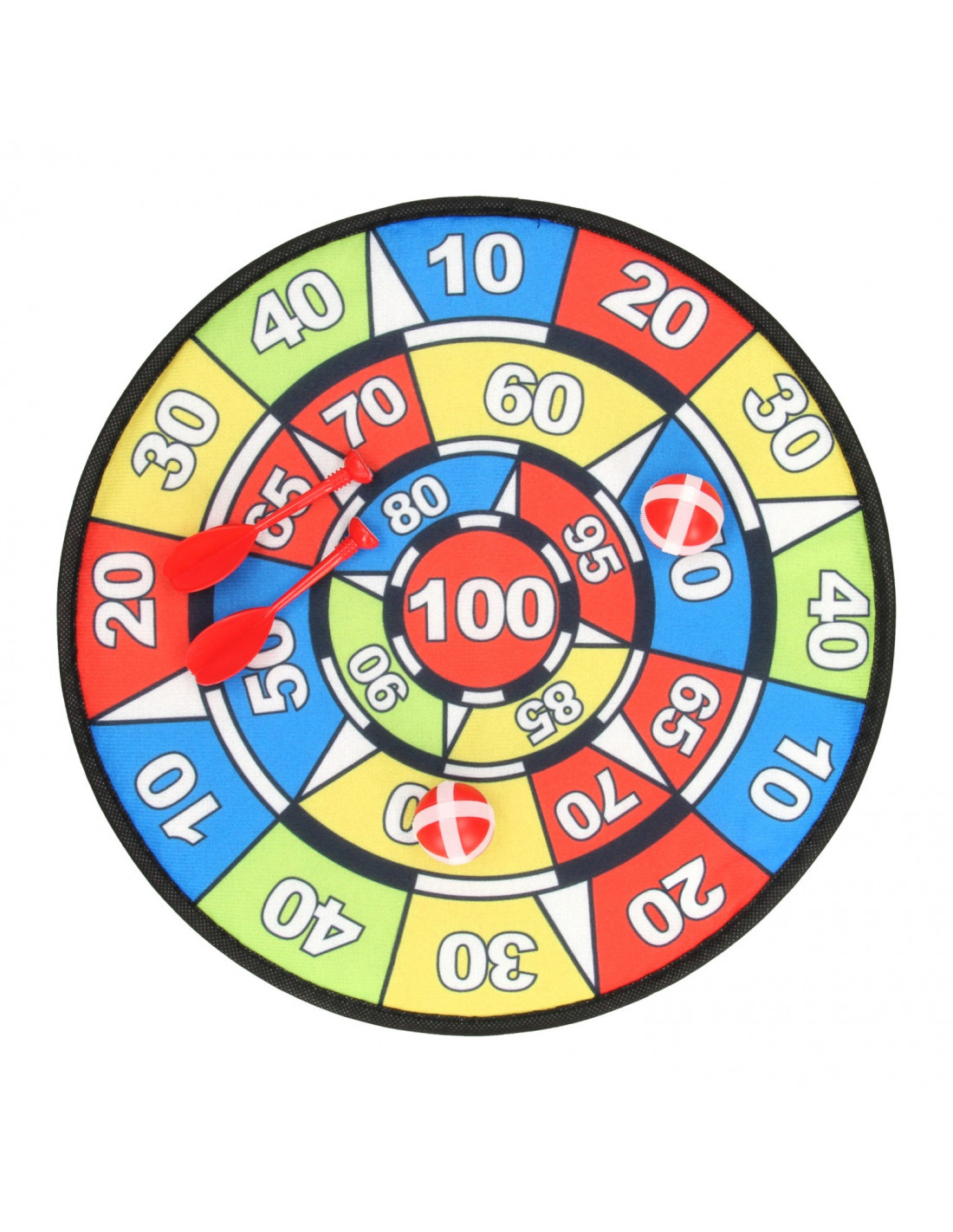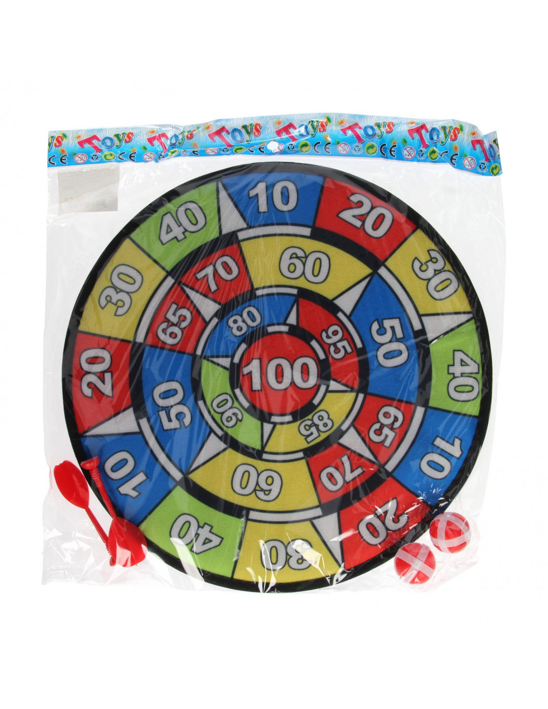 Groot dartbord met klittenband en kleefballen. De ballen en/of pijltjes blijven aan het zachte vilt plakken. Op het vakje waar hij op landt, lees je af hoeveel punten je gescoord hebt. Geschikt vanaf 4 jaar.