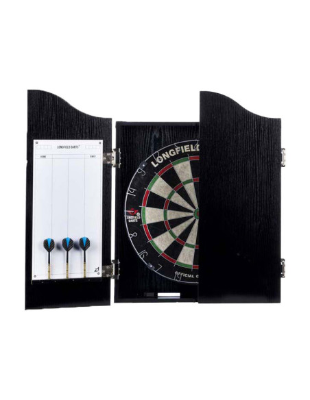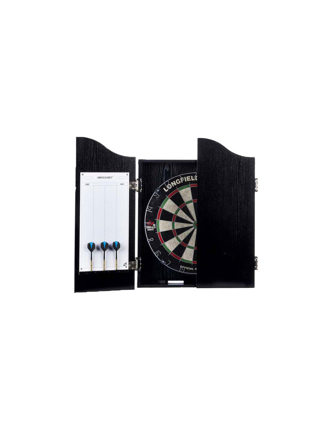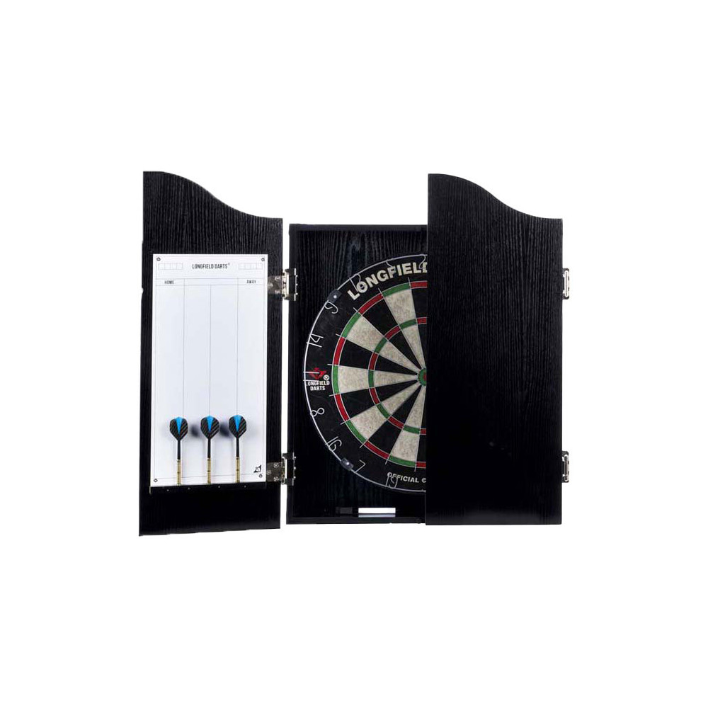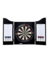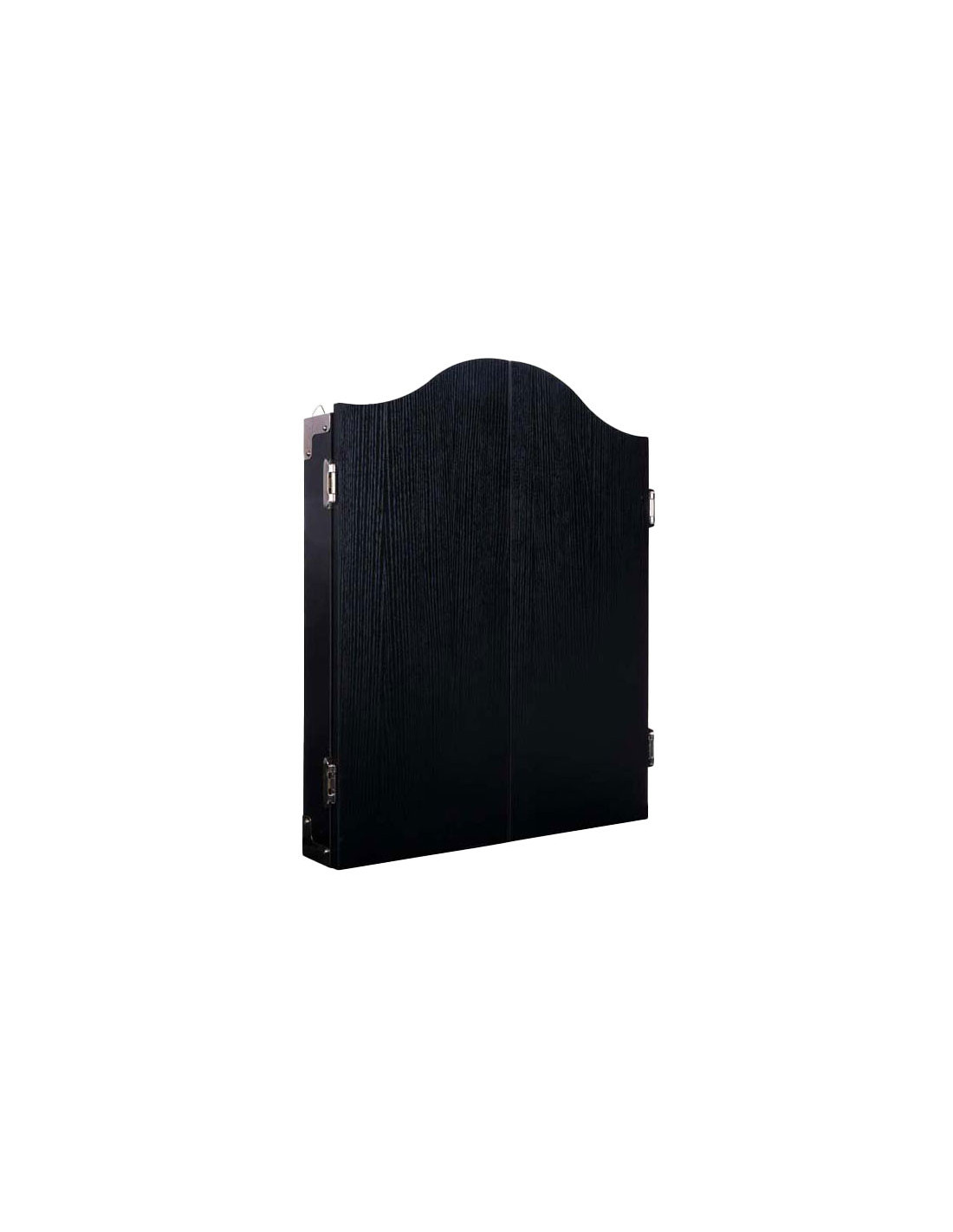 Dart-cabinet hout in de kleur zwart. Inclusief een sisal dartboard, 6 brass darts 18 gram, een marker en wisser.