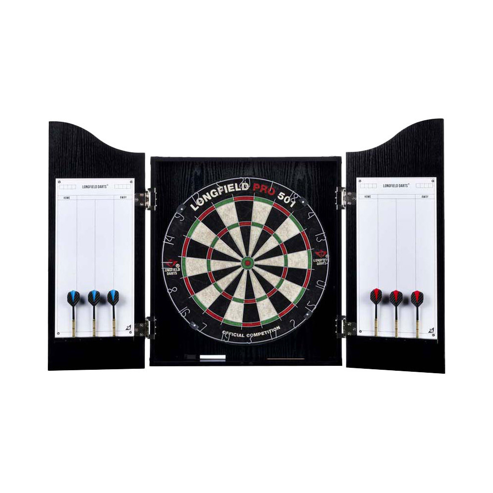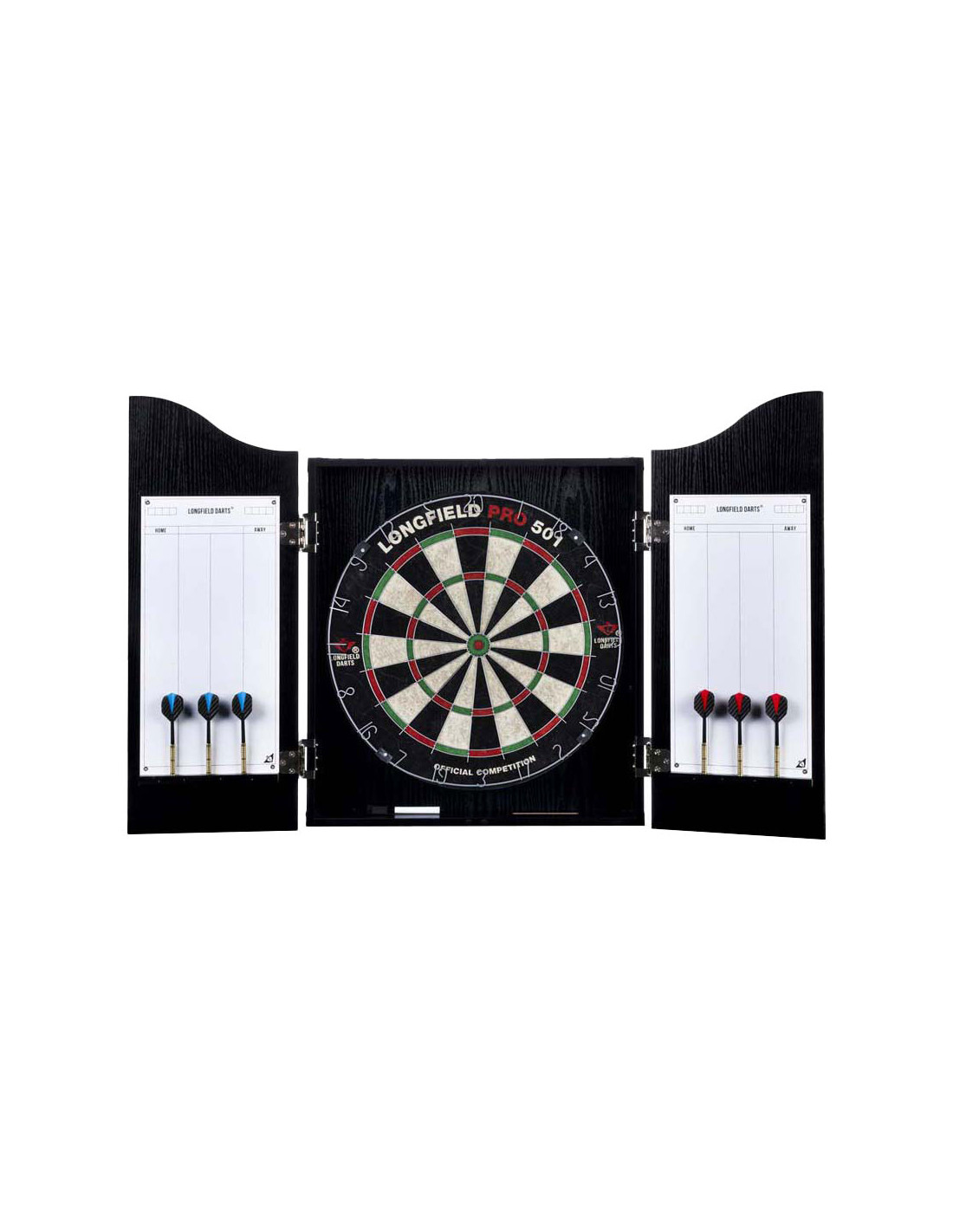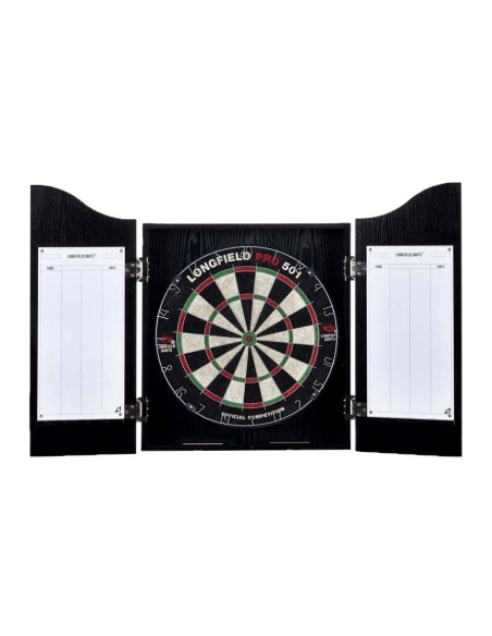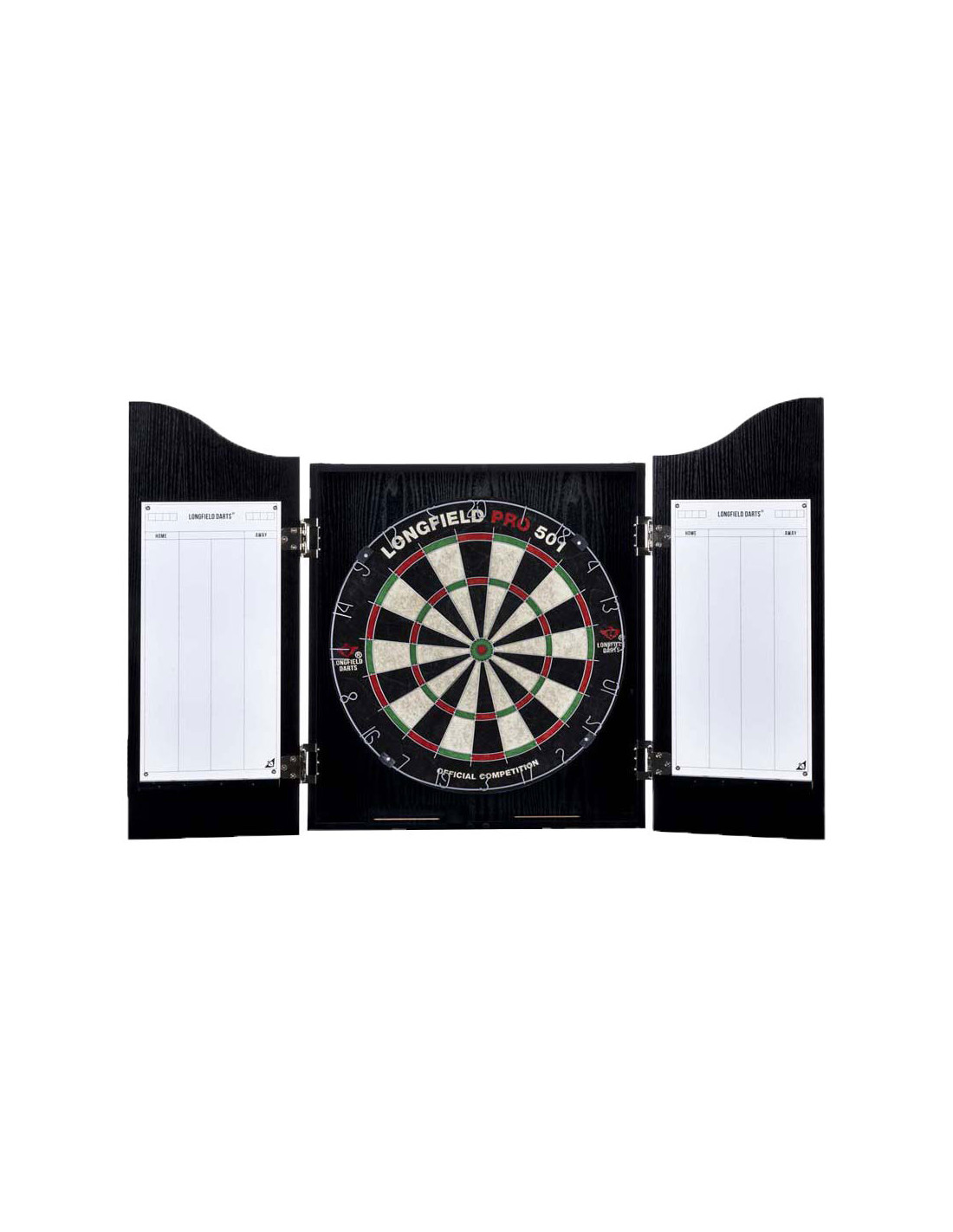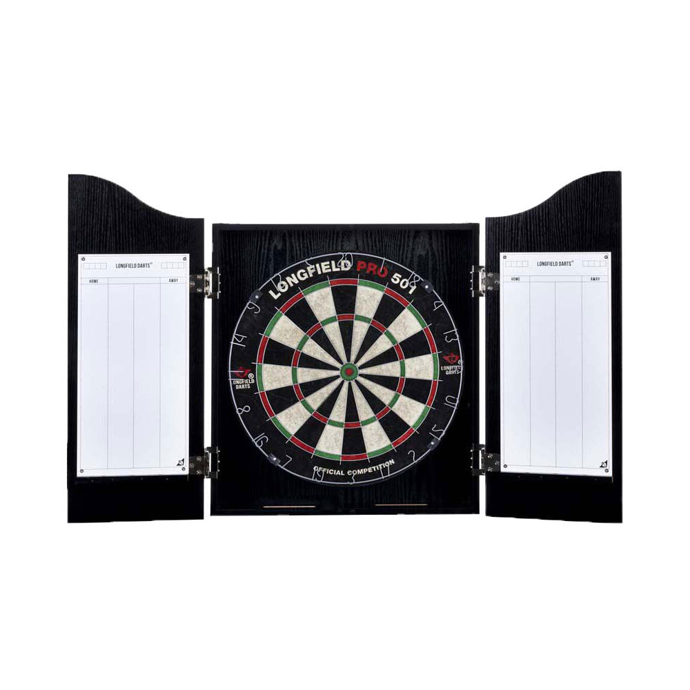 Dart-cabinet hout in de kleur zwart. Inclusief een sisal dartboard, 6 brass darts 18 gram, een marker en wisser.