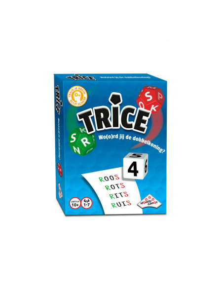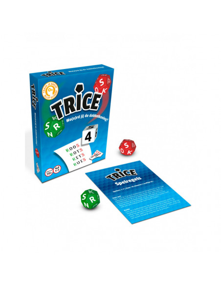 Hoe werkt Trice? Het spel bevat drie kleurrijke dobbelstenen: een groene, een rode en een witte. De groene dobbelsteen geeft de beginletter aan, de rode dobbelsteen de eindletter en de witte dobbelsteen het aantal letters dat het woord moet hebben. Spelers gooien de dobbelstenen en proberen binnen de gegeven tijd zoveel mogelijk woorden te bedenken die aan de criteria voldoen.