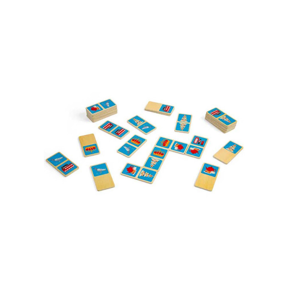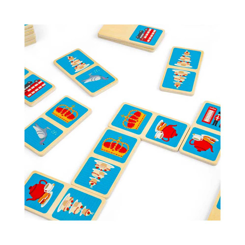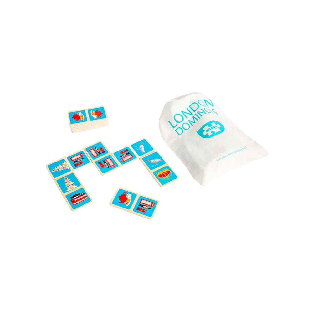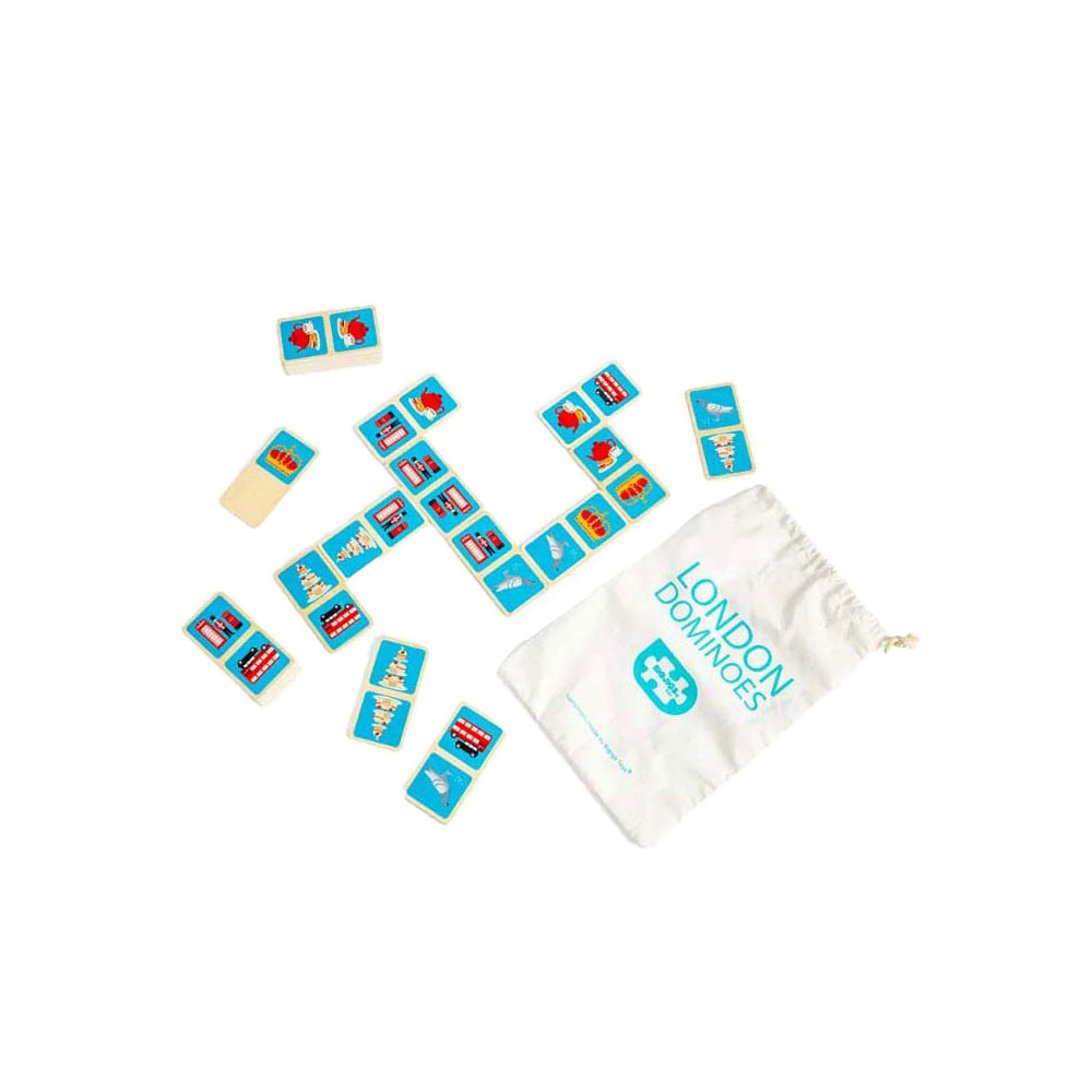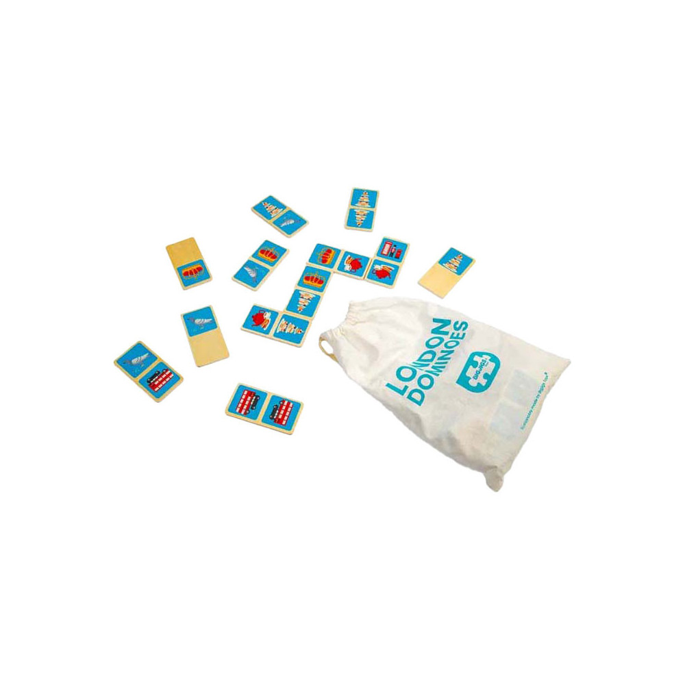 Breng een beetje Britse charme in huis met dit 28-delige London dominoes spel. Elke domino heeft een kleurrijke illustratie van de iconische stad, zoals een rode dubbeldekkerbus, zwarte taxi of koninklijke kroon. De houten domino's worden geleverd in een handige trekkoordtas, ideaal voor reizen en opslag.