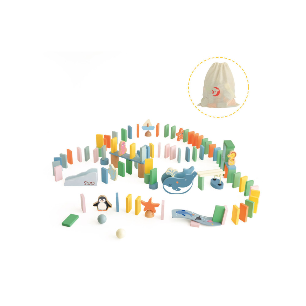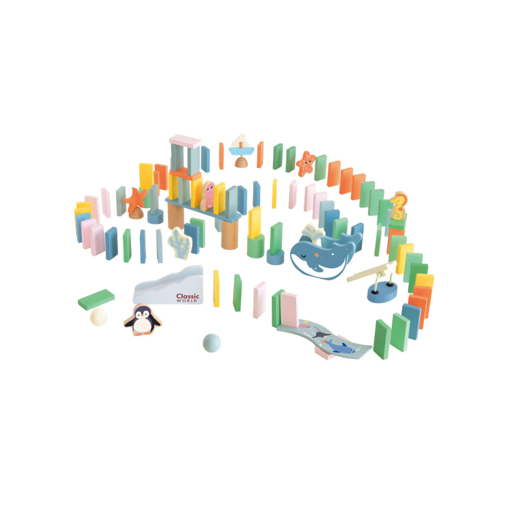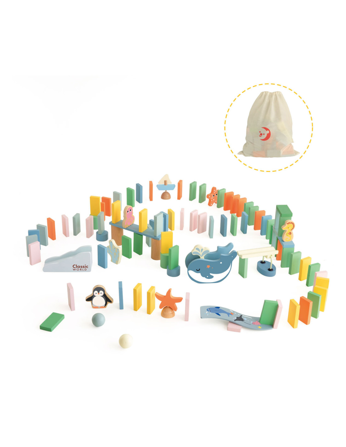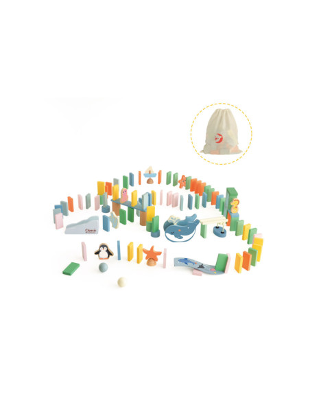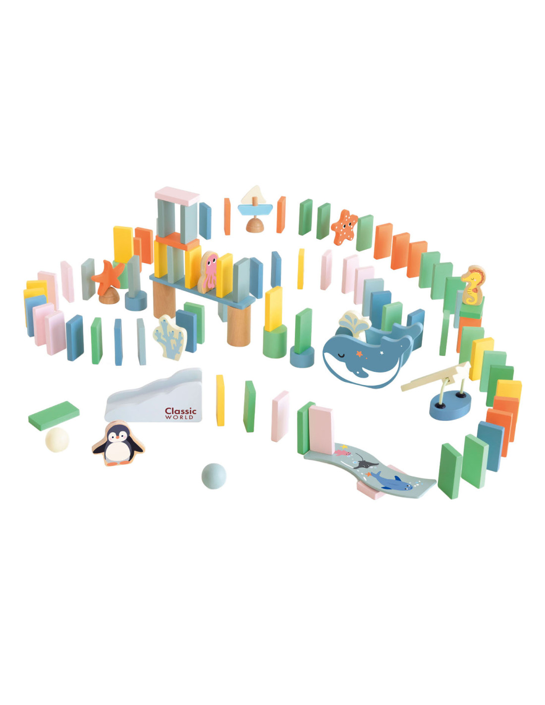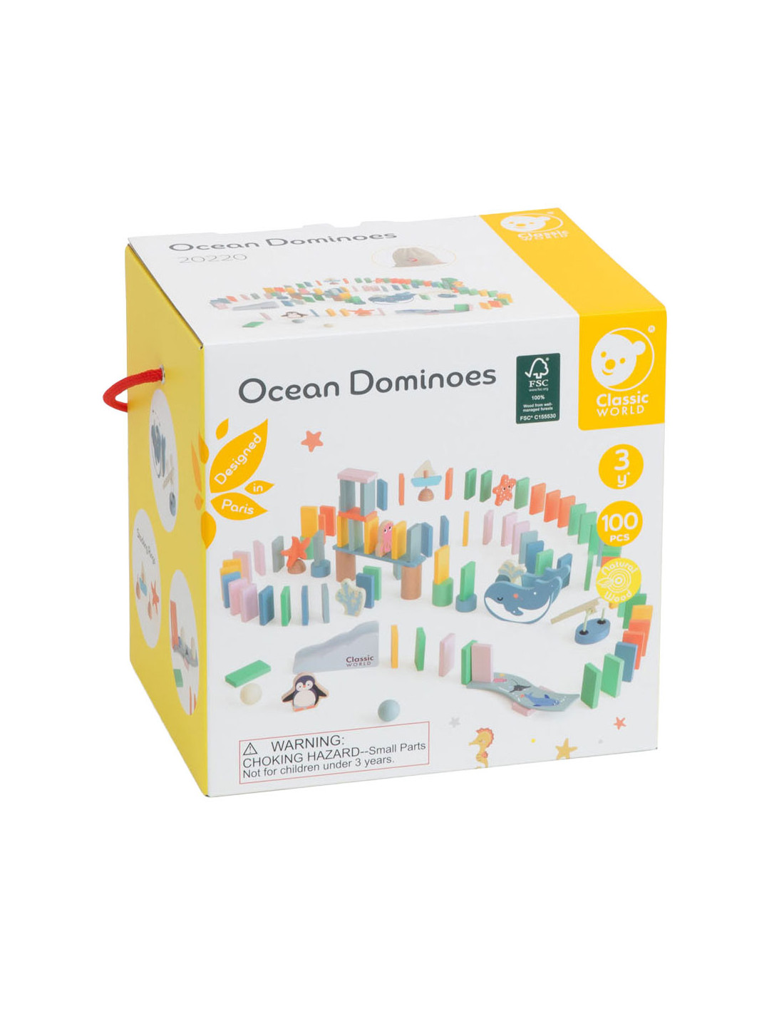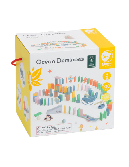 Dominospel met 100 dominostenen geschikt voor kinderen vanaf 3 jaar. De dominostenen zijn bedrukt met oceaandieren en bevatten extra accessoires. om een dominobaan te bouwen.