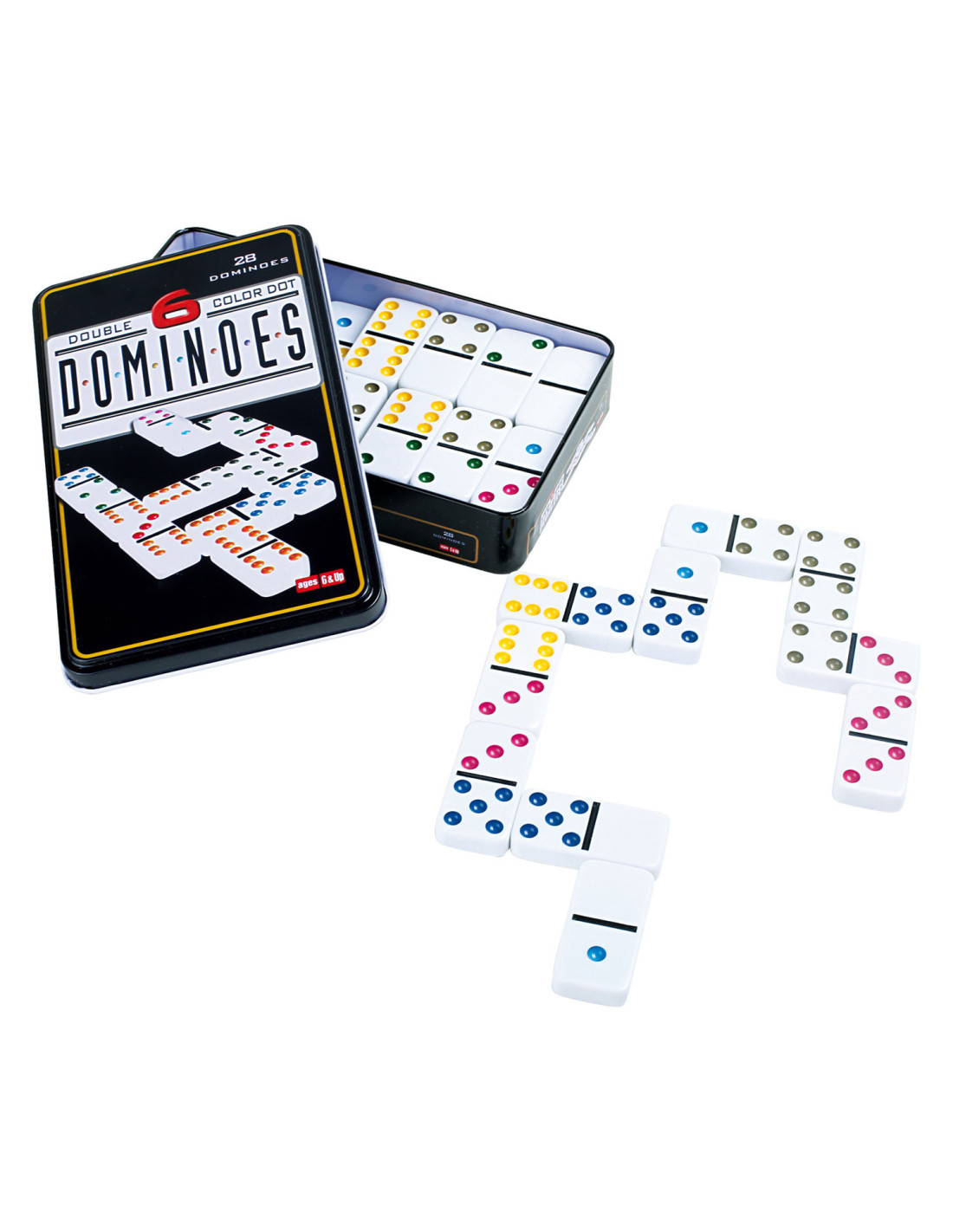 Dominospel in een stevige metalen doos. De grote, witte dominostenen hebben stippen in verschillende kleuren - dit maakt het gemakkelijker om bijpassende paren te vinden.