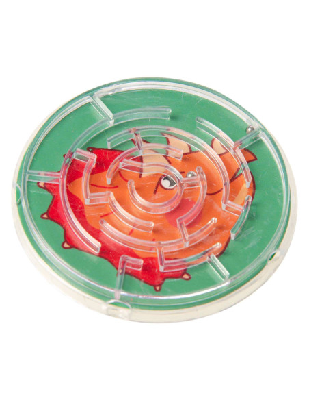 Rond geduldspelletje met stoere dinosaurustekeningen als achtergrond. Elk spel bevat een transparant doolhof waarin metalen balletjes naar het midden geleid moeten worden door te kantelen en te draaien. De kleurrijke illustraties van verschillende dinohoofden maken het spel extra aantrekkelijk voor jonge dinofans.