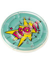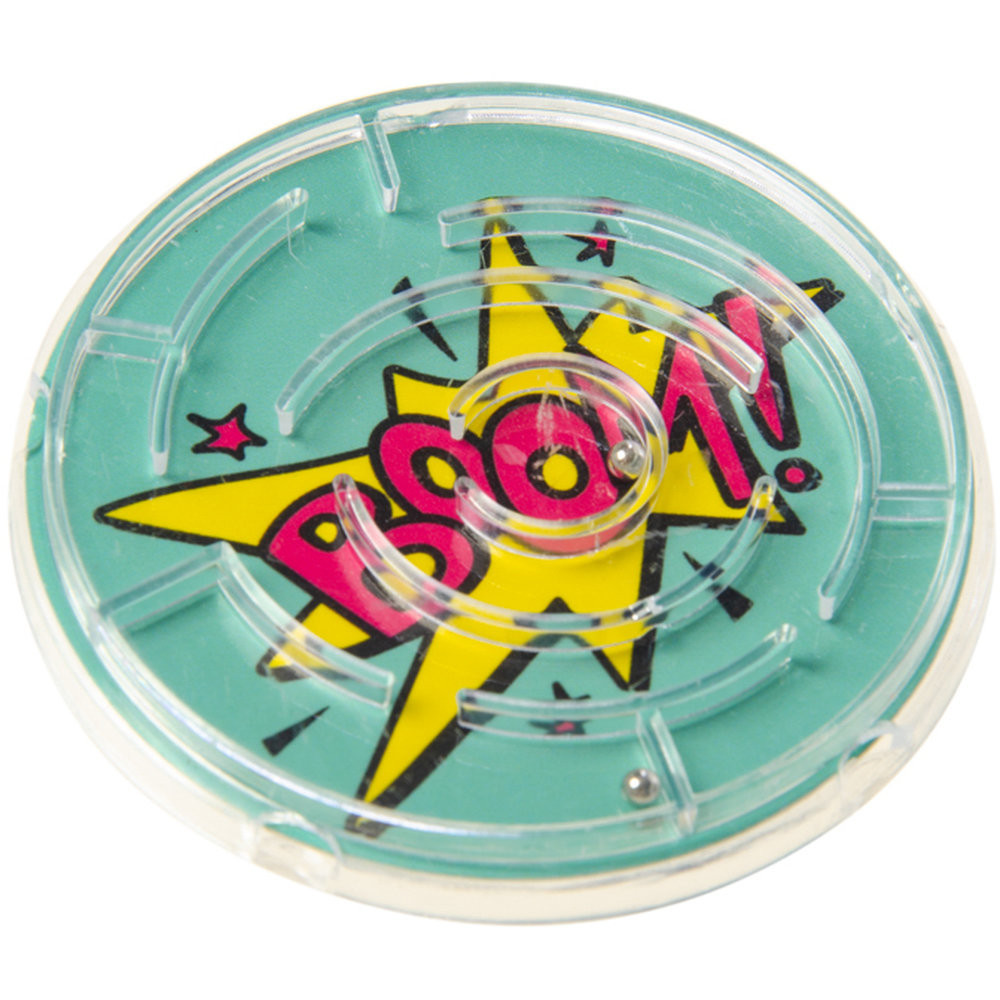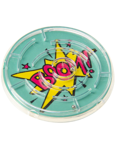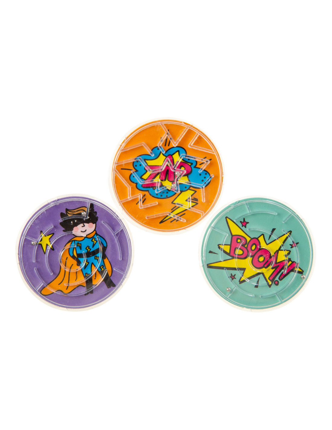 Rond geduldspelletje met stoer superheldenthema. Elk spelletje toont een kleurrijke illustratie zoals een superheld, bliksemschicht of stripachtige tekst als 'BOOM' of 'ZAP'. Door het spel te kantelen moeten de metalen balletjes door het doolhof worden geleid. Dit zorgt voor een leuke uitdaging waarbij concentratie en behendigheid worden getest.