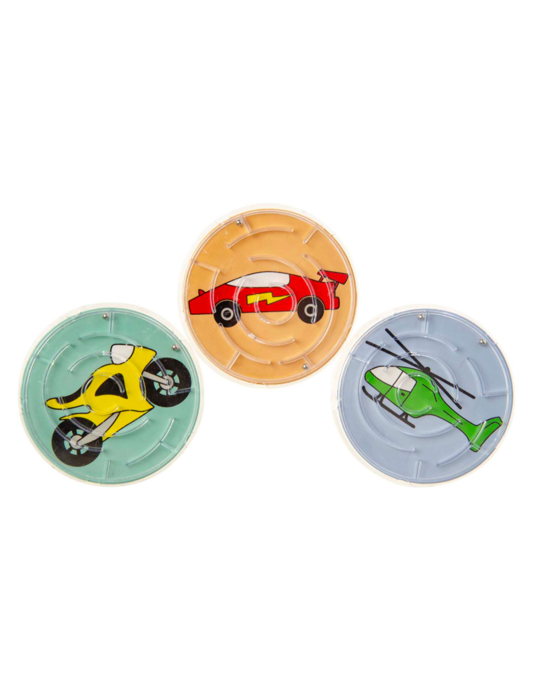 Rond geduldspelletje met stoere voertuigen zoals een raceauto, motor of helikopter als achtergrond. Door het spelletje te kantelen moeten kleine metalen balletjes langs het doolhof worden geleid naar het midden. Het vraagt om concentratie en een vaste hand, wat zorgt voor een leuke uitdaging.