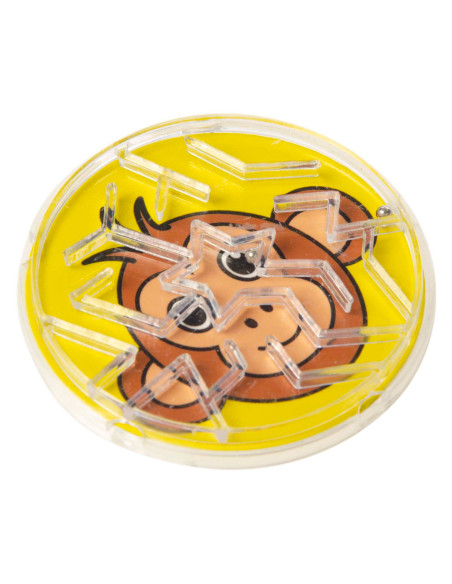 Rond geduldspelletje met vrolijke wilde dieren als achtergrond, zoals een aap, tijger en olifant. Het spel bevat kleine metalen balletjes die door het doolhof naar het midden geleid moeten worden door het geheel te kantelen.