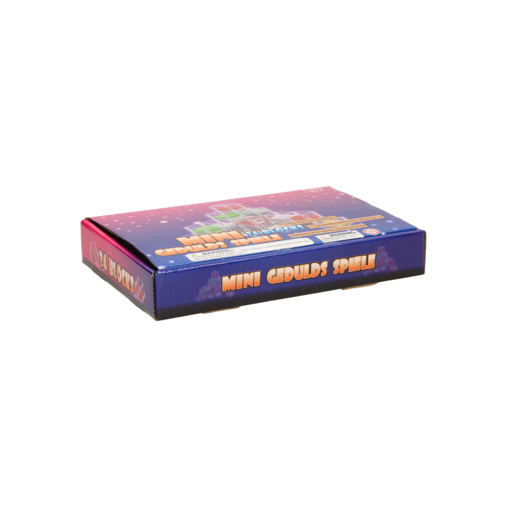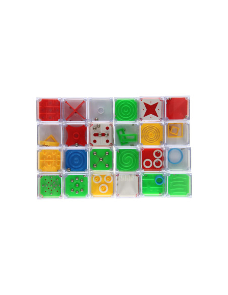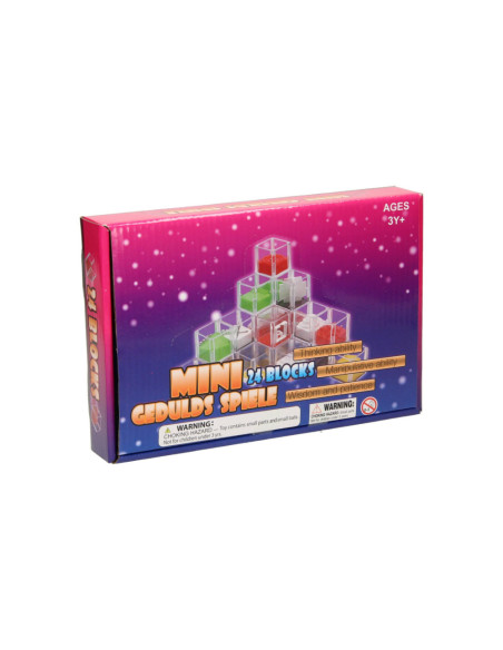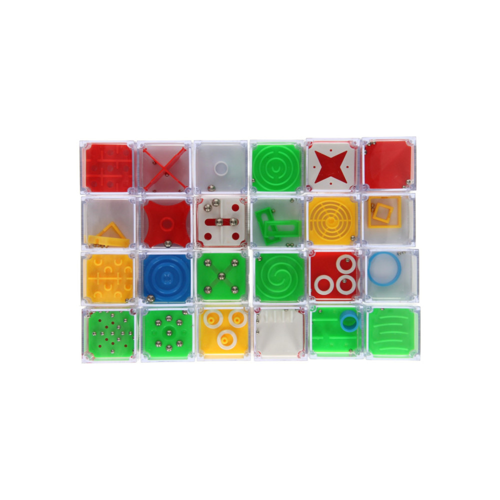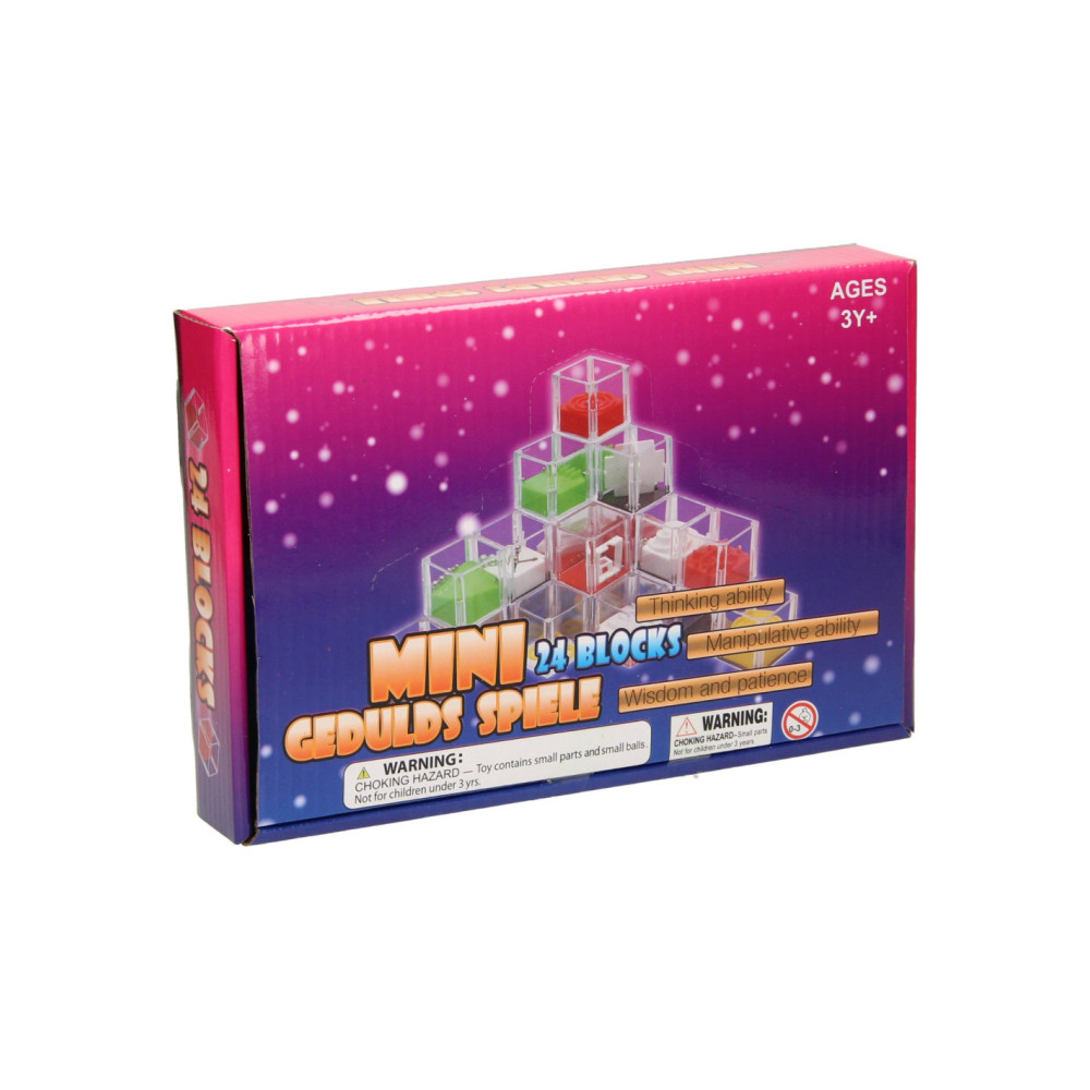 Set met 24 geduldspelletjes in de vorm van kubussen. In elke kubus zit een ander geduldspelletje. De kubussen hebben een afmeting van 4,7 x 4,7 x 4,7cm. De verpakking is 24 x 16 x 4 cm groot.