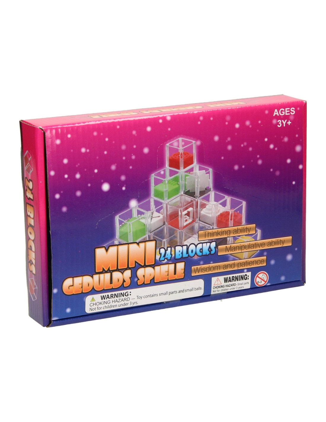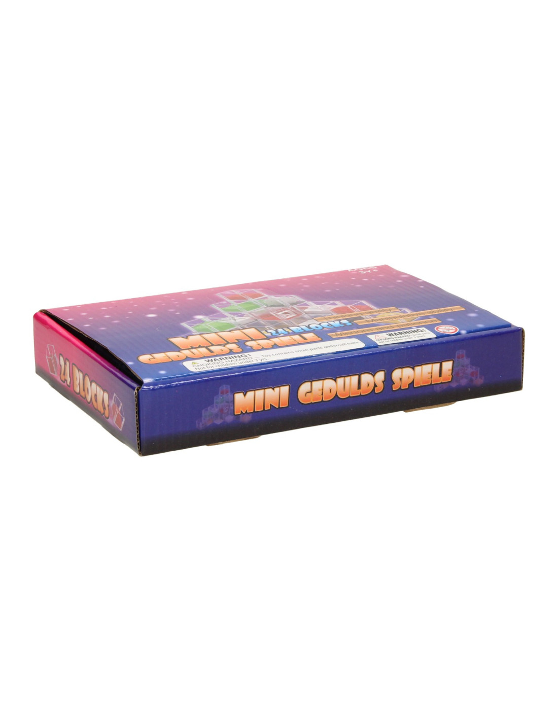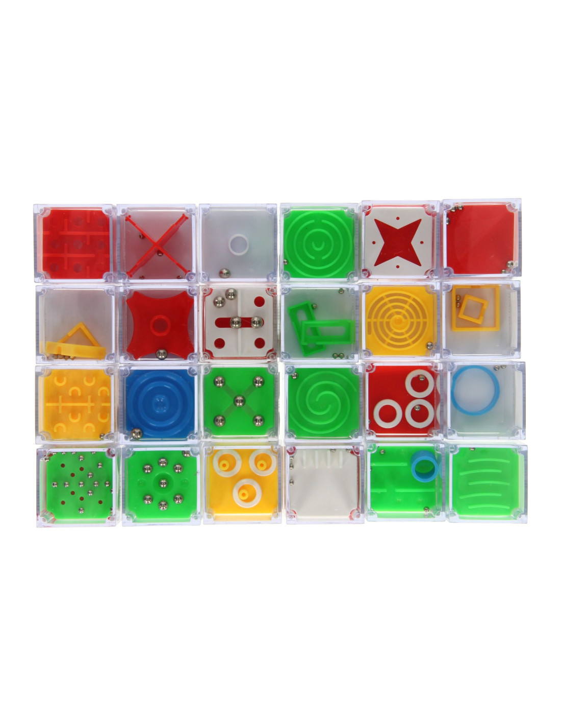 Set met 24 geduldspelletjes in de vorm van kubussen. In elke kubus zit een ander geduldspelletje. De kubussen hebben een afmeting van 4,7 x 4,7 x 4,7cm. De verpakking is 24 x 16 x 4 cm groot.