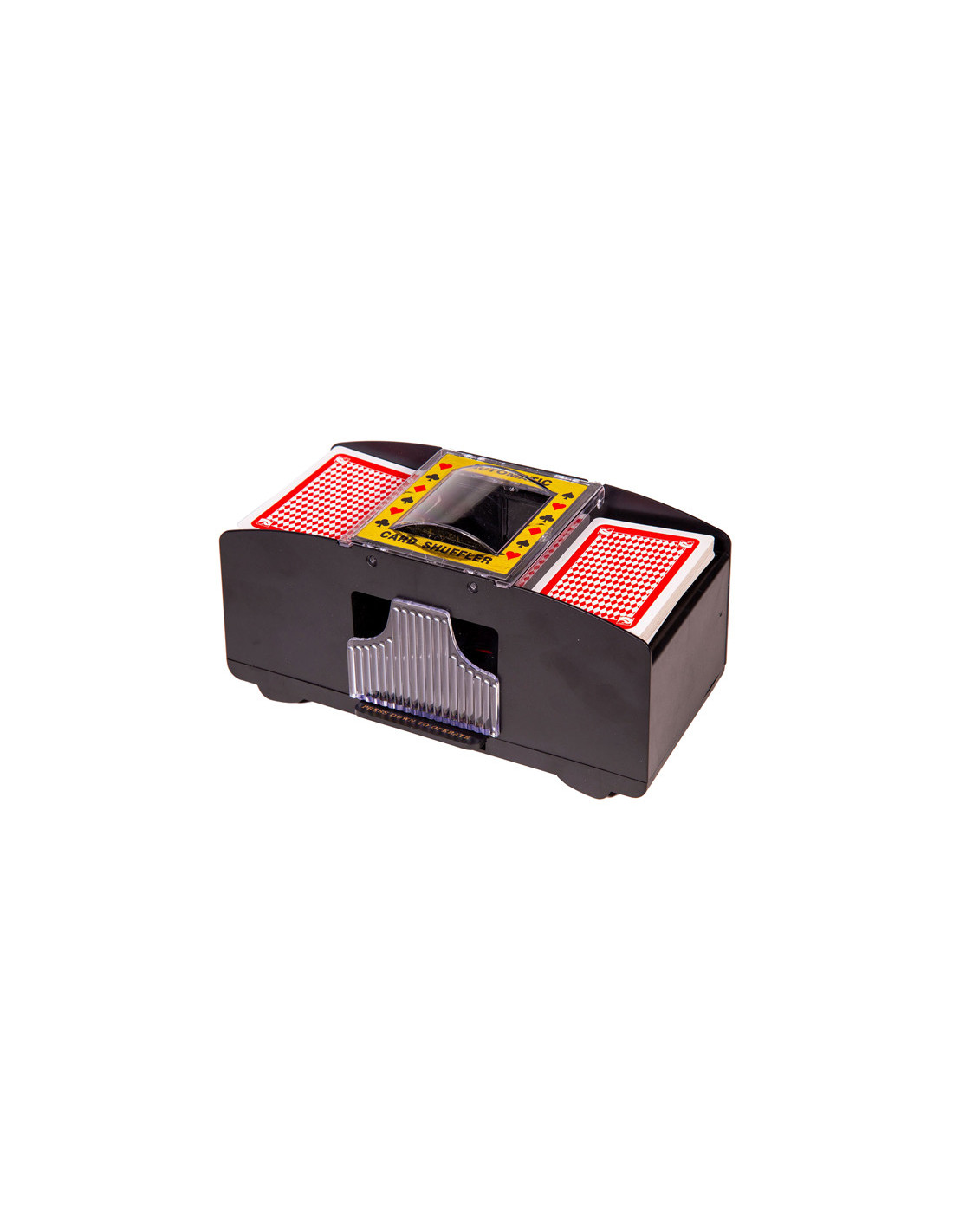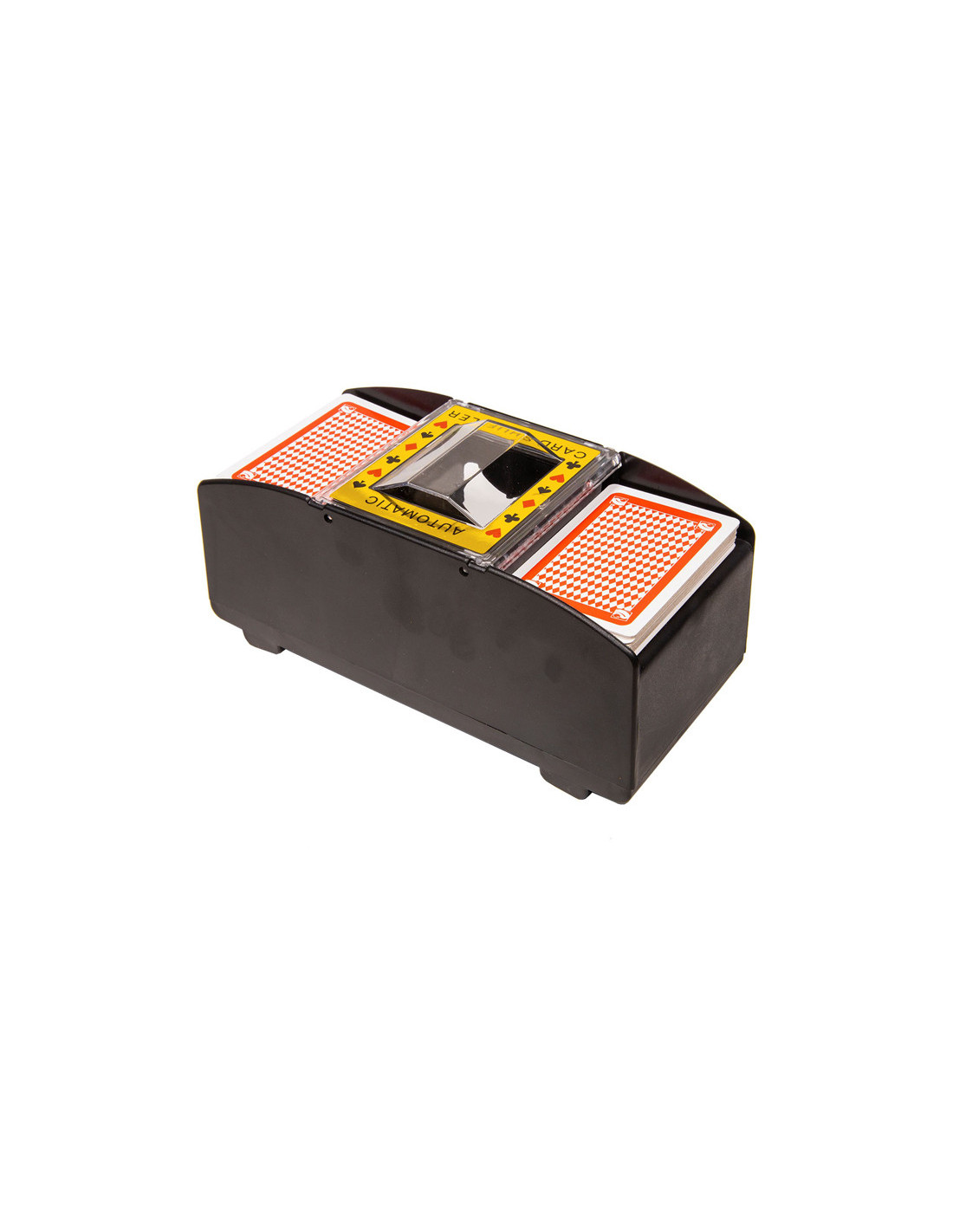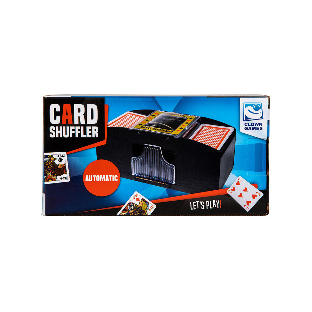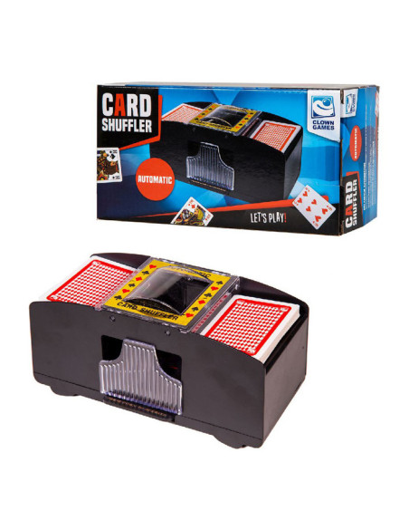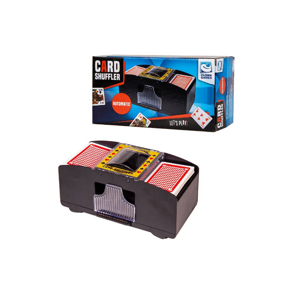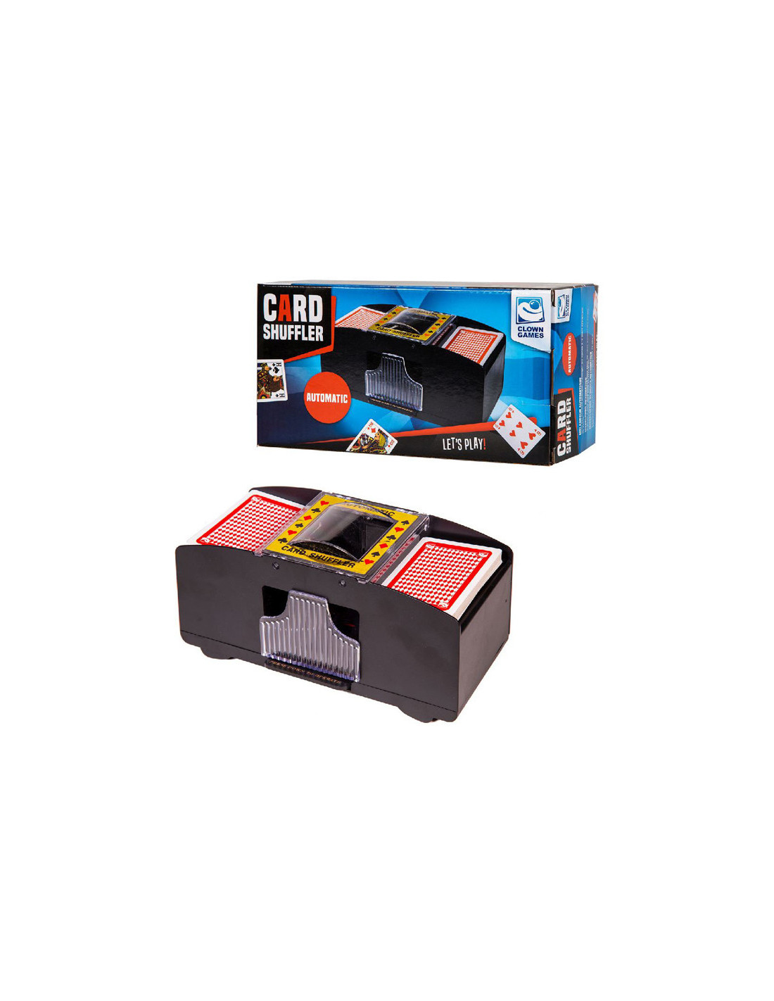 Automatische kaartenschudmachine van Clown Games. Dankzij dit handige apparaatje is schudden met de hand verleden tijd. Dit scheelt moeite, maar voorkomt ook discussie over of de kaarten wel goed geschud zijn! Leg de kaarten op beide zijden van het apparaat, druk op de knop en laat de machine z'n gang gaan. De geschudde kaarten komen onderin het bakje te liggen. Let op: de speelkaarten zijn niet inbegrepen. Wordt exclusief 4 AA-batterijen geleverd in full-colour doosje.