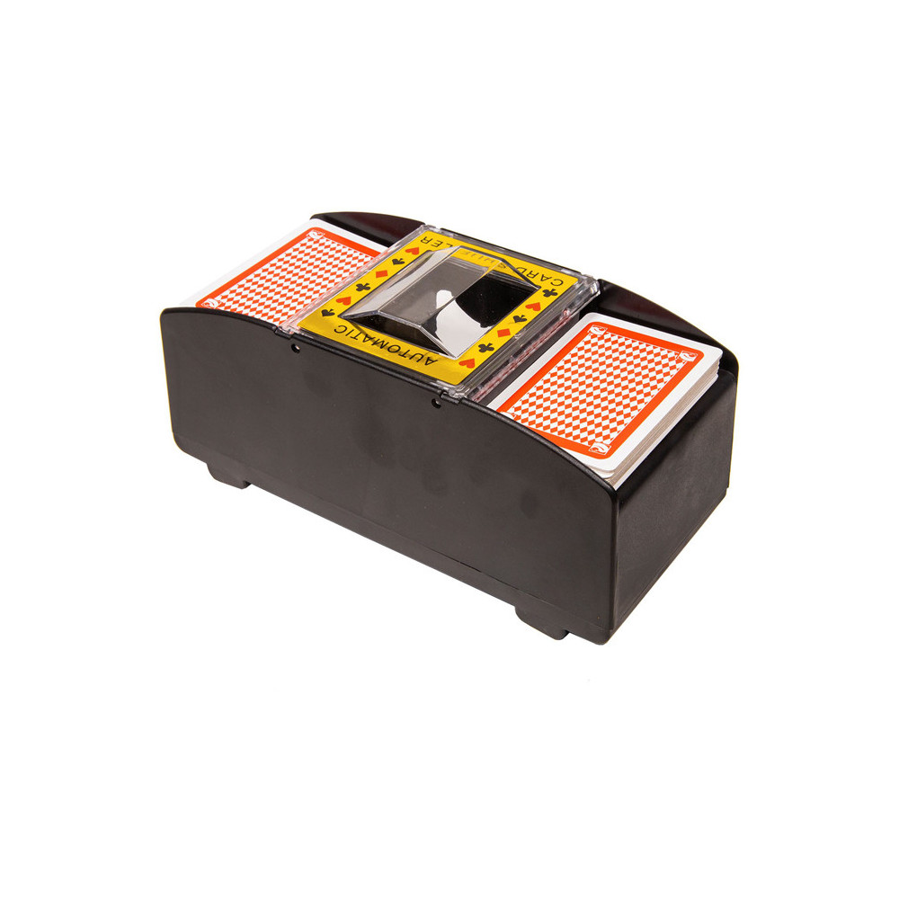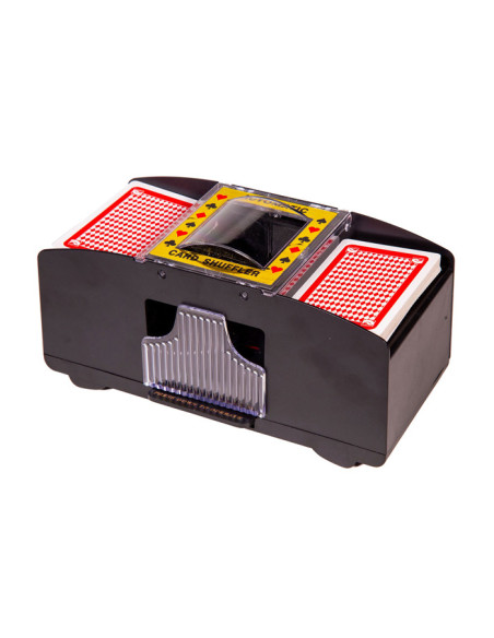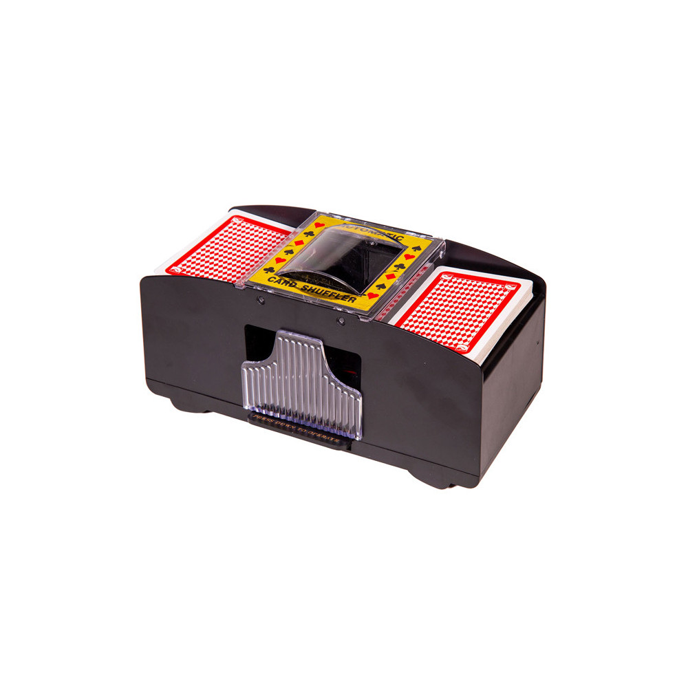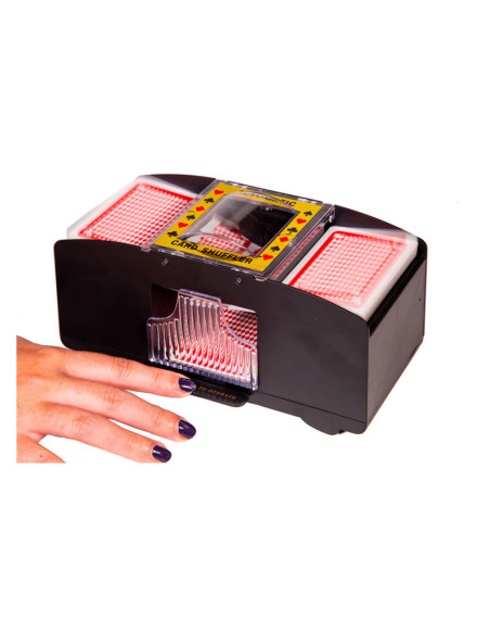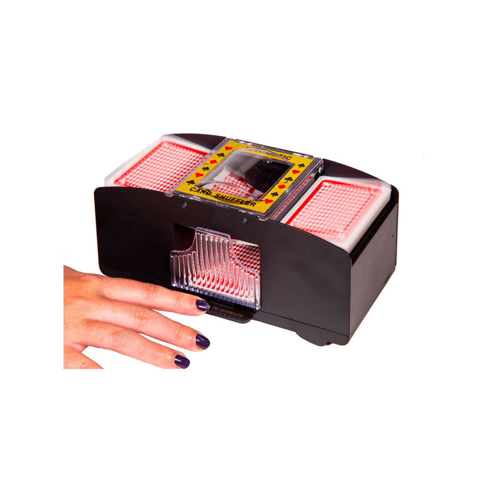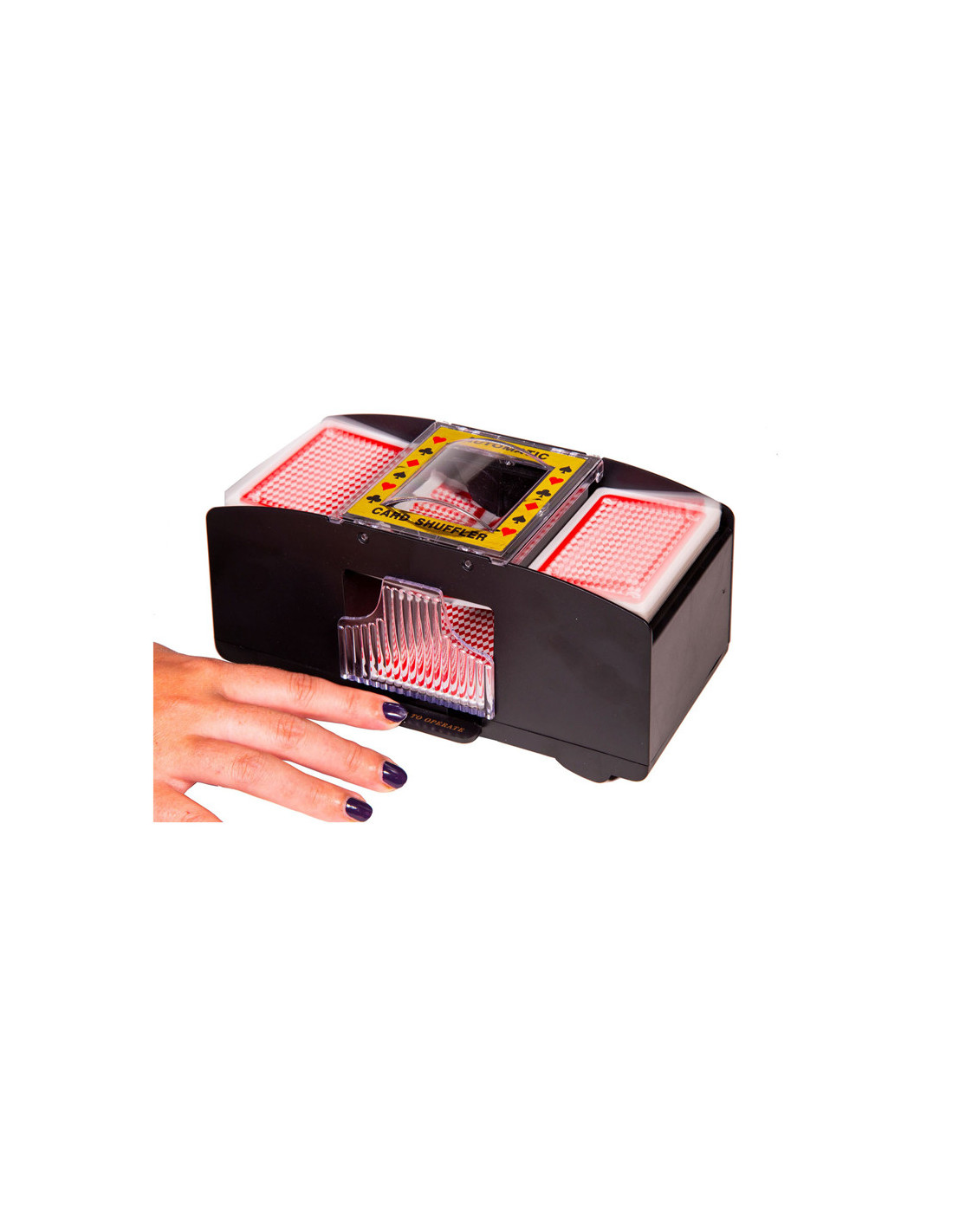 Automatische kaartenschudmachine van Clown Games. Dankzij dit handige apparaatje is schudden met de hand verleden tijd. Dit scheelt moeite, maar voorkomt ook discussie over of de kaarten wel goed geschud zijn! Leg de kaarten op beide zijden van het apparaat, druk op de knop en laat de machine z'n gang gaan. De geschudde kaarten komen onderin het bakje te liggen. Let op: de speelkaarten zijn niet inbegrepen. Wordt exclusief 4 AA-batterijen geleverd in full-colour doosje.
