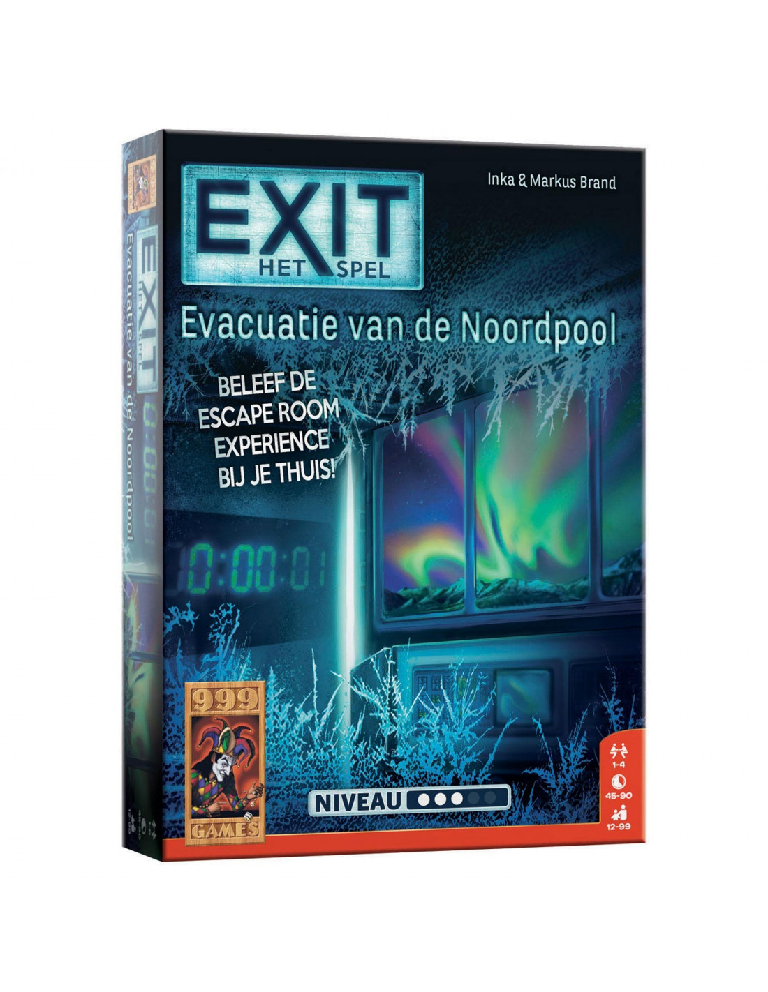 Met EXIT - Evacuatie van de Noordpool beleef je de escaperoom beleving bij je thuis. Je bent een lid van het onderzoeksteam op de Noordpool. Maar plotseling gaat het evacuatie-alarm af. Je merkt op dat de deur al automatisch vergrendeld is en hoort via de intercom dat het naburig laboratorium verwoest is. Wat kan er aan de hand zijn? Tijdens je ontsnappingstocht stuit je op een notitieboek waarin staat dat je nog maar weinig tijd over is om te ontsnappen. Gaat het jou lukken om ooit weer in de buitenlucht te staan? Dit spel kan gespeeld worden door 1-4 spelers en is geschikt vanaf 12 jaar.