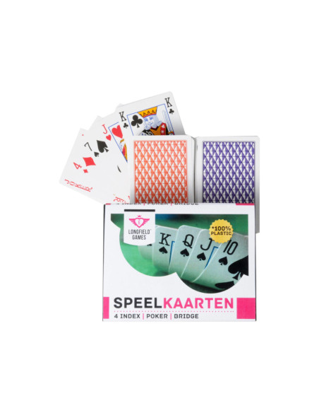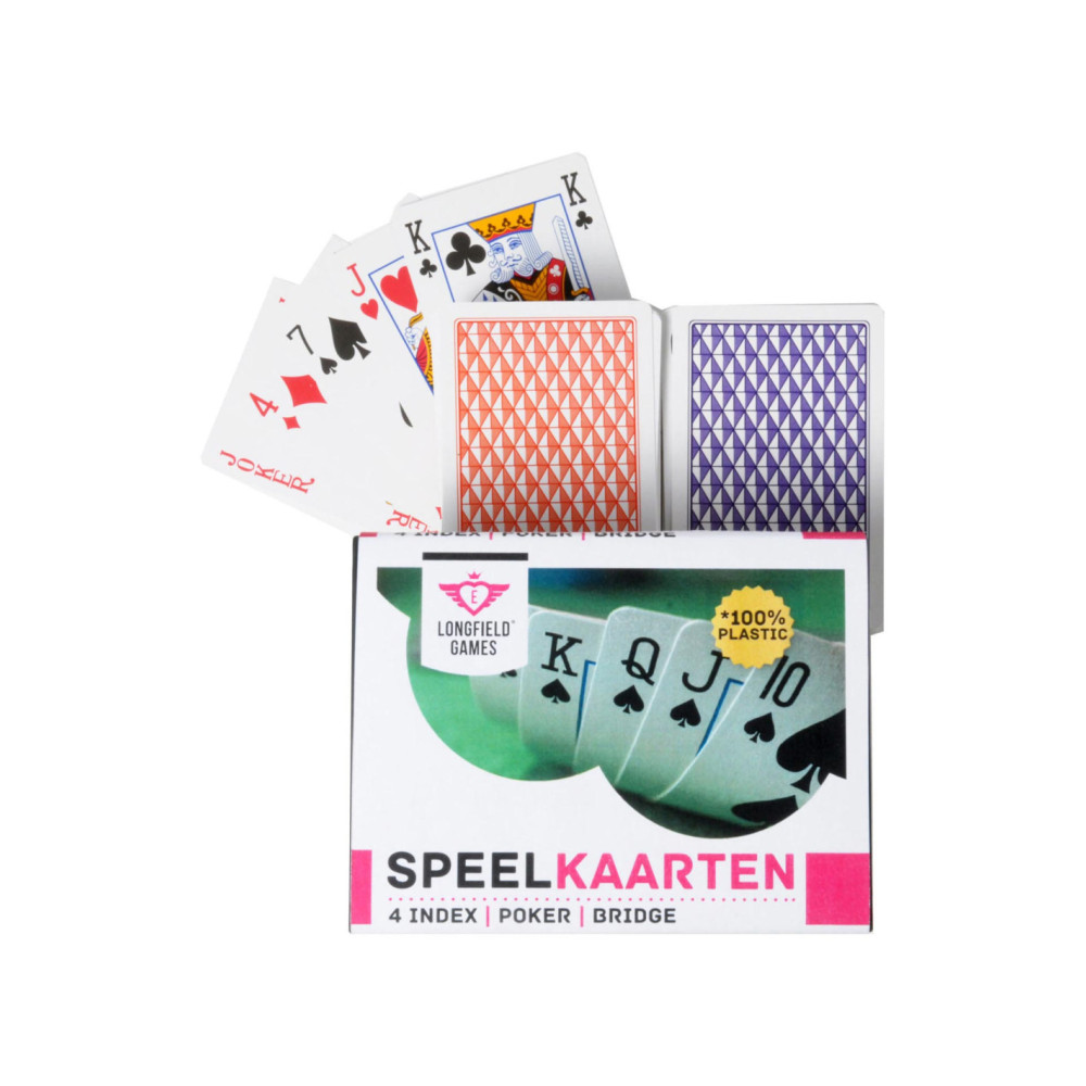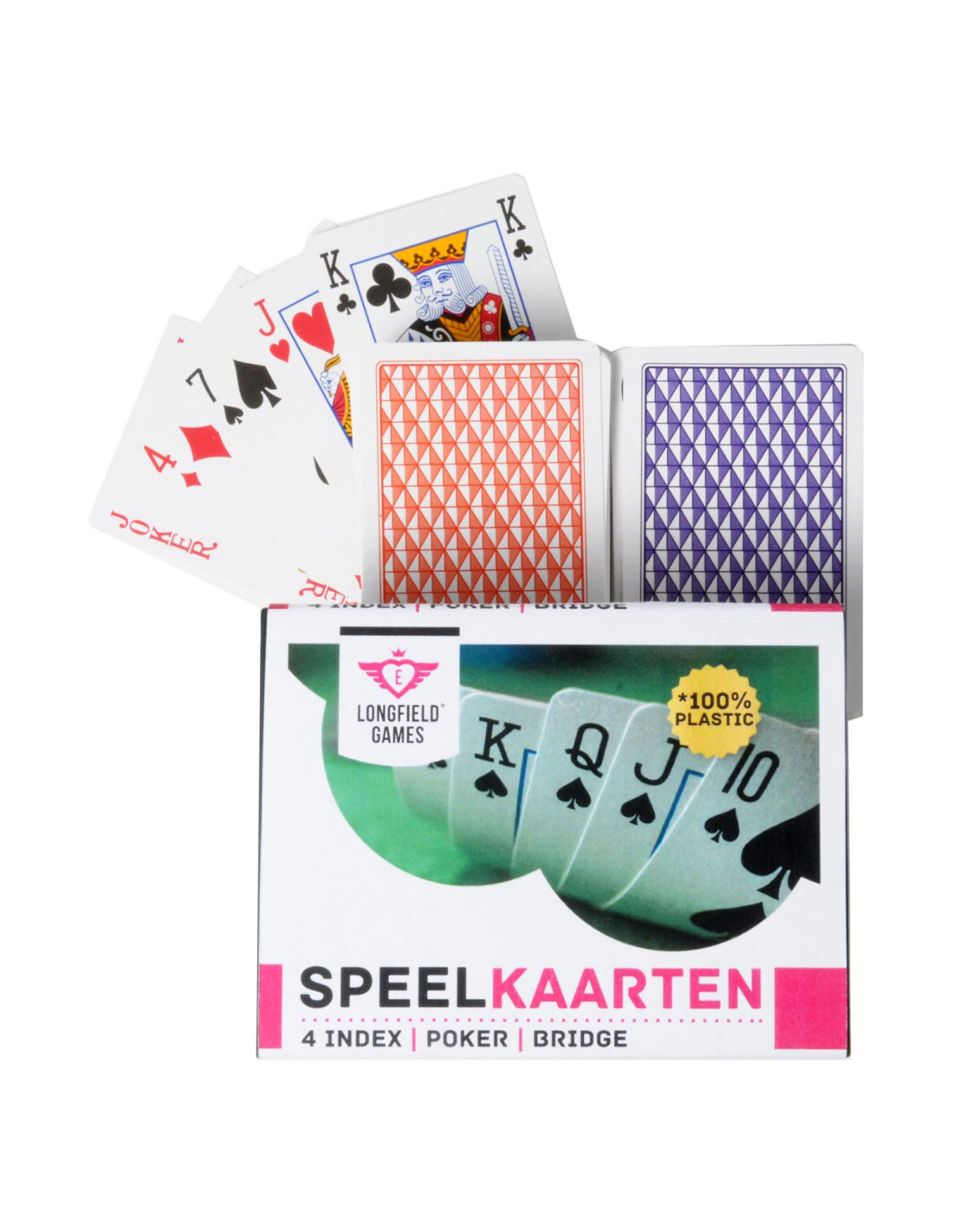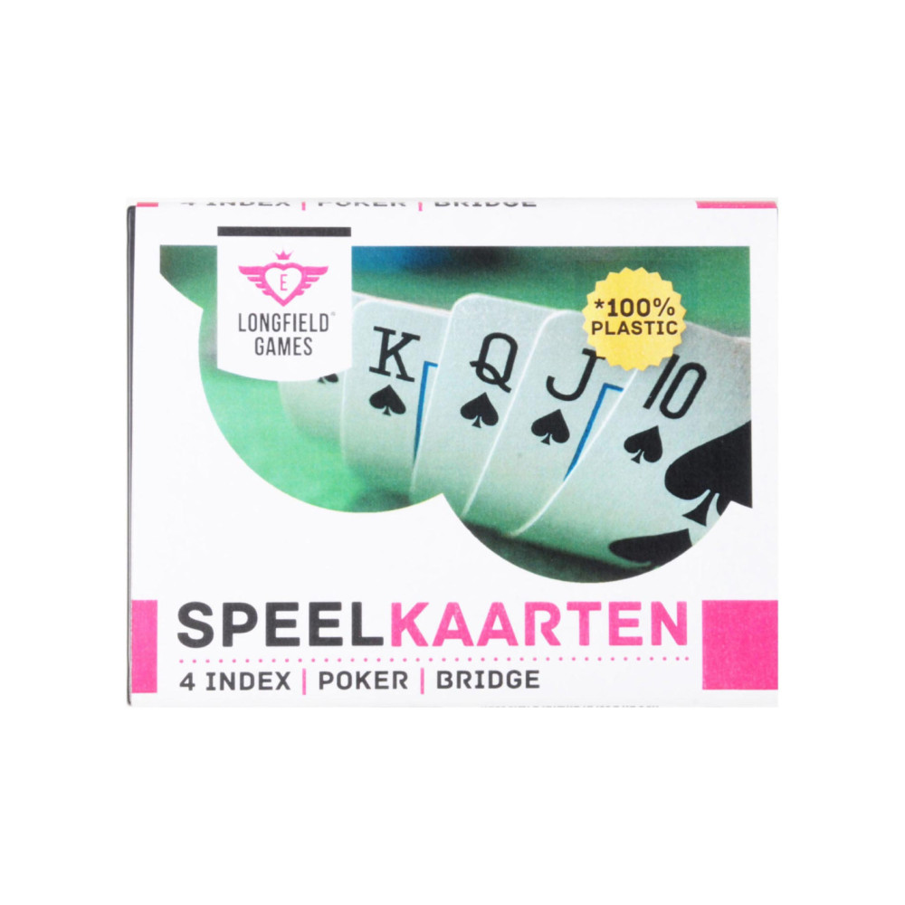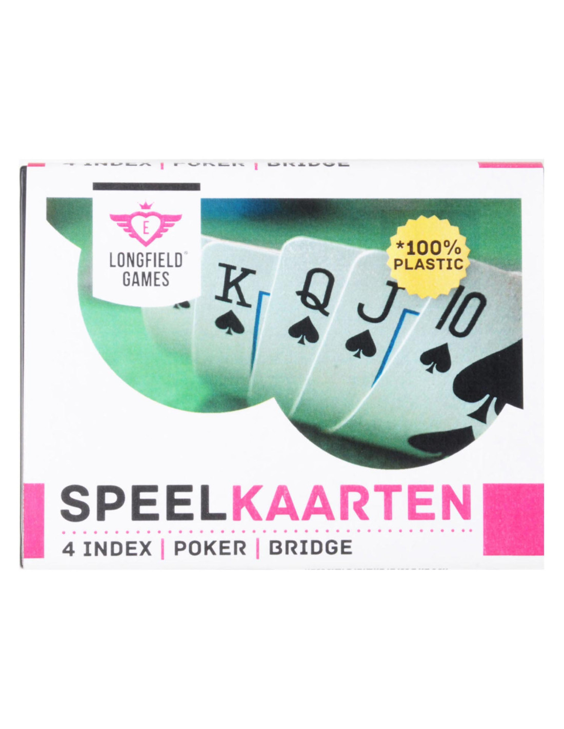 Plastic speelkaartenset van Longfield met extra grote letters. De kaarten zitten in een plastic doosje.