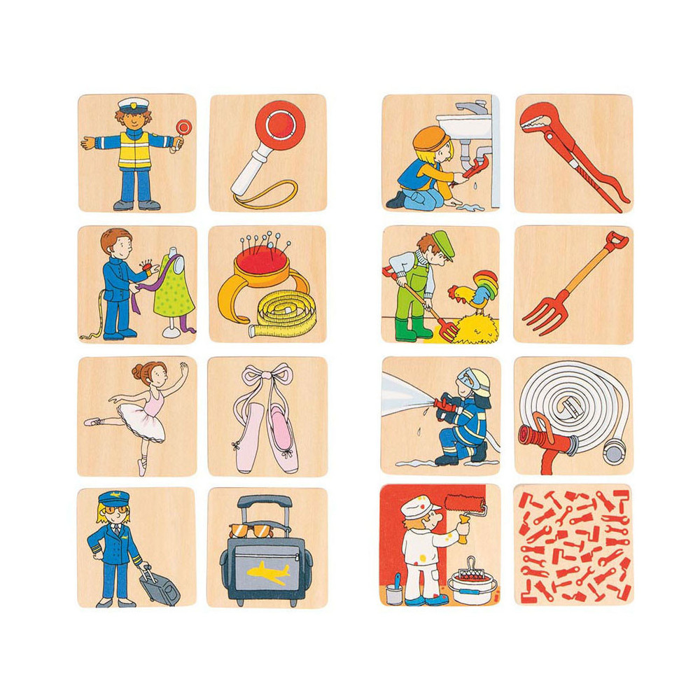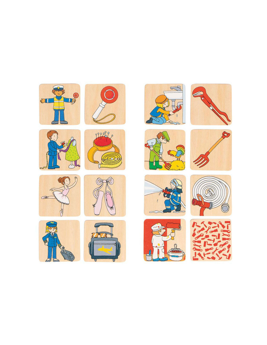De politieagent heeft een signaalschijf nodig, de brandweerman heeft een brandslang nodig en de fotograaf heeft een camera nodig. Het typische beroepsartikelen moet aan de juiste persoon van een beroepsgroep worden toegewezen. Dat betekent weten wat bij elkaar hoort en natuurlijk waar de kaarten liggen. Leren, spelen en plezier maken horen onlosmakelijk bij elkaar in dit 32-delige memospel.