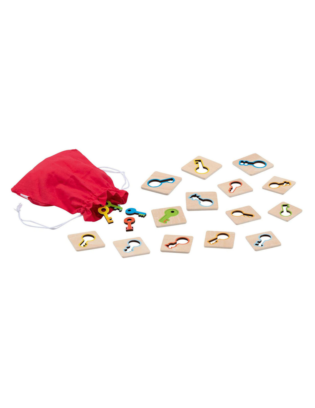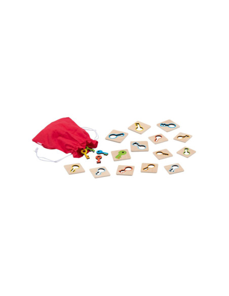 Houten Memospel van Goki. Match de juist sleutel met het tegeltje. Elke tegel heeft een gekleurde voor beginners en een blanco kant voor de gevorderde spelers. De tegeltjes zelf zijn 5 x 5 centimeter groot en het is geschikt voor kinderen vanaf 3 jaar.