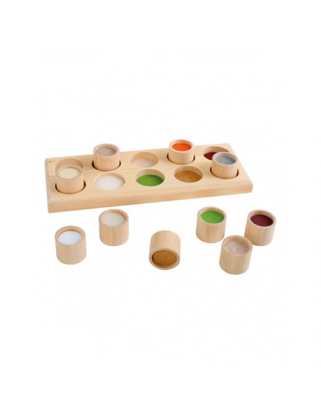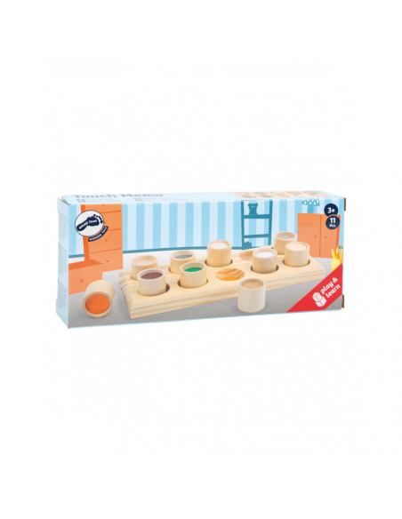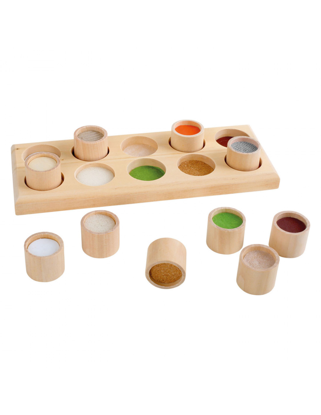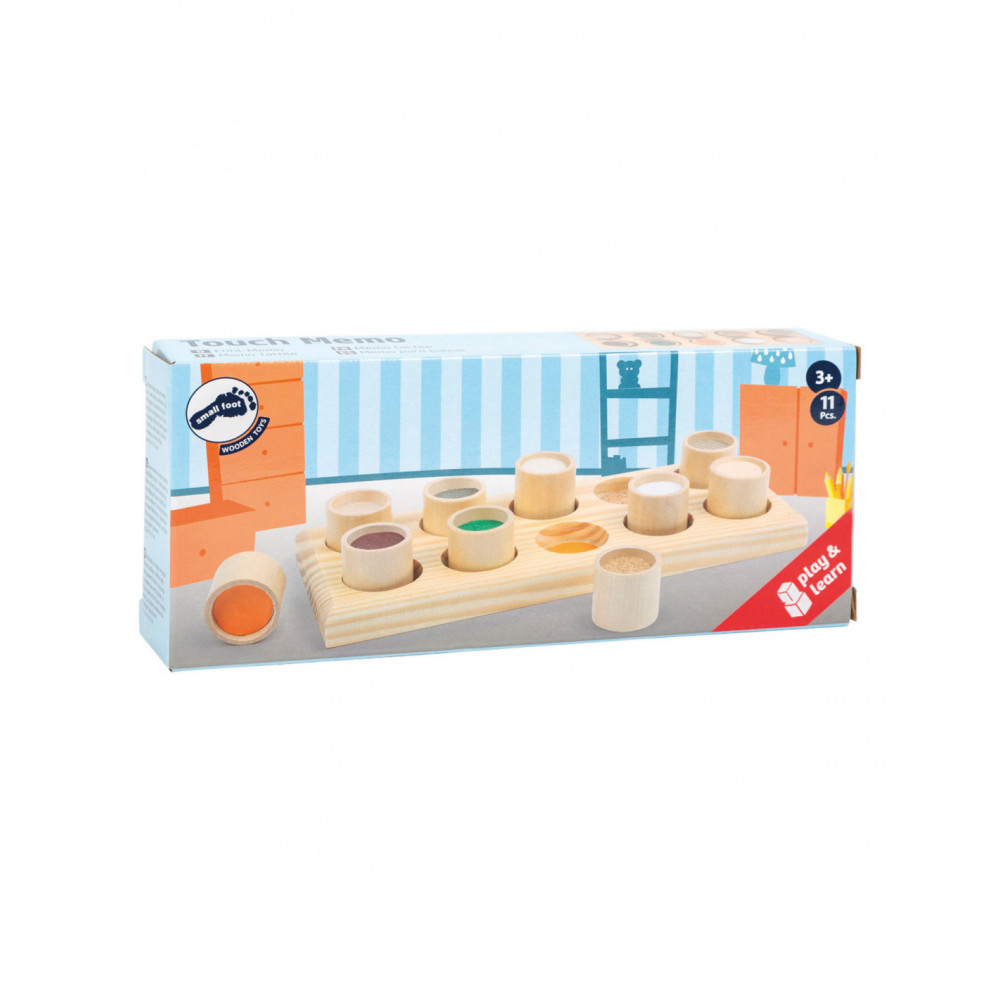 Herken kleuren en raak verschillende oppervlakken aan. De uitdaging van dit aanraakgeheugenspel is om vergelijkbare objecten bij elkaar te zoeken door de materialen te voelen.