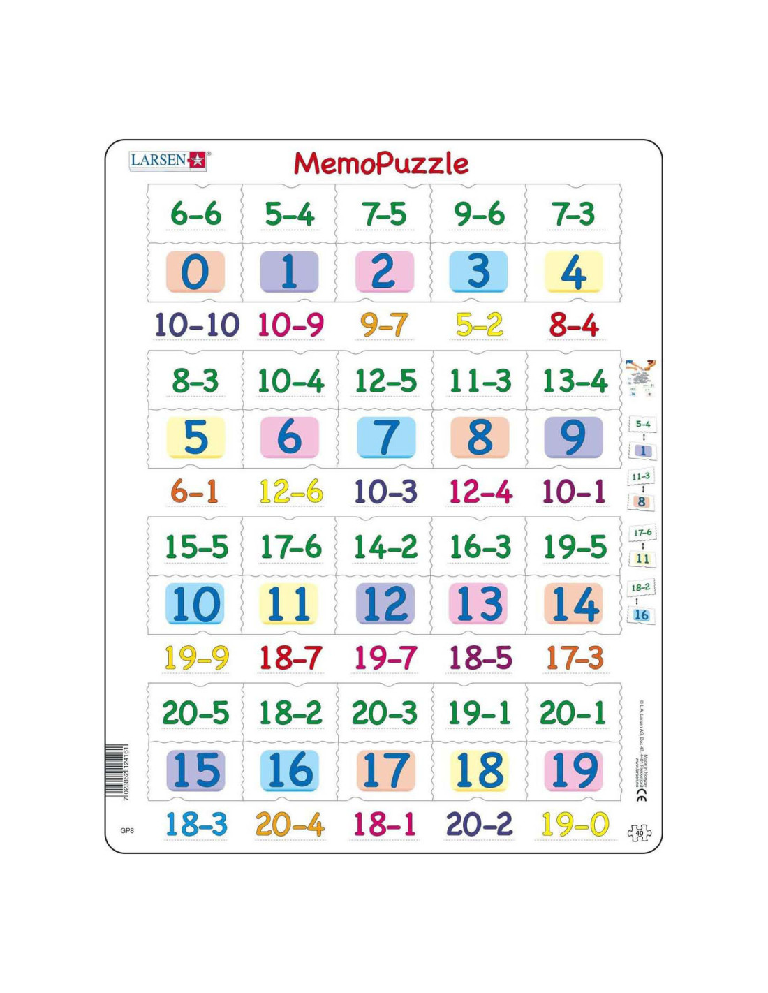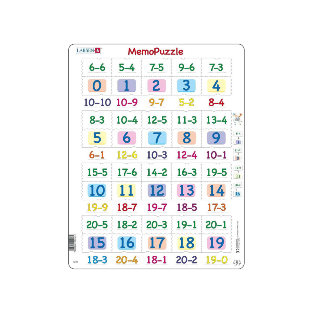 De puzzels van Larsen hebben een frame waarin de puzzelstukjes keer op keer makkelijk gelegd kunnen worden. De puzzelstukjes hebben elk een eigen unieke vorm die maar op één plek in het frame past. Doordat de totale dikte van het gerecyclede karton van de Larsen puzzels 4,4 mm dik is, gaat deze jaren mee. In het thema Larsen Educatieve Puzzels' zijn diverse educatieve frame puzzels beschikbaar. Biologie, wiskunde, aardrijkskunde, leren schrijven, leren klokkijken, etc. Waarom Larsen?- De jongste kinderen ontwikkelen hun motoriek met de unieke puzzelstukjes.- Ook oudere kinderen spelen en leren veel over interessante thema's. - Originele thema's moedigen de kinderen aan en helpen hen zich te concentreren. - Extra dikke en stevige puzzelstukjes. - Gemaakt in Europa van gerecycled karton.