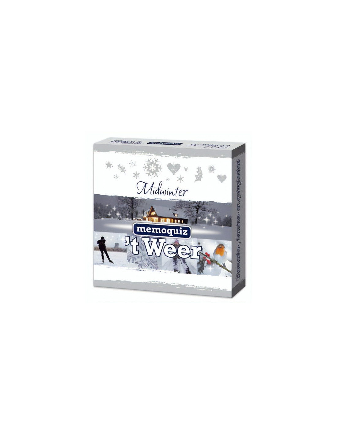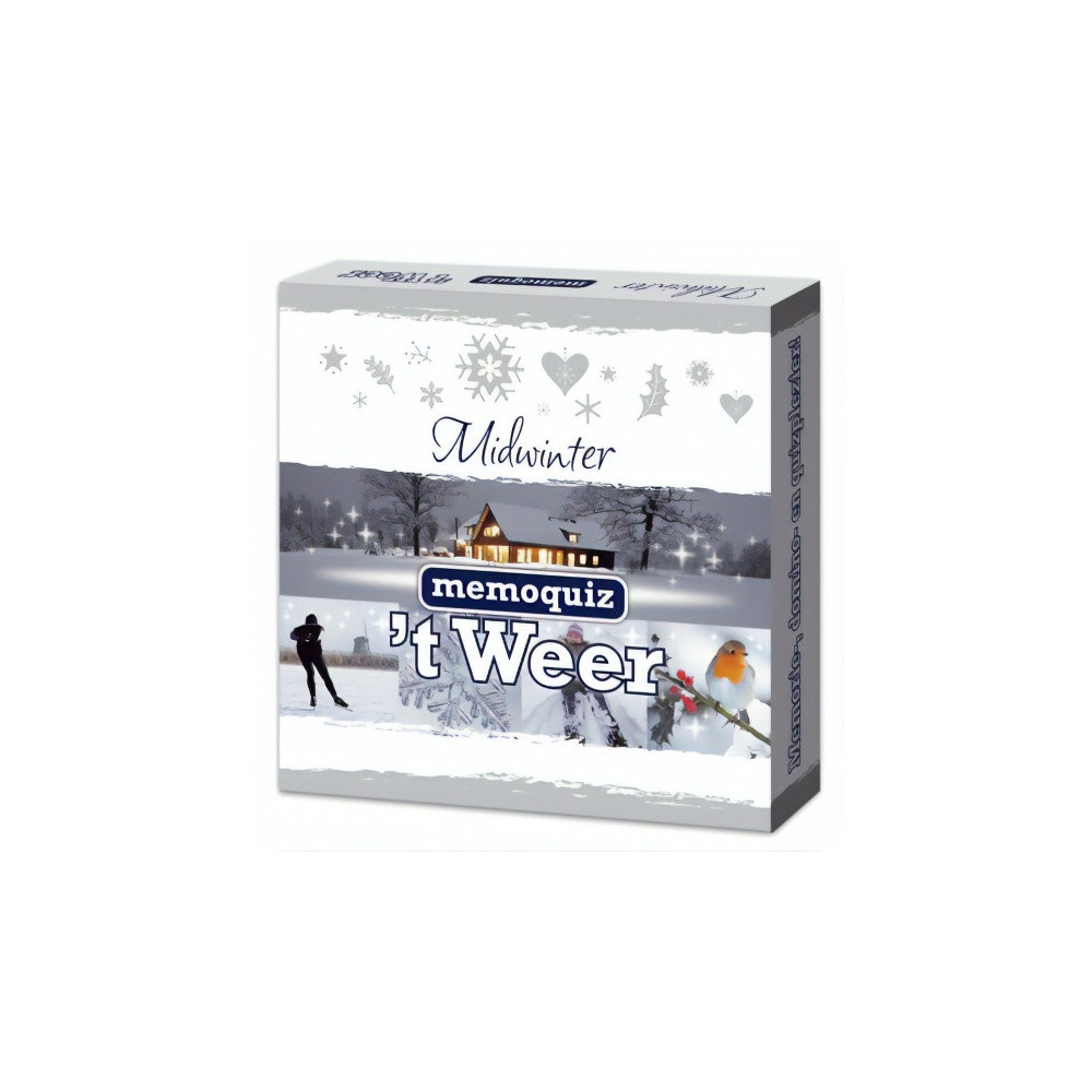 Nova Carta 't Weer memoquiz Memoquiz 't Weer is één van de gezelschapsspellen uit de memoquiz -serie van Nova Carta en past perfect in de Bickery-lijn 'Midwinter'. Een speler draait twee fotokaarten om. Sluit een plaatje van het ene kaartje aan op een plaatje van het andere kaartje, dan mag hij een vraag beantwoorden. Bij een goed antwoord mag hij de fotokaartjes houden. De speler met de meeste fotokaartjes is de winnaar! Specificaties: Kleur: wit Geslacht: junior, unisex Materiaal: karton Taal: Nederlands Aantal spelers: 2 tot 5 spelers Spelduur: ca. 25 minuten Leeftijd: vanaf 8 jaar Inhoud: 25 Fotokaarten met 50 foto's 15 Quizkaarten met 90 vragen