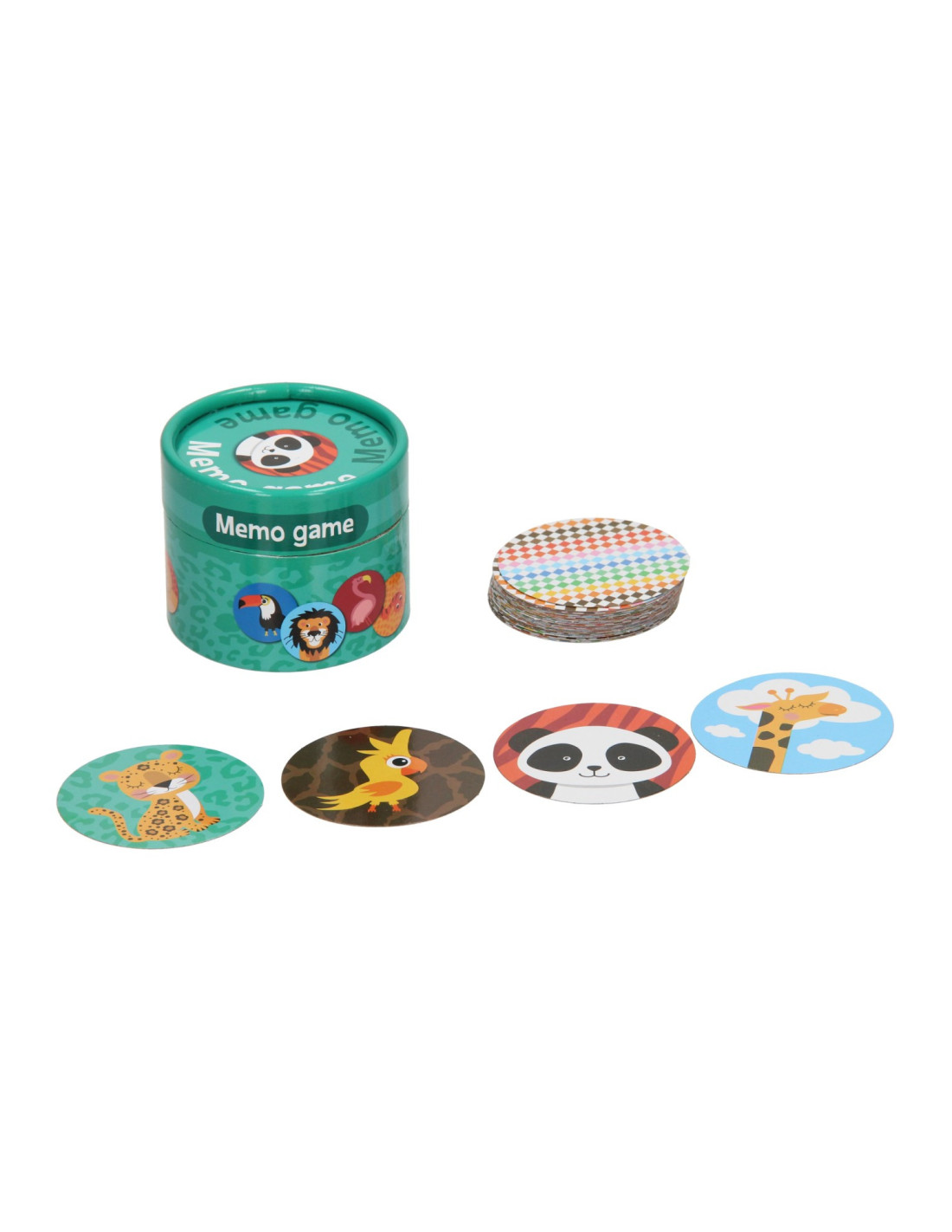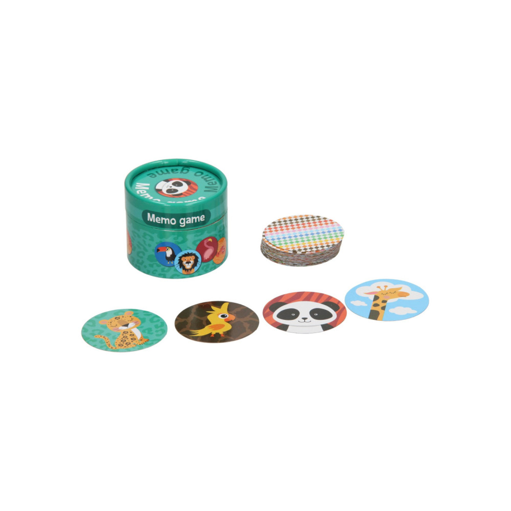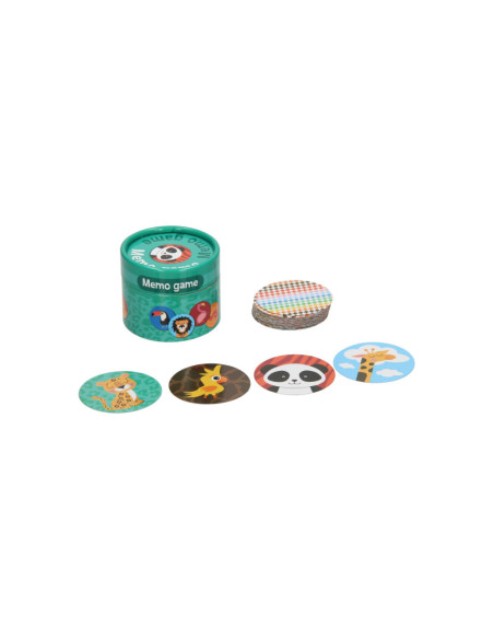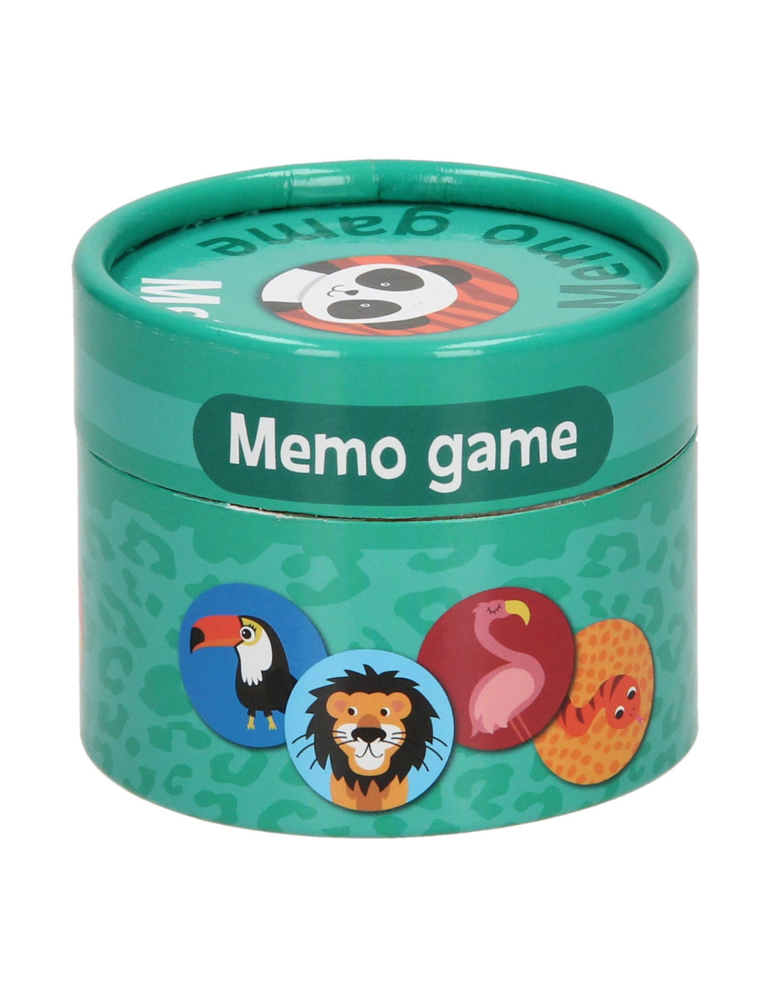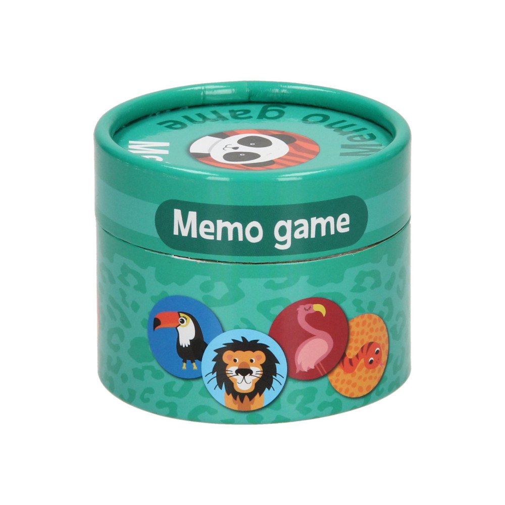 Memospel Dieren in een rond opbergdoosje. Inhoud: 32 kaarten.