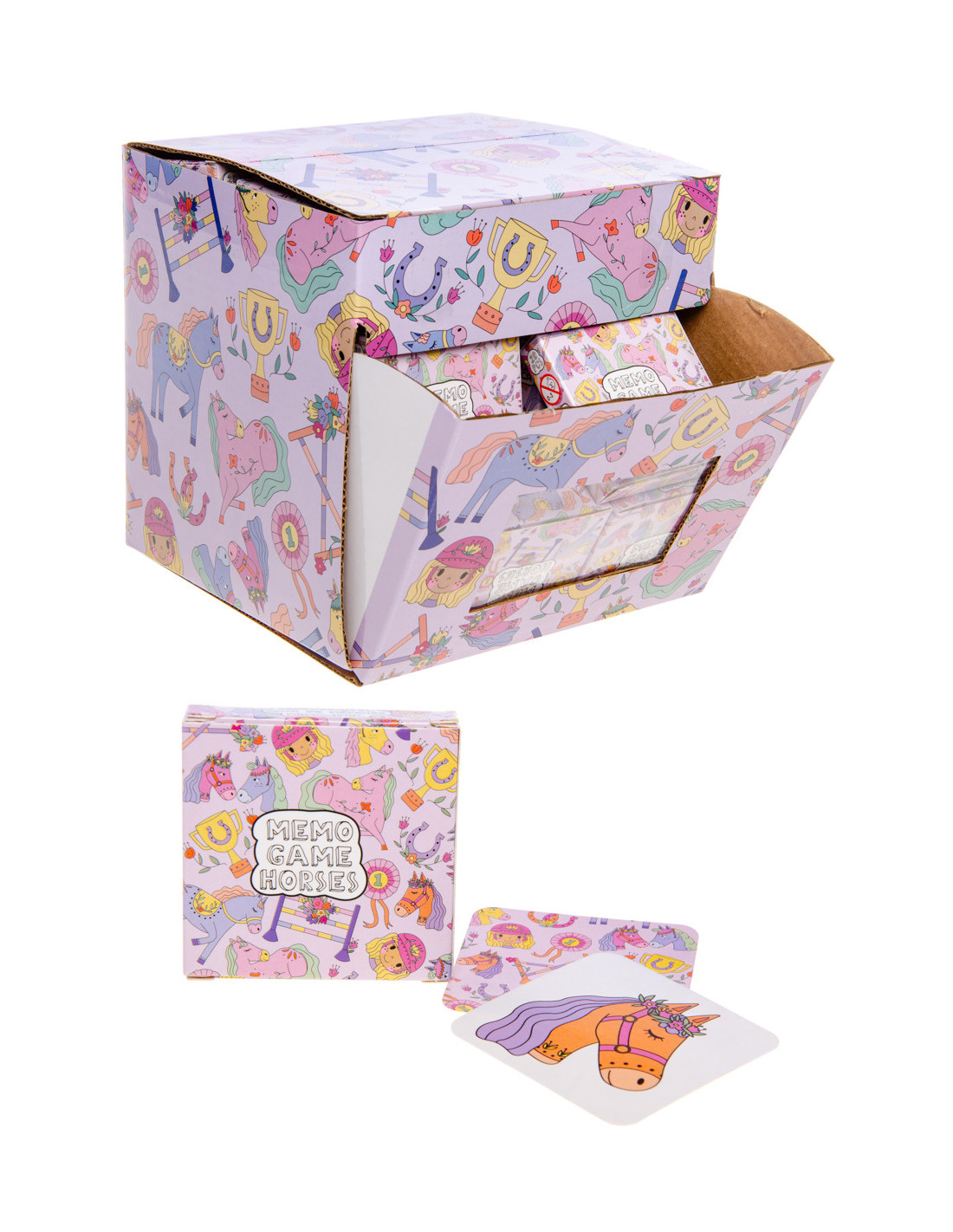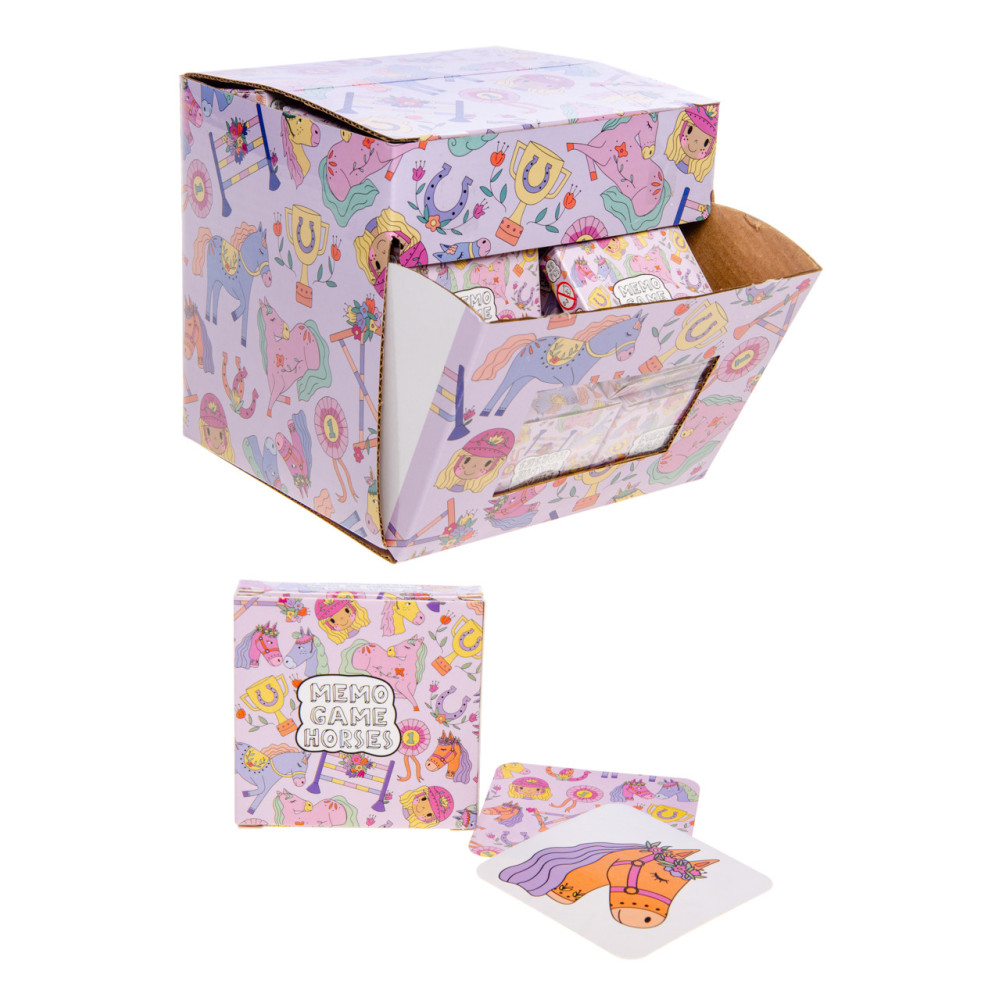 Het kartonnen memory spel mini Paarden met kaartjes van 5x5 cm is een geweldig spel voor jong en oud. Dit compact formaat maakt het ideaal voor onderweg of voor een gezellige spelletjesavond thuis. Het 28-delige memoryspel biedt urenlang plezier en helpt bij het verbeteren van het geheugen en de concentratie, terwijl het de motoriek en visuele waarneming stimuleert.