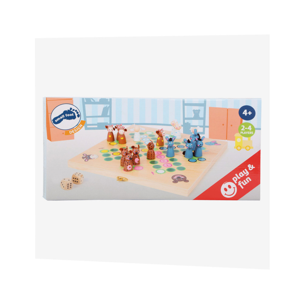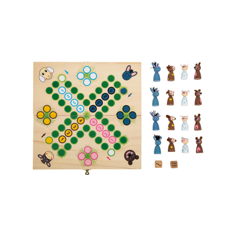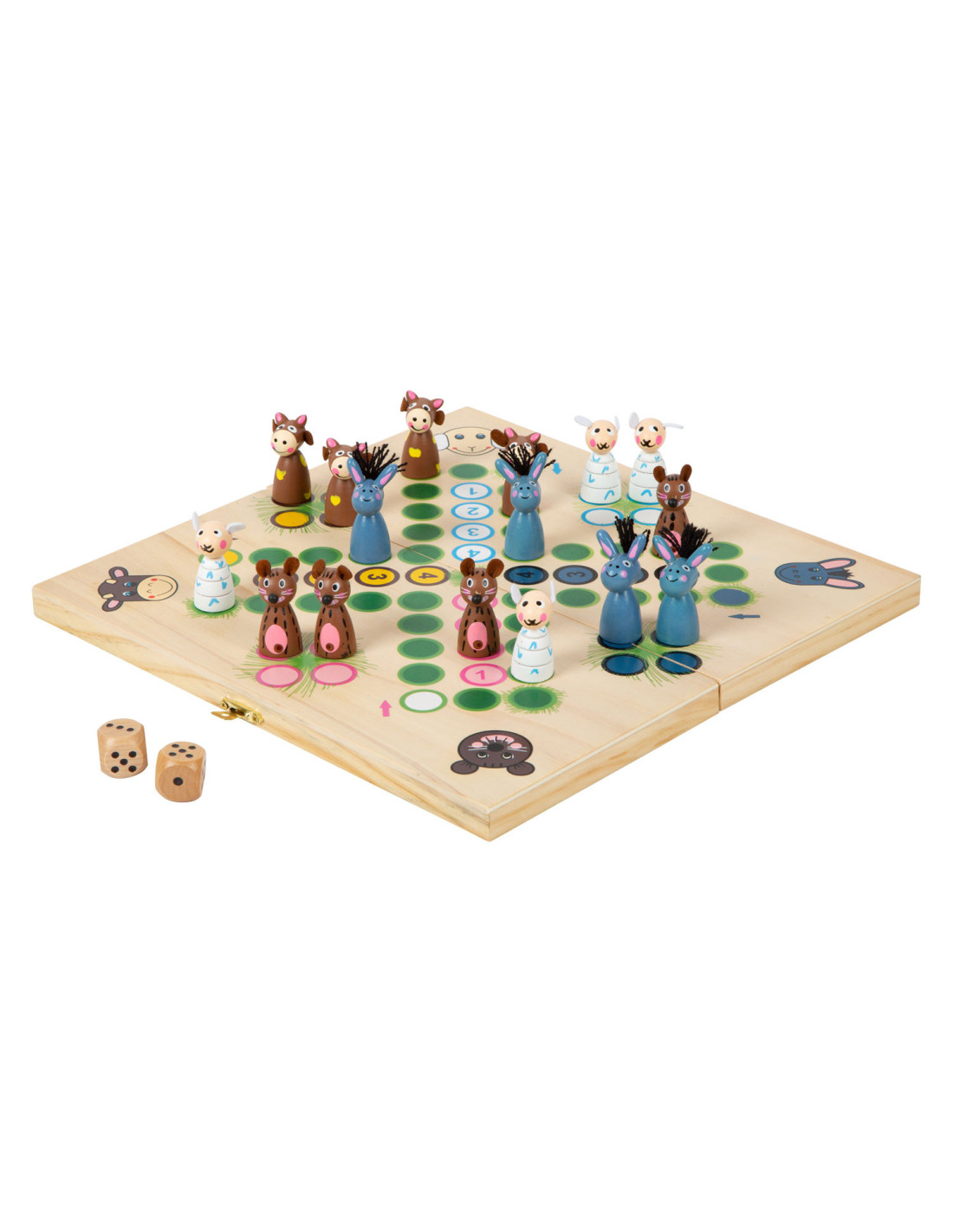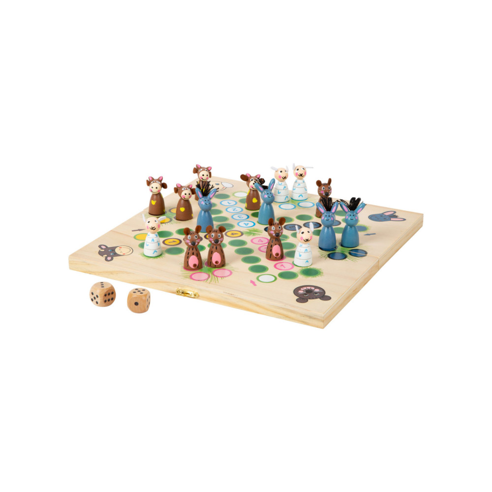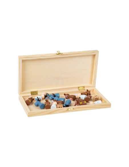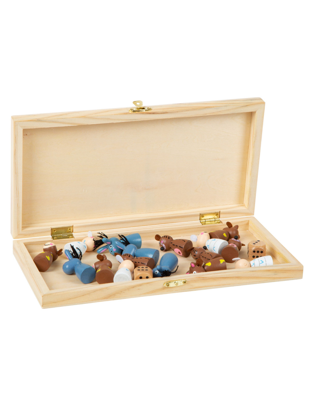 Boeee en mehhh! Vier verschillende houten boerderijdieren rennen in dit spel rond. Ze proberen allemaal als eerste hun huis te bereiken met behulp van de dobbelstenen. Door het spel te spelen, kunnen kinderen spelenderwijs hun cijfers leren en tegelijkertijd hun motoriek trainen. Speelplezier is hier voorgeprogrammeerd! De houten kist is eenvoudig af te sluiten met het clipslot, zodat hij klaar is voor de volgende gameronde.