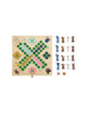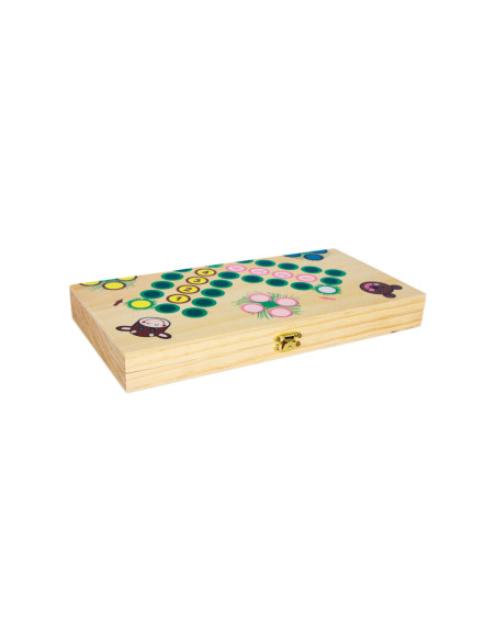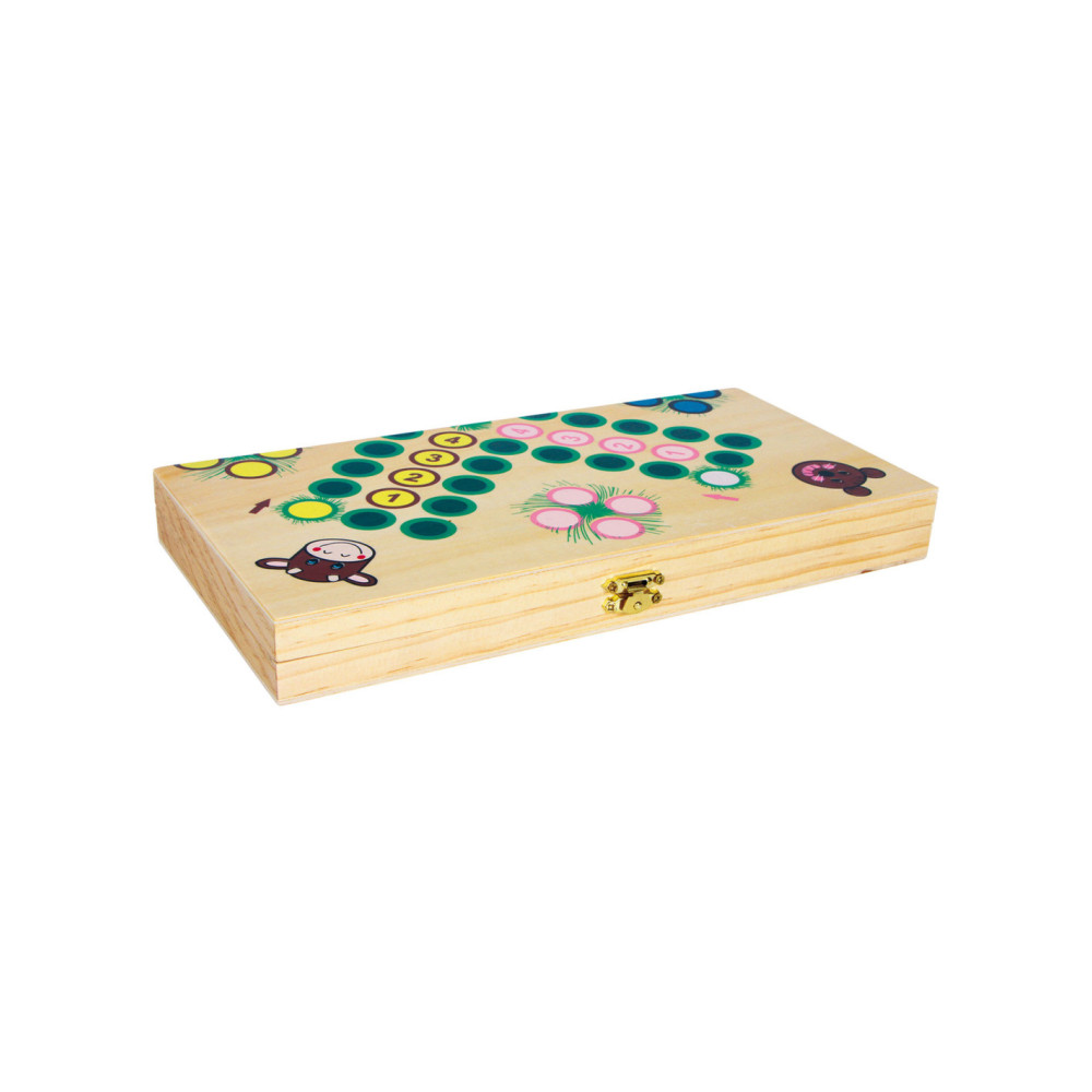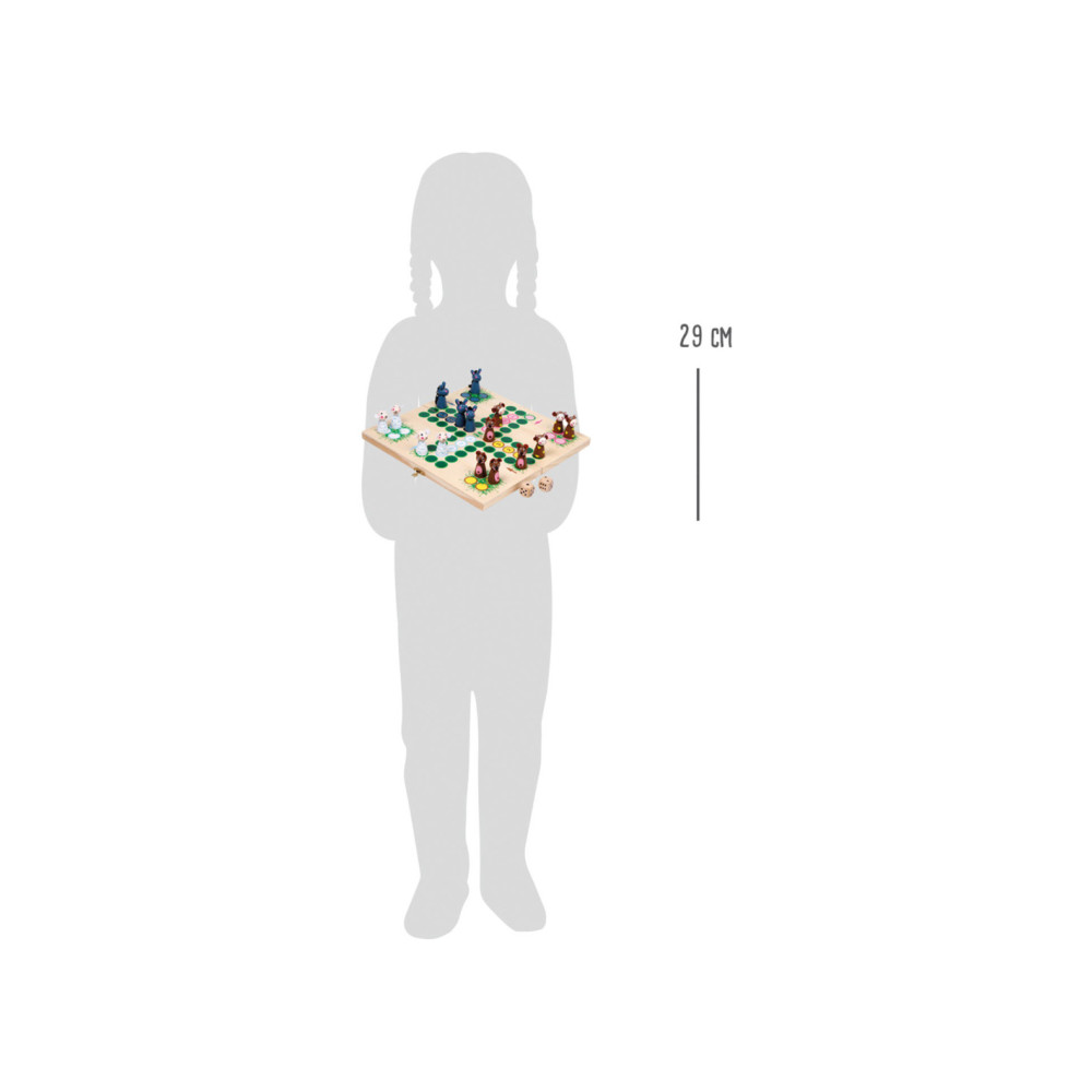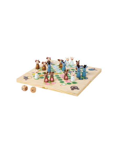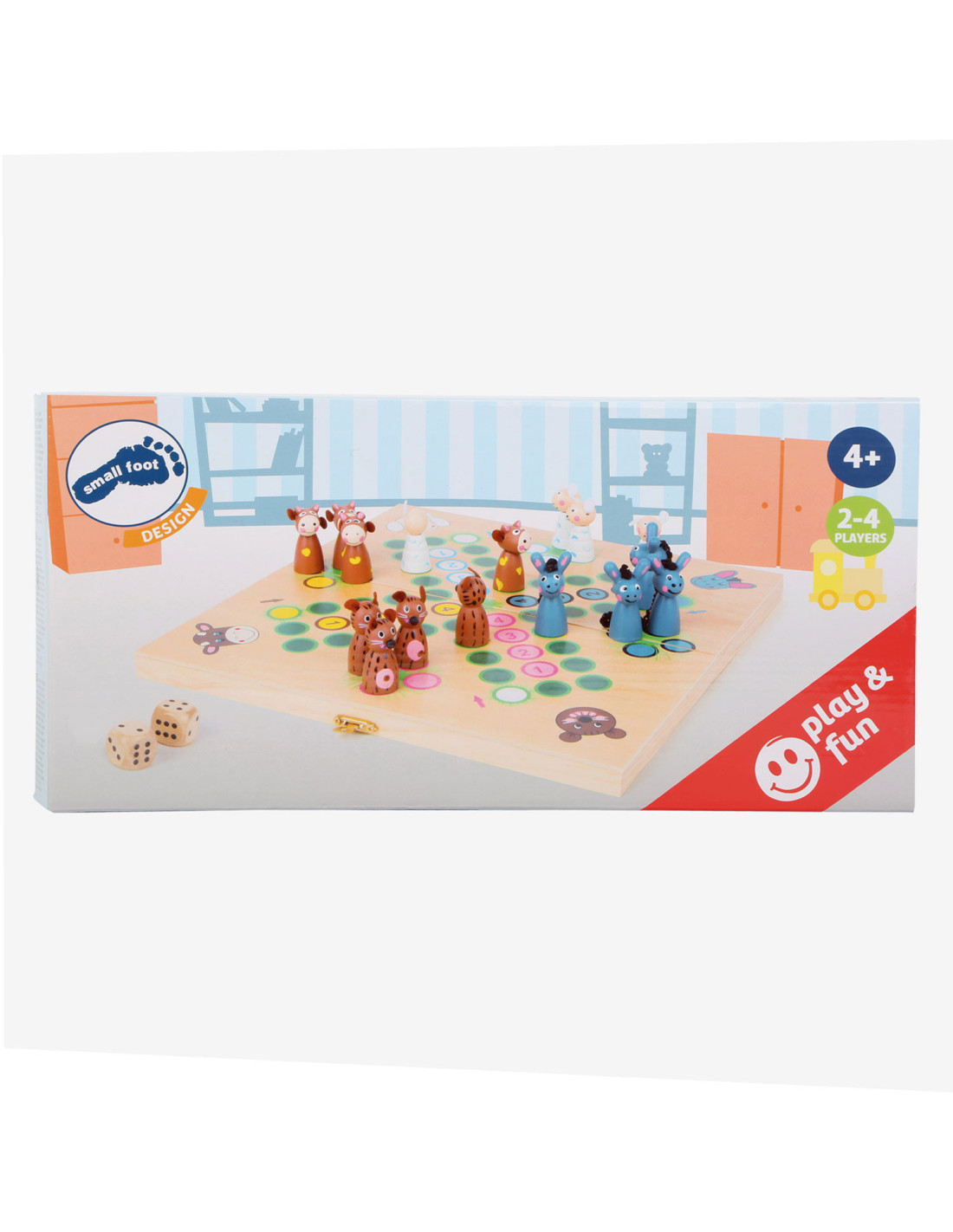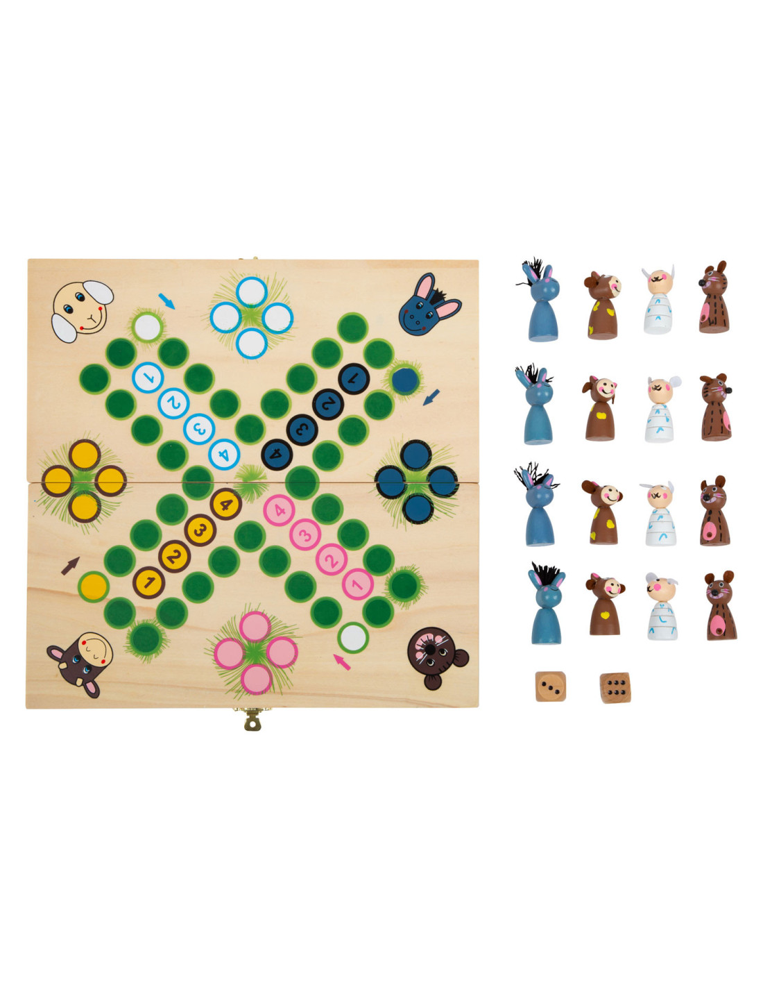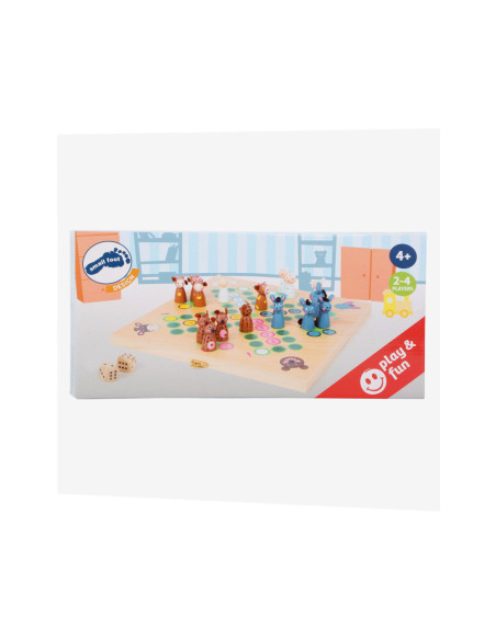 Boeee en mehhh! Vier verschillende houten boerderijdieren rennen in dit spel rond. Ze proberen allemaal als eerste hun huis te bereiken met behulp van de dobbelstenen. Door het spel te spelen, kunnen kinderen spelenderwijs hun cijfers leren en tegelijkertijd hun motoriek trainen. Speelplezier is hier voorgeprogrammeerd! De houten kist is eenvoudig af te sluiten met het clipslot, zodat hij klaar is voor de volgende gameronde.