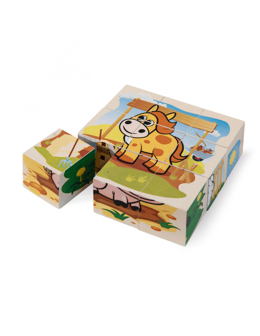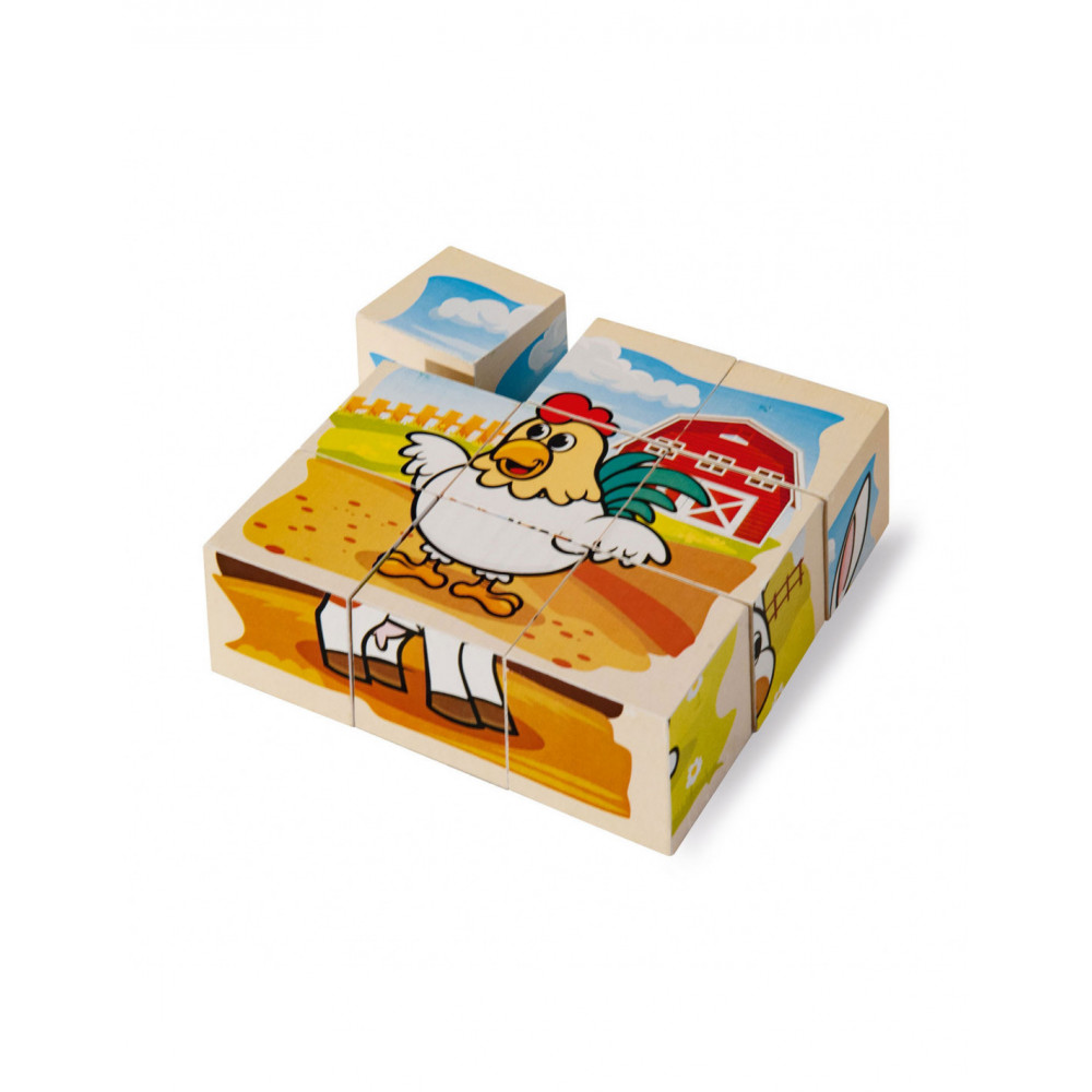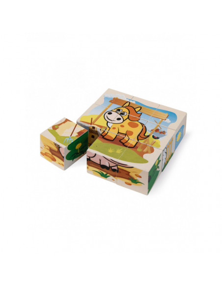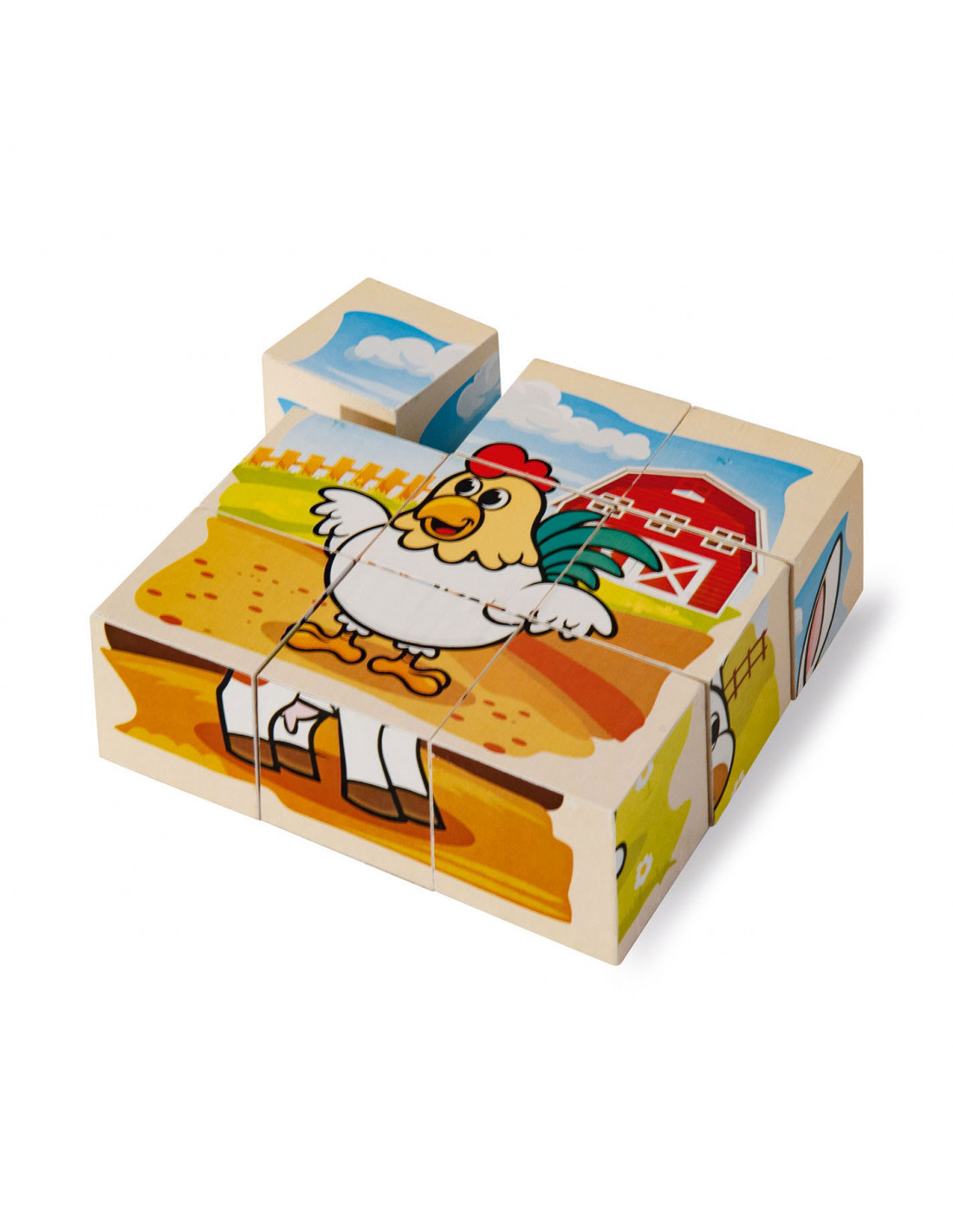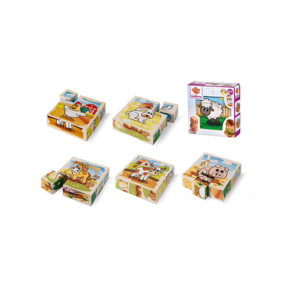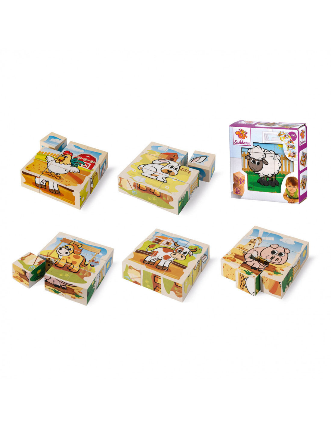 Eicchorn houten blokpuzzel boerderij met zes verschillende boerderijdieren. Het hout is 100% FSC-gecertificeerd.