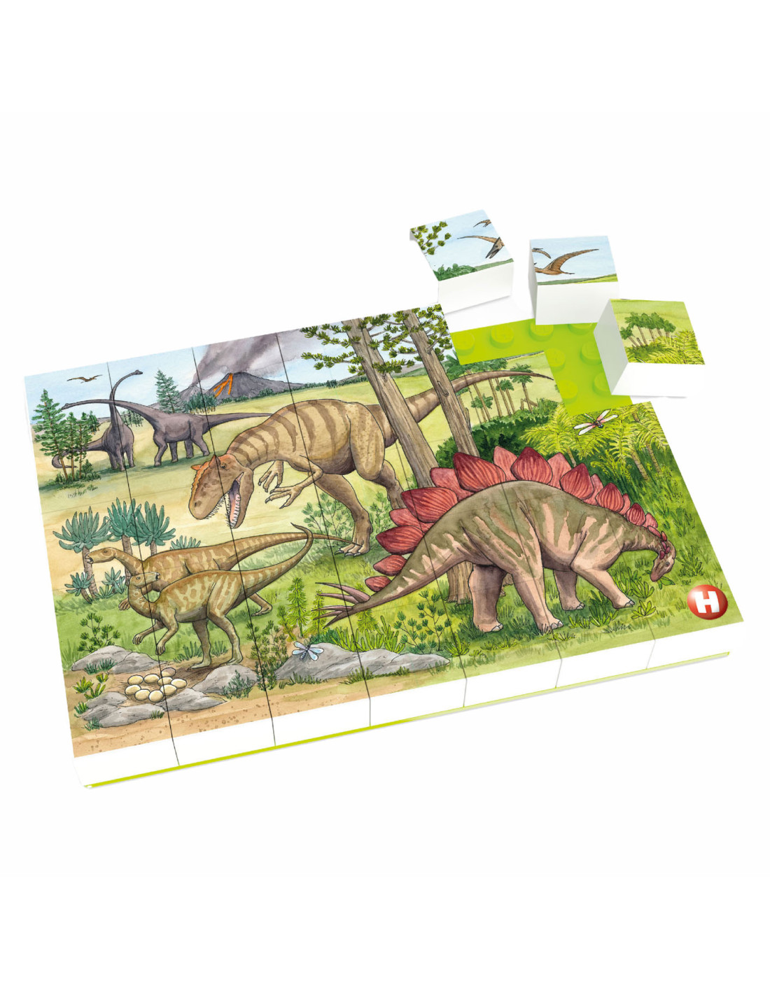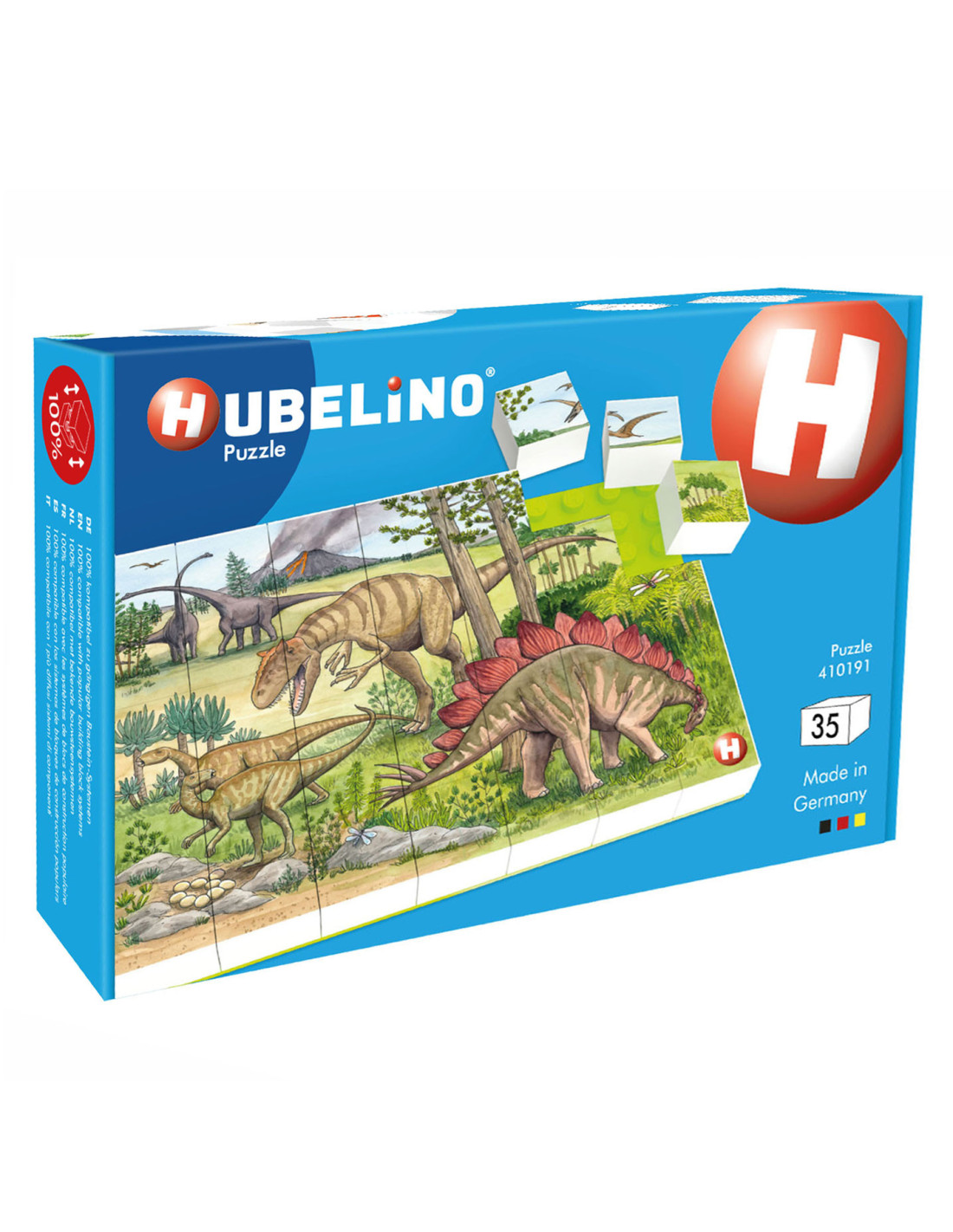 Ontdek de spannende wereld van dinosaurussen. Hoeveel verschillende dinosaurussen kun jij vinden? Hubelino-puzzels combineren twee favoriete activiteiten van kinderen: creatieve constructies met bouwstenen en kleurrijke puzzelmotieven. Het vertrouwde insteeksysteem van de stenen zorgt voor de nodige stabiliteit en het gevoel van de hoogwaardig bedrukte stenen is ideaal voor de handjes van kleine puzzelbeginners.