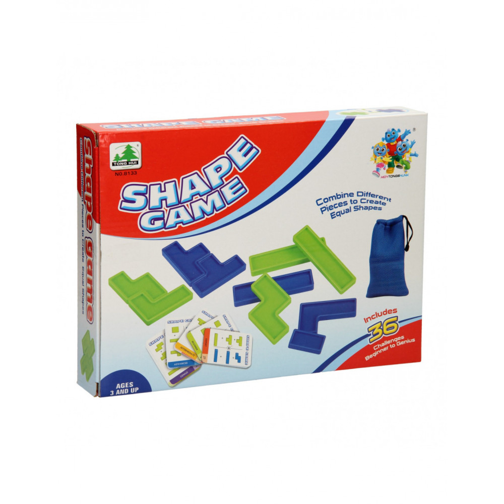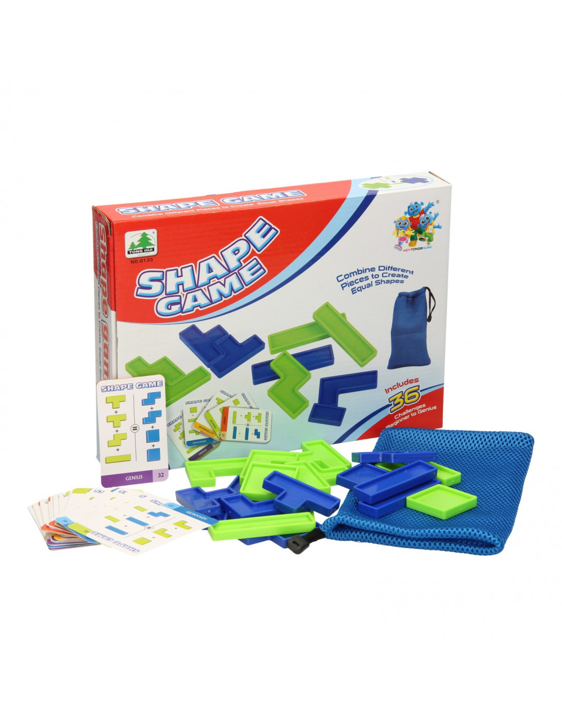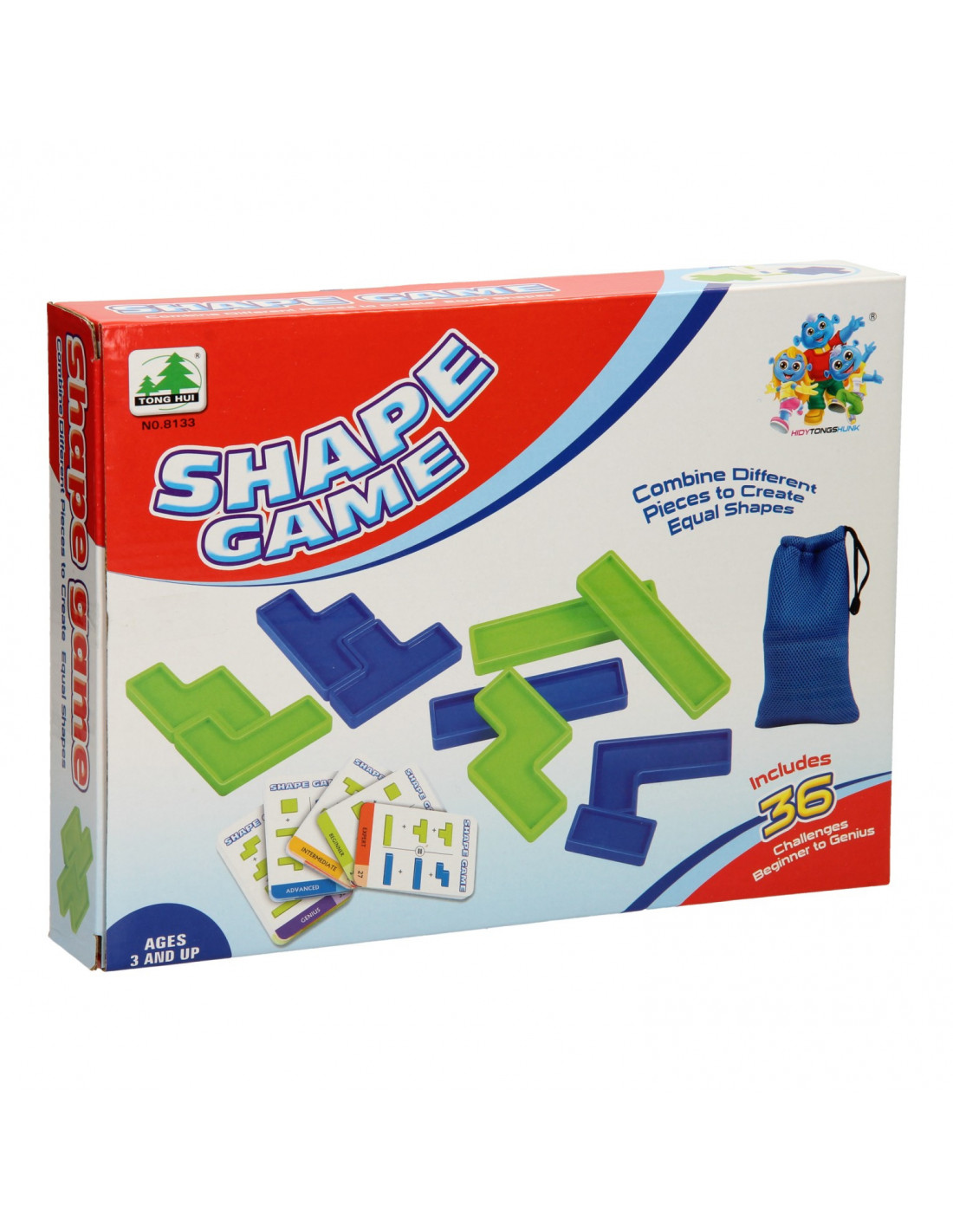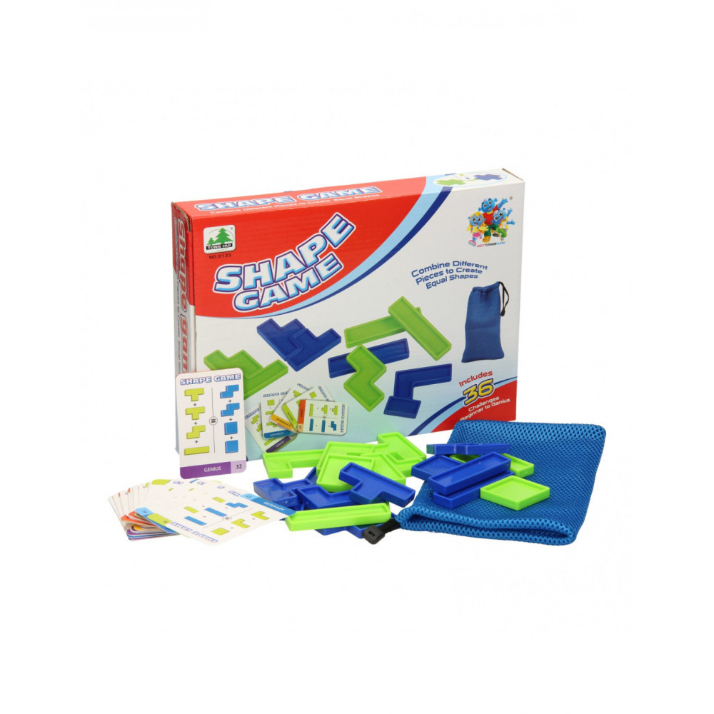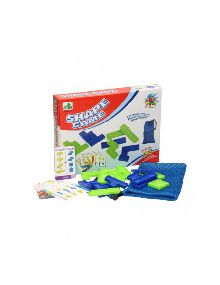 Leg uitdagende patronen met Vormen Puzzel Spel! In de doos zitten 10 blauwe puzzelstukken, 10 groene puzzelstukken, 36 kaarten met uitdagende opdrachten en oplossingen, die je in een handige opbergzak kunt bewaren. De uitdagingen van deze breinbreker verschillen in niveau. Zo kunnen zowel beginners als experts aan de slag met Het Vormen Puzzel Spel. Het logische denkspel stimuleert het ruimtelijk inzicht van kinderen vanaf 3 jaar.