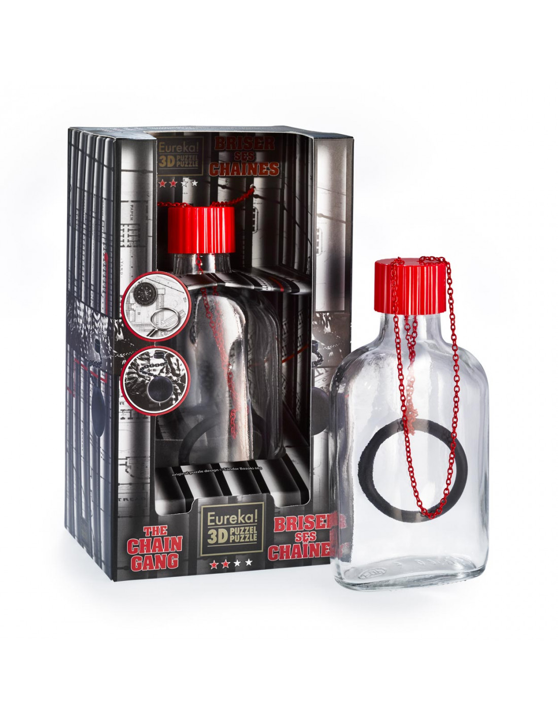 In The Chain Gang** Breinpuzzel is het de bedoeling dat je de zwarte ring van de rode ketting bevrijdt en deze vervolgens weer als gevangene bevestigt. Een Chain Gang was een groep gevangenen die samen geketend waren en zwaar werk moesten verrichten als een vorm van straf. In een poging tot ontsnapping was het essentieel om zichzelf eerst te bevrijden van de kettingen. Kan jij de truck vinden hoe je de rode ketting verlost van de zwarte ring terwijl alles in de fles blijft? Deze puzzel is ontworpen door Sándor Bozóki.