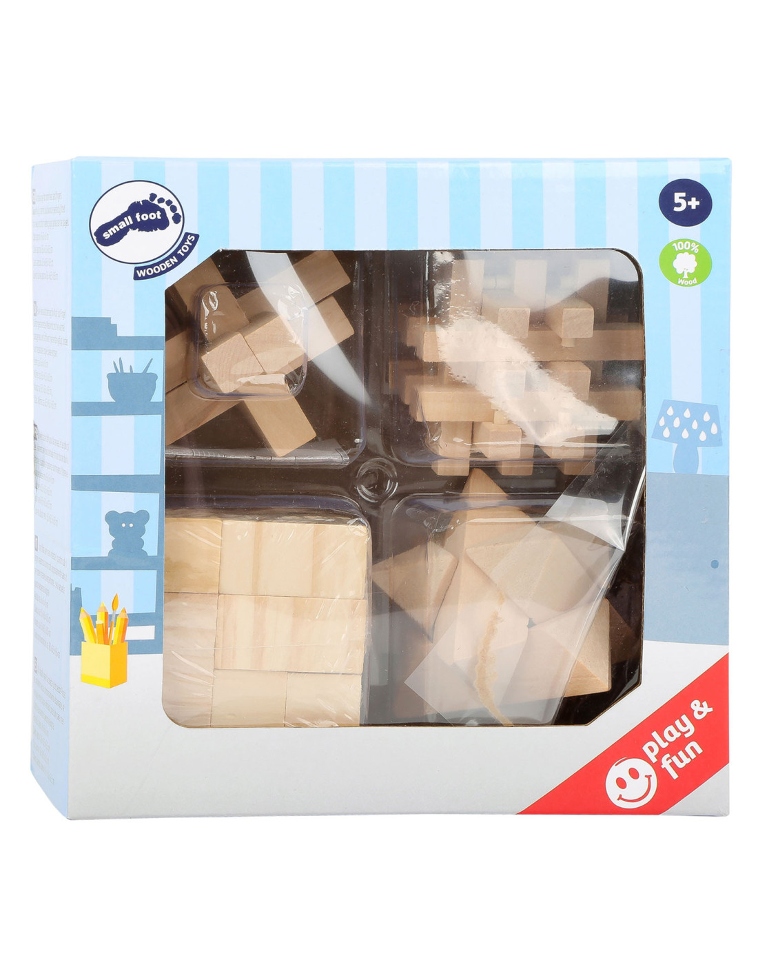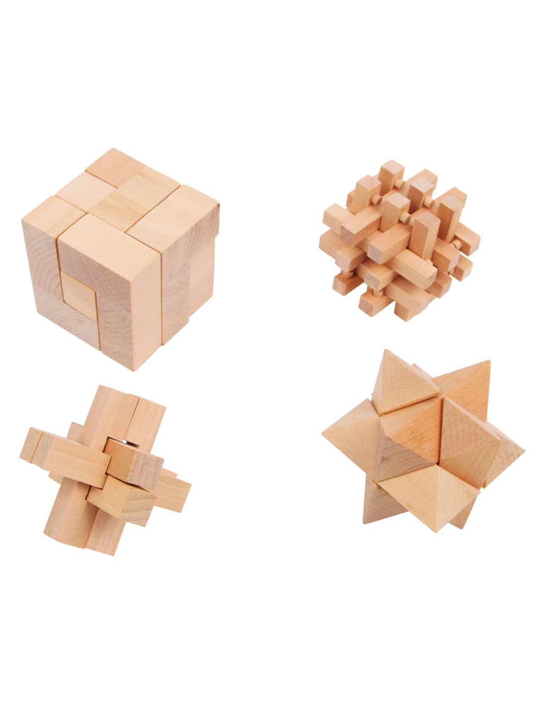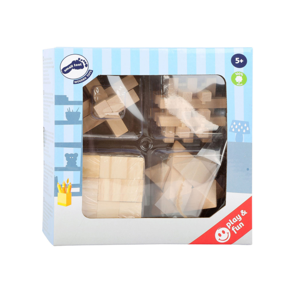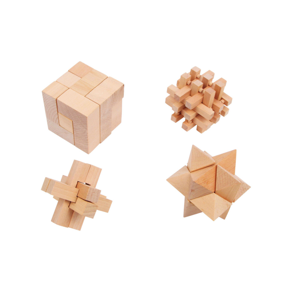 Een tricky situation! Deze vier houten behendigheidsspellen dagen zowel oude als jonge handen uit en laten de hoofden echt broeden op een oplossing. De verschillende vormen van natuurlijk hout moeten na demontage in hun oorspronkelijke vorm weer in elkaar worden gezet. Concentratie en behendigheid zijn hier vereist! Wie kan deze uitdaging het snelst aan?